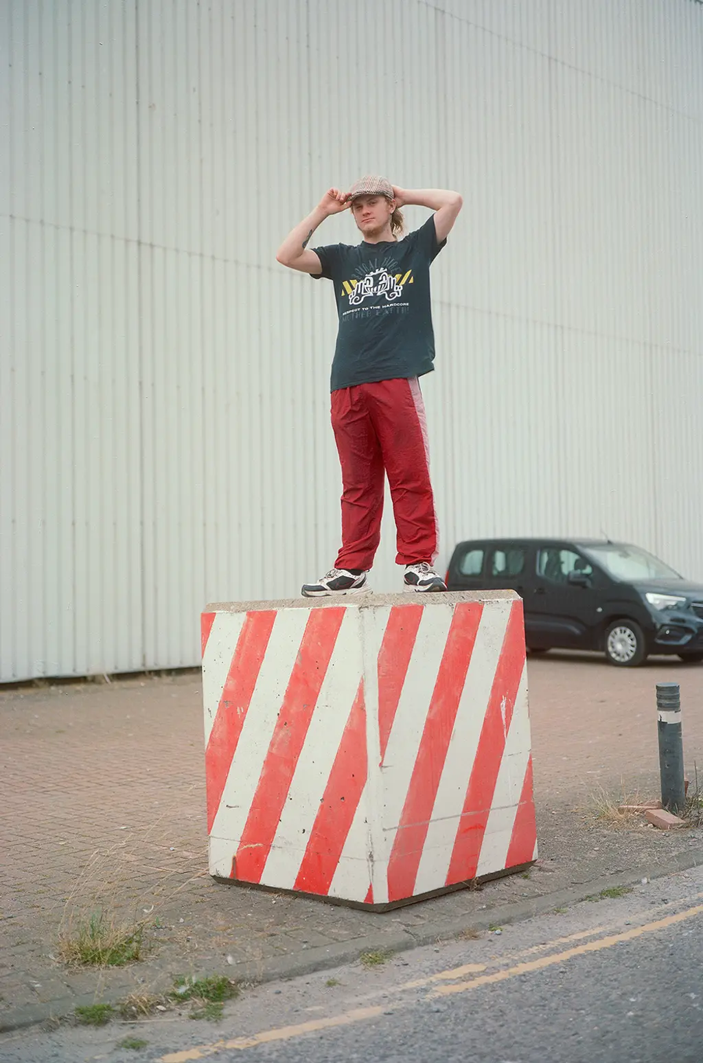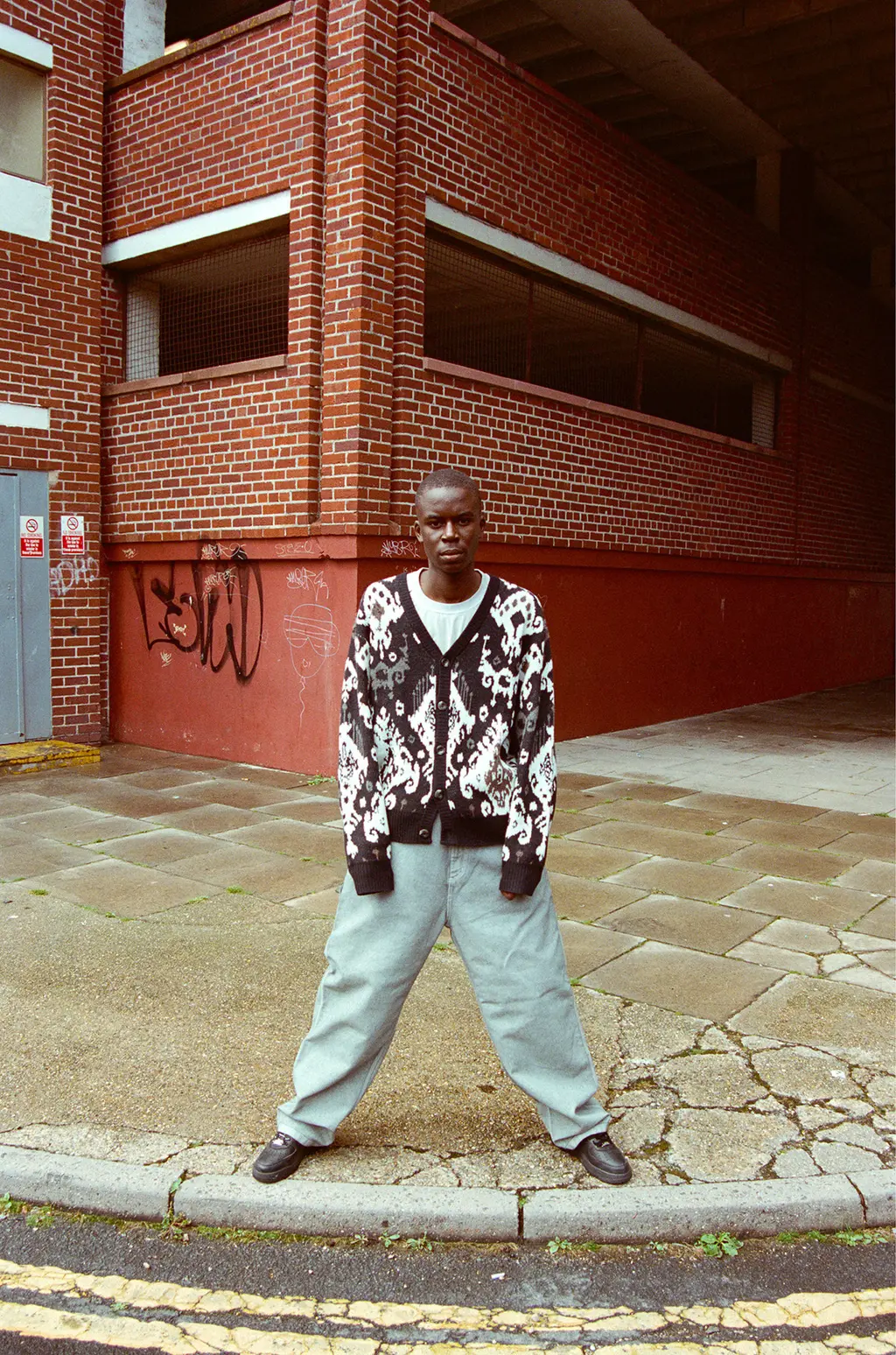 Chrys wears jumper and trousers CARHARTT WIP, T‑shirt CAV EMPT and shoes talent’s own