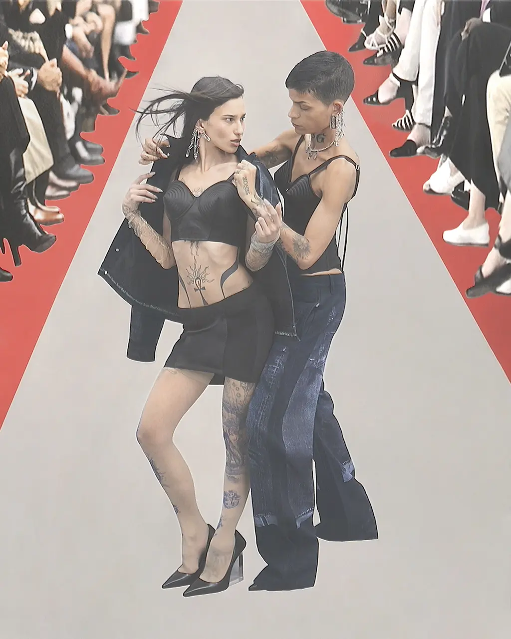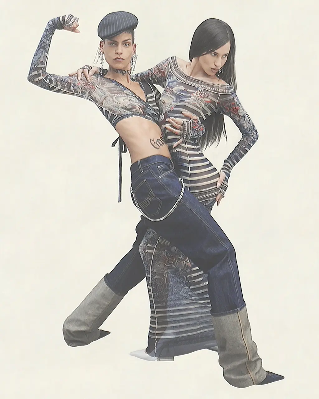 Modelled by OG Gaultier face Omahyra Mota and her partner in crime Mia Kidis, the range features classic Gaultier conical bralettes, corsets and trompe l’oeil bodycons in typically sexy Gaultier style.