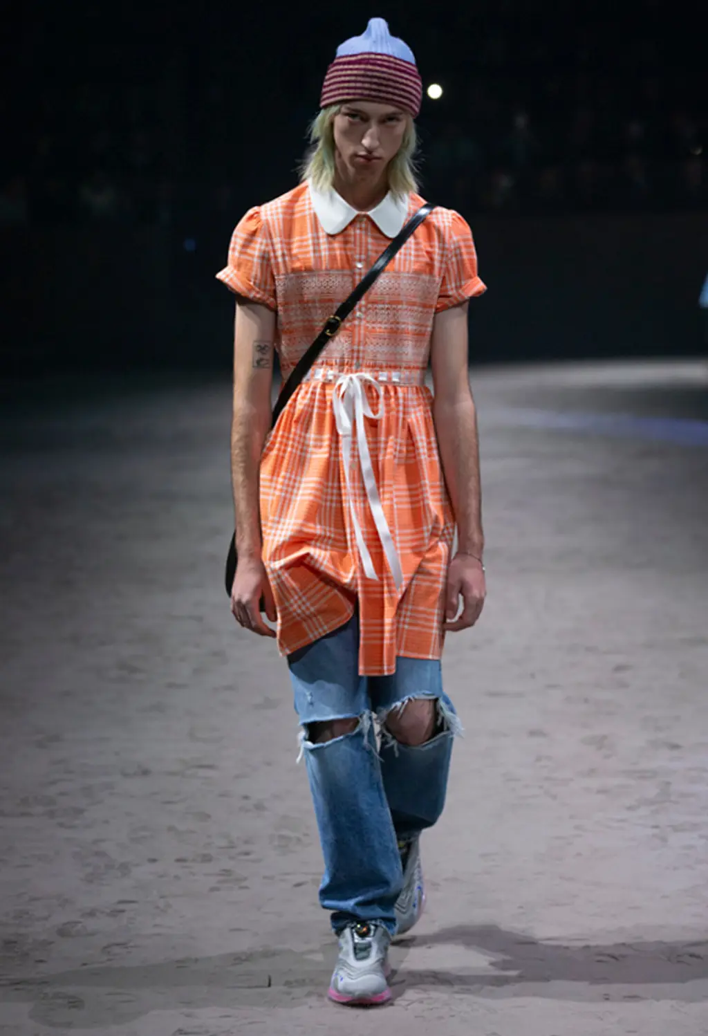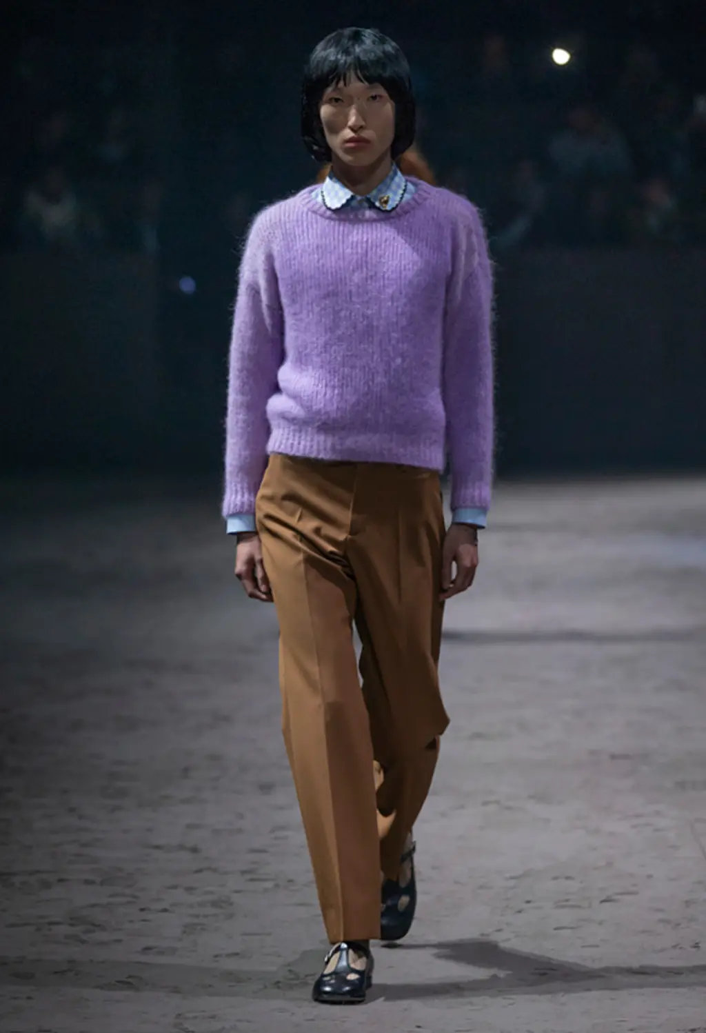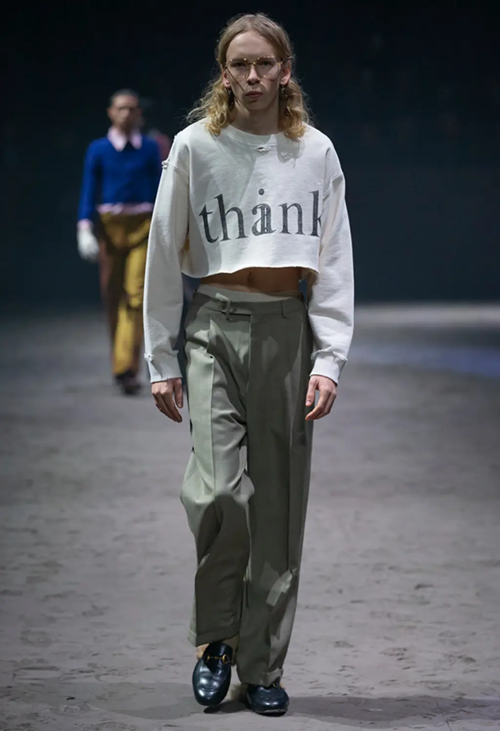 The “Gucci” on the show notes came on lined school paper in that needlessly-flourishy teen handwriting and fittingly, they were being distributed around schools throughout Milan, spreading the message that “toxic masculinity produces oppressors and victims at the same time”. Outside the show, teenagers crowded and sang songs as if queuing up for an old One Direction concert (they were probably hoping to catch a glimpse of Gucci-devotee Harry Styles). The show encouraged men to embrace femininity, vulnerability, tenderness, kindness and for “a baby man, able to do bold and playful somersaults, who wonders in amazement when the world becomes new“.