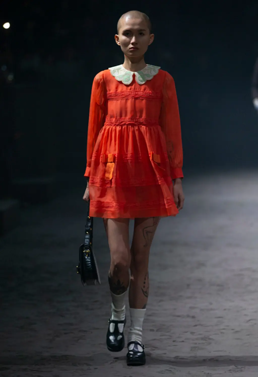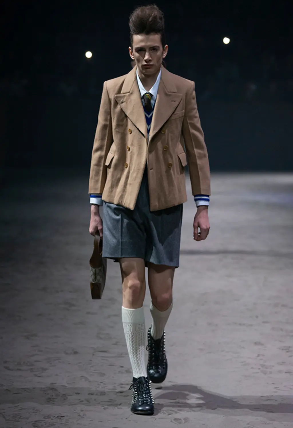 They fucked with gender, they played on childish nostalgia and they embraced the alt-icons who inspired Creative Director Alessandro Michele growing up (Nirvana, David Bowie and Marilyn Manson, whose cover of the Eurythmics Sweet Dreams was part of the soundtrack). There were baby-doll dresses, neat school short suits and Cobain-esque big shaggy coats.