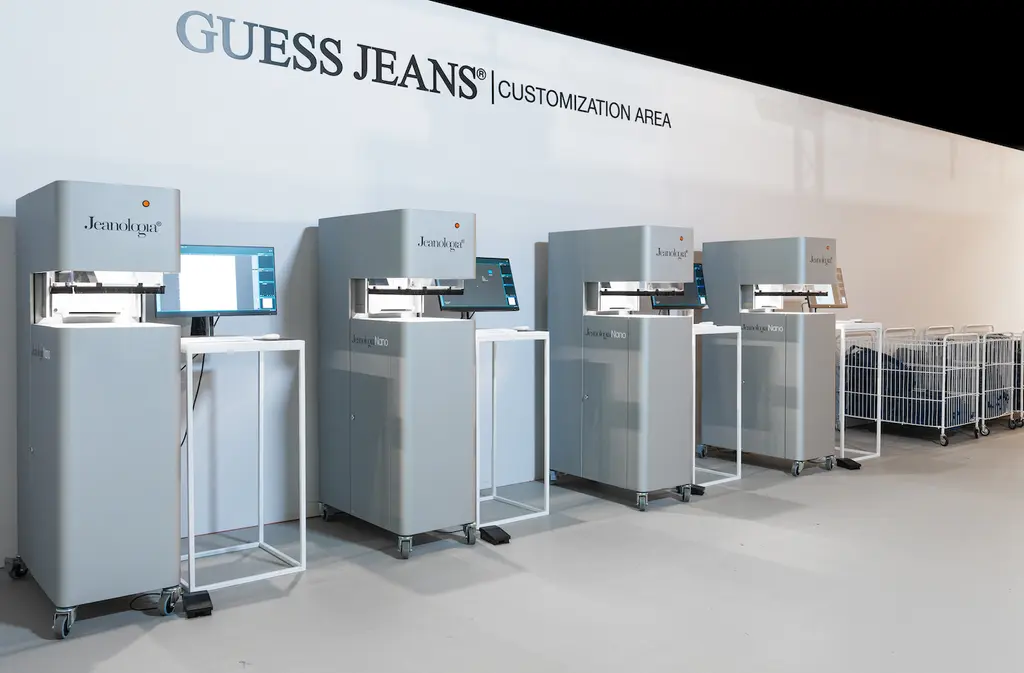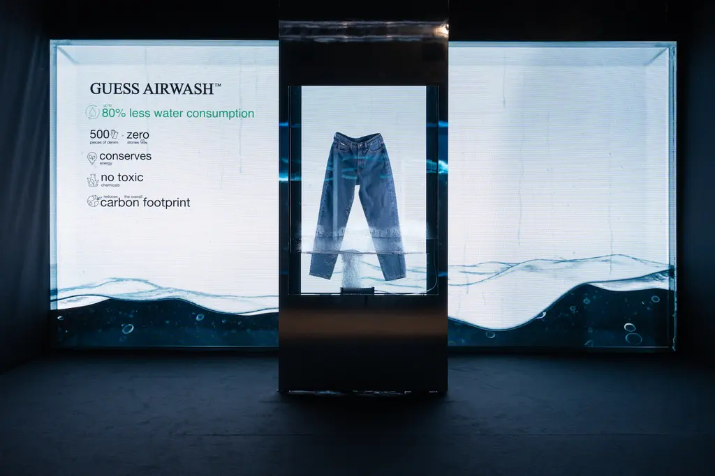 But, as the exhibition’s title suggests, this wasn’t really about the past. To take its classic stonewash jeans, popularised in 1981, into the future, Guess Jeans has developed Guess Airwash™, a new eco-conscious technology that provides a more sustainable approach to getting “that vintage look”. To produce this faded, worn appearance, Guess’ new approach uses light and air, eschewing the traditional technique of using coarse pumice stones and, in turn, significantly reducing water usage. We saw the process first-hand and, yeah, it’s pretty impressive.