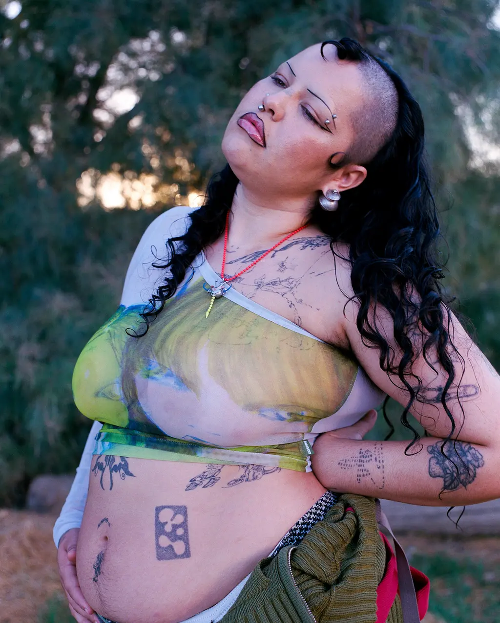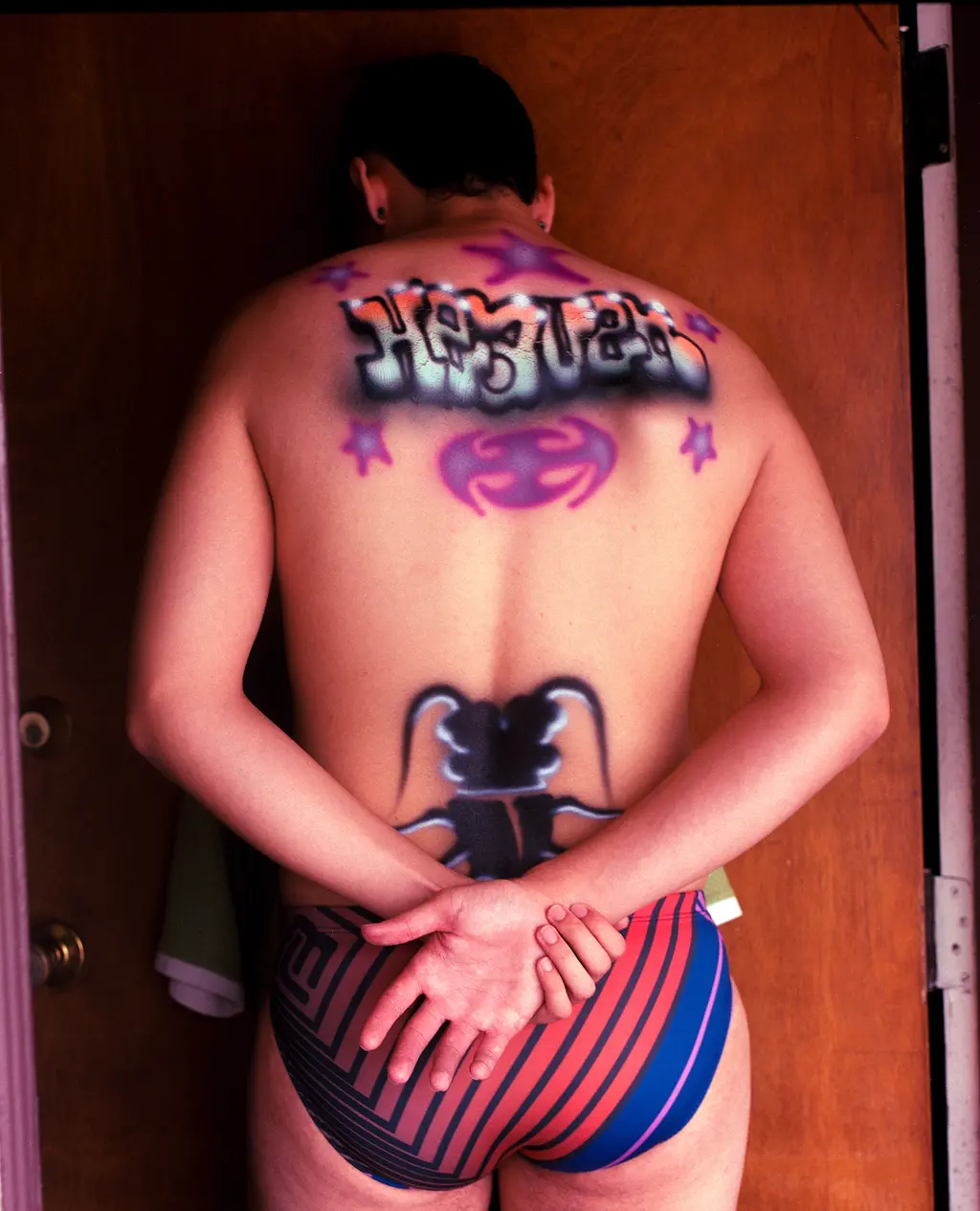 Jester’s latest zine Heaven After Dark is a personal take on the Marc Jacobs offshoot brand in all its glory; a diaristic deep dive exploring fear, intimacy and desire, in a book encased in laddered fabric. Inside, amongst Jester’s unvarnished photography, sits the work of other creatives cherry-picked from their network: ceramicist Diana Yesenia Alvarado, whose pieces are currently on show in LA’s Jeffery Deitch gallery; New York-based tattoo artist Keegan Dakkar Lomanto, who fittingly inked “a giant jester” onto Jester’s chest for their 18th birthday; airbrush artist Sob Story; multimedia artist Chris Lloyd; and Japanese artist and sculptor ancco.