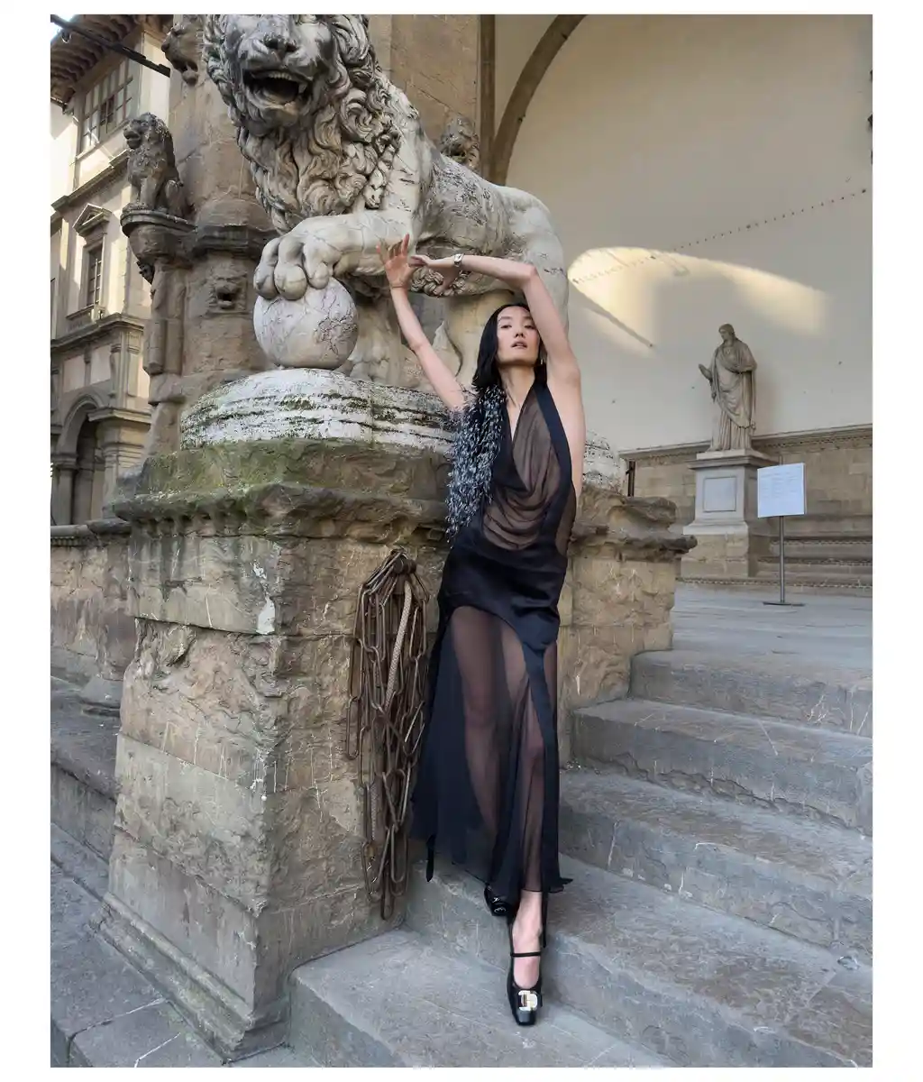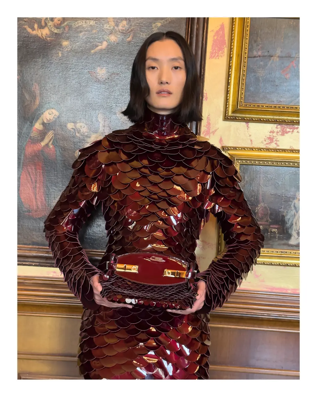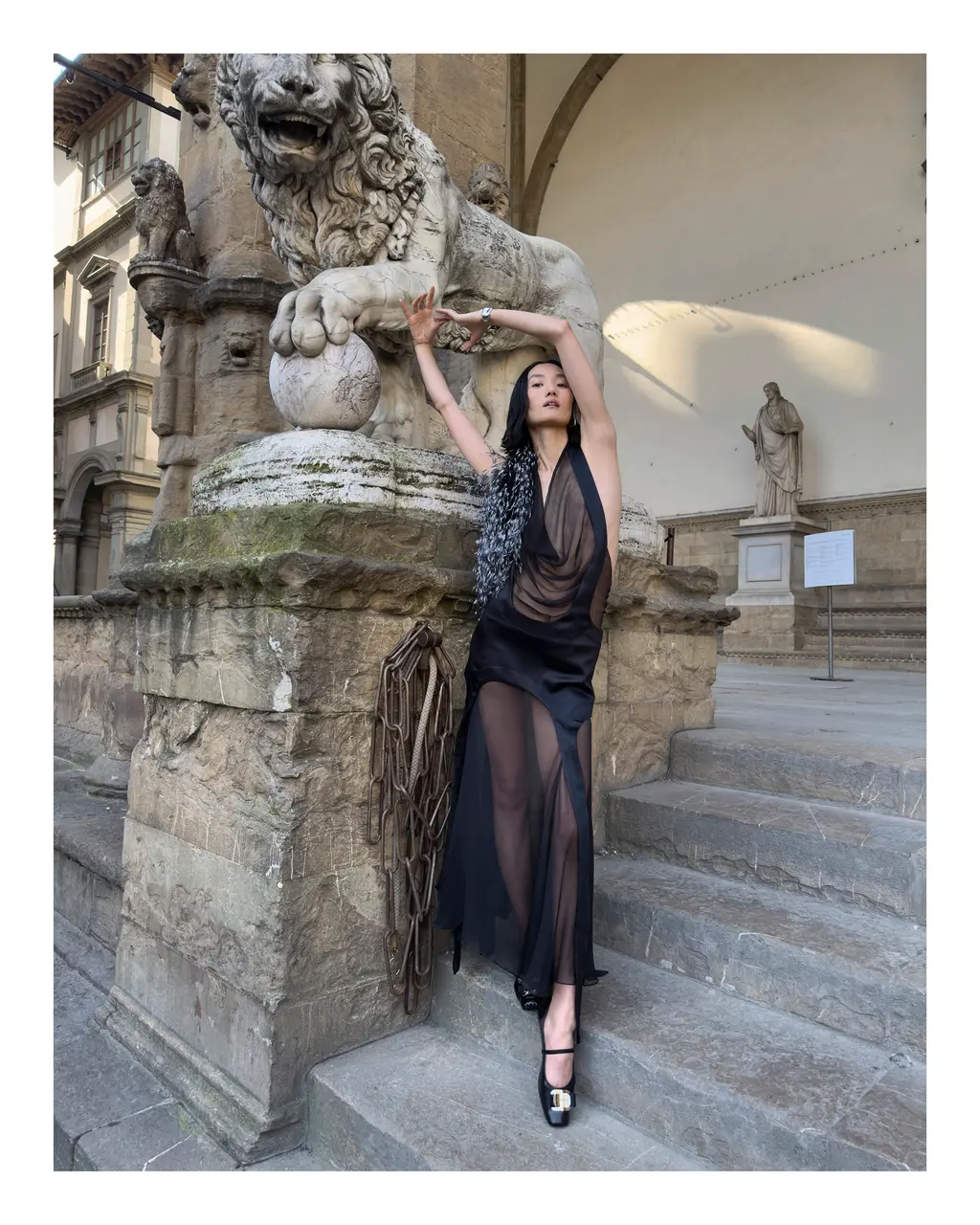 Maximilian Davis x Juergen Teller? That’s a sure way to get tongues wagging. Davis staged his latest campaign in Florence, Italy, the home of the brand. Using mundane everyday spots as his catwalk, full looks were shot against the plain brick walls of cafes and shops. Davis harked back to the beginnings of the brand by visiting the Palazzo Spini Feroni, the 13th-century building that Salvatore Ferragamo transformed into the brand’s headquarters in the 1930s. A fish scale-like dress shines against renaissance paintings, ballet pumps with gold buckles glimmer in the sunlight and feather heels get their moment in the spotlight courtesy of Teller’s stripped-back style.