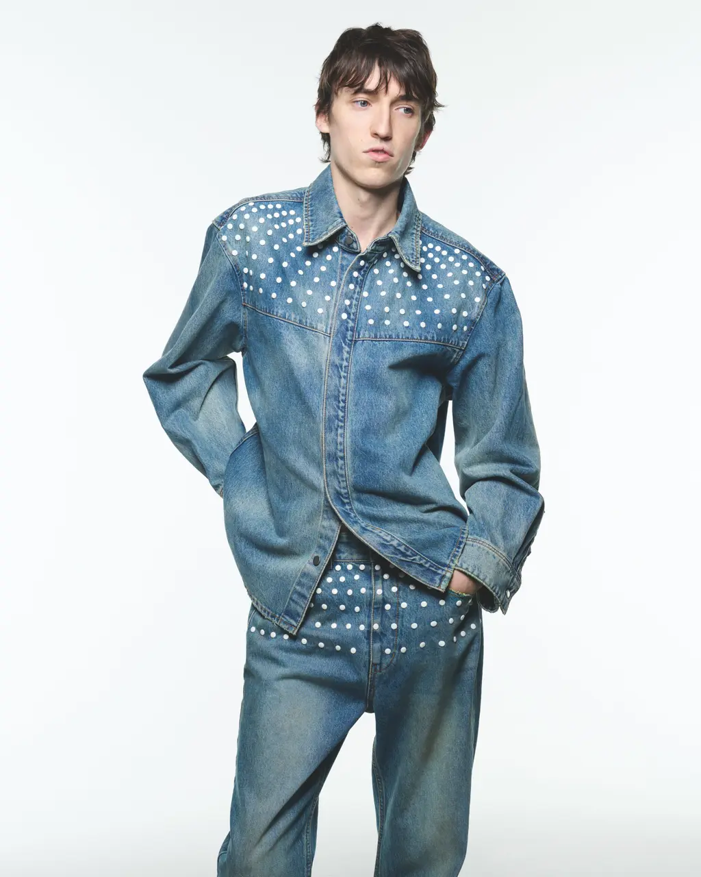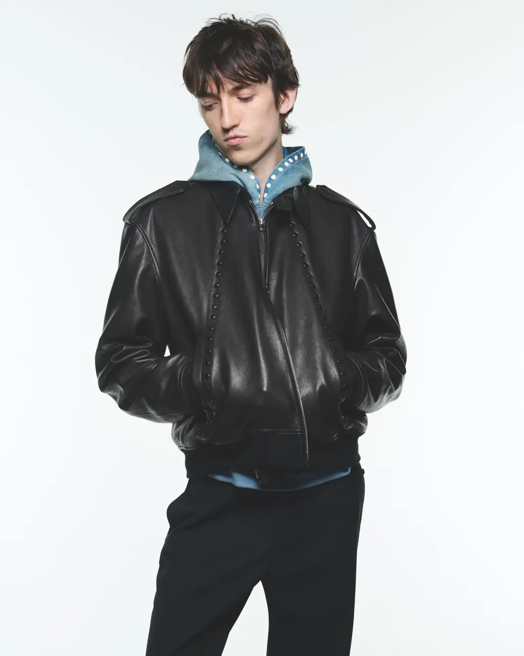 Stefan Cooke continues to raise the bar for young designers in fashion. When the design duo – Stefan Cooke and Jake Burt – aren’t working on reimagining upcycled Mulberry bags, they’re designing garments that Kendrick Lamar and Emma Corrin flock to. Now, the pair are back with a collab with Seoul brand Solid Homme that’ll be on the backs of fashion editors outside crowded East London pubs soon. Cooke and Burt jammed to tracks Wooden Box by Factory Floor, These New Puritans’ Drum Courts and Redlights by Salem while fashioning the collection, and plucked inspiration from East Coast states New York and Maine. T‑shirts have been reworked to replicate American football jerseys, leather jackets in black and ochre colourways are awash with studs, and there’s even some relaxed denim thrown in for good measure. Phwoar.