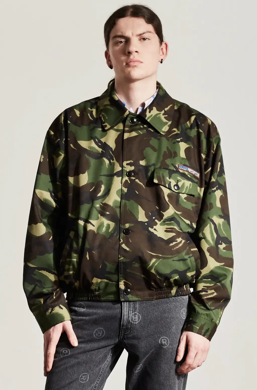 Camo has long been revitalised on the runway, with designers often reinventing and remixing the print, proving its longevity as a bonafide symbol of style. In 2001, Raf Simons presented the Riot Riot Riot! jacket, a padded standard issue army bomber with added Bowie and Bauhaus patches. In the same collection, Simons’ boys wore military coats and some had their faces obscured and hoodies pulled over their eyes as they stomped through an industrial warehouse – a proper rage against the machine. The jacket has become one of Simons’ most covetable archive pieces and in 2018, one sold for a hefty $47k. That same season, John Galliano subverted camo by draping it on an evening gown and Rei Kawakubo later roughed up camo on some textural suits in 2016, which is perhaps the only time camo formalwear has been acceptable.