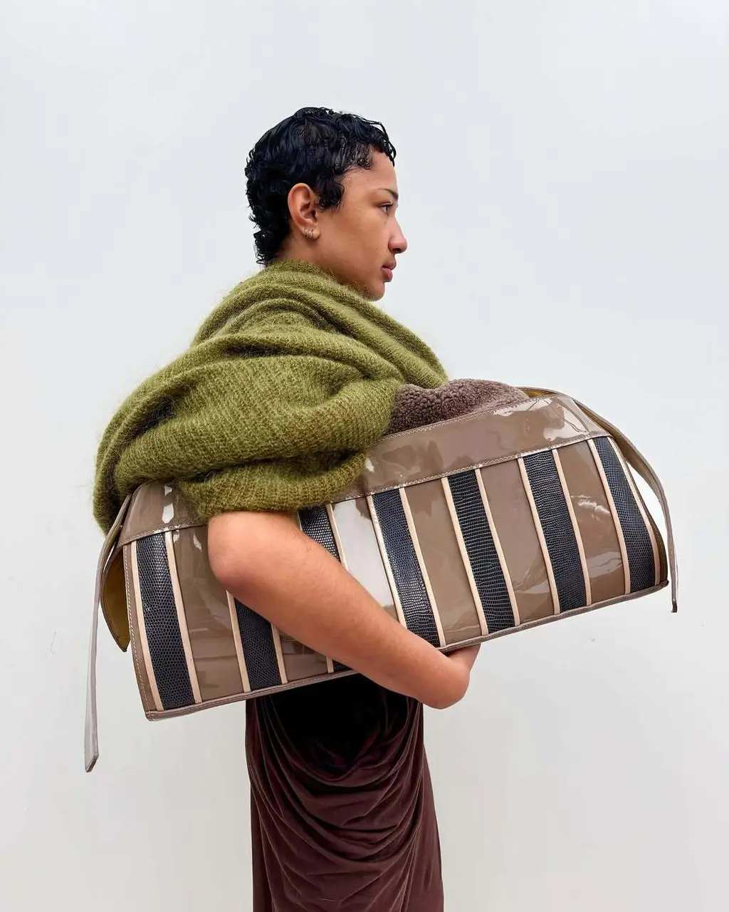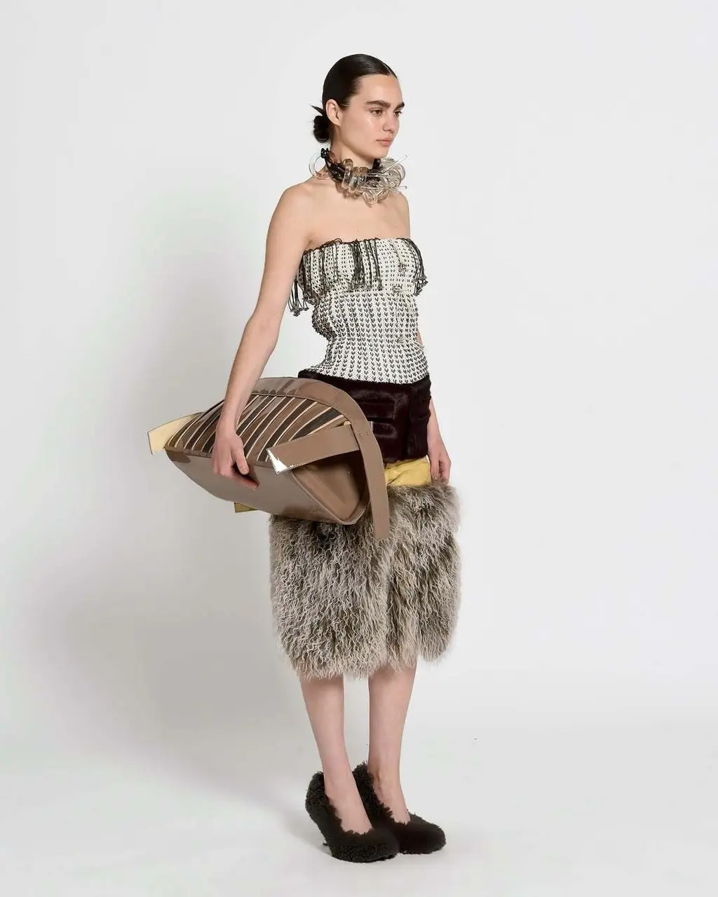 I am a leather collector (or hoarder). While searching through my stock of materials for inspiration, I was already working on a piece for the collection that involved leather cords, so I wanted to create a version of that, but entirely from leather. I experimented with various leathers, including thin perforated suede and thicker varieties with larger holes. I also tried perforated fur and shearling.