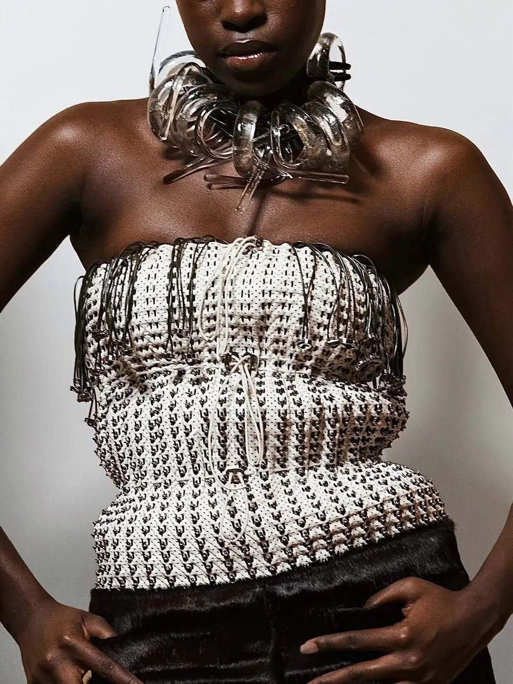 Tell me about the process of creating the perforated lamb leather bustier and the metal bead/​leather cord necklace.