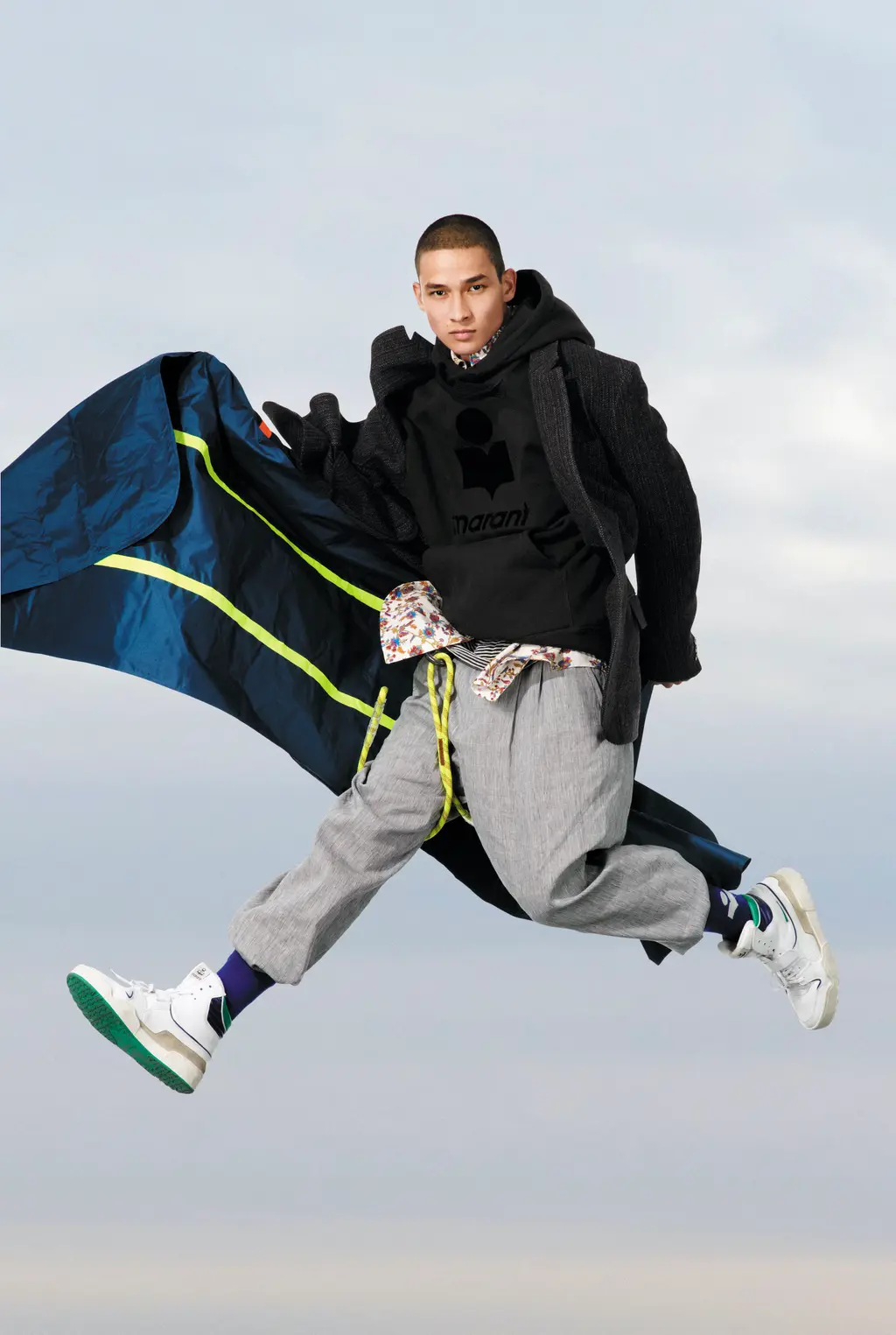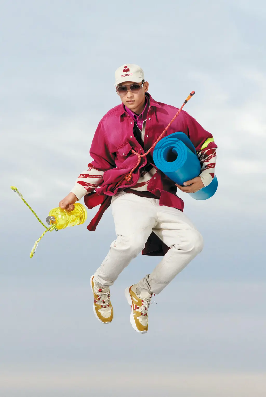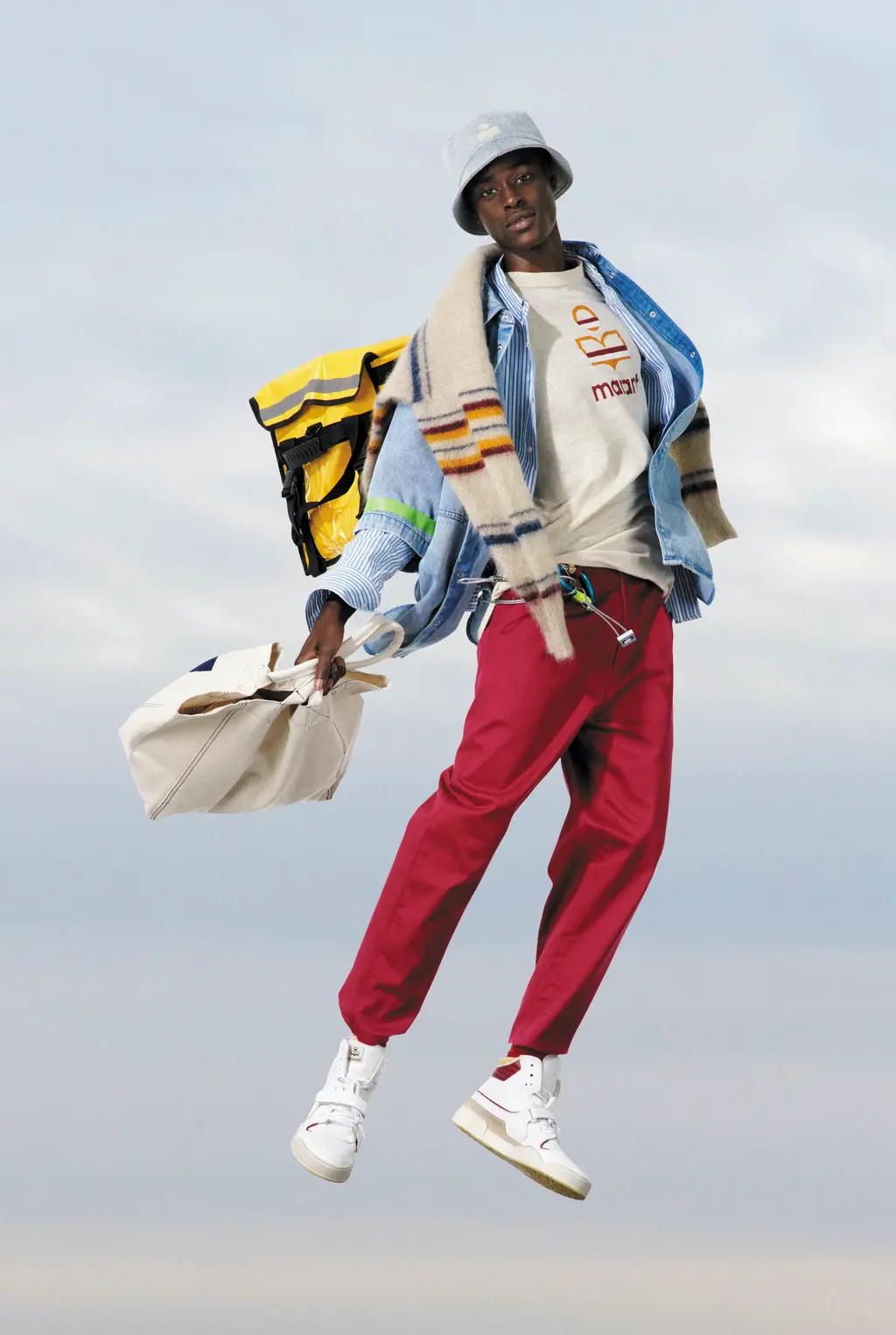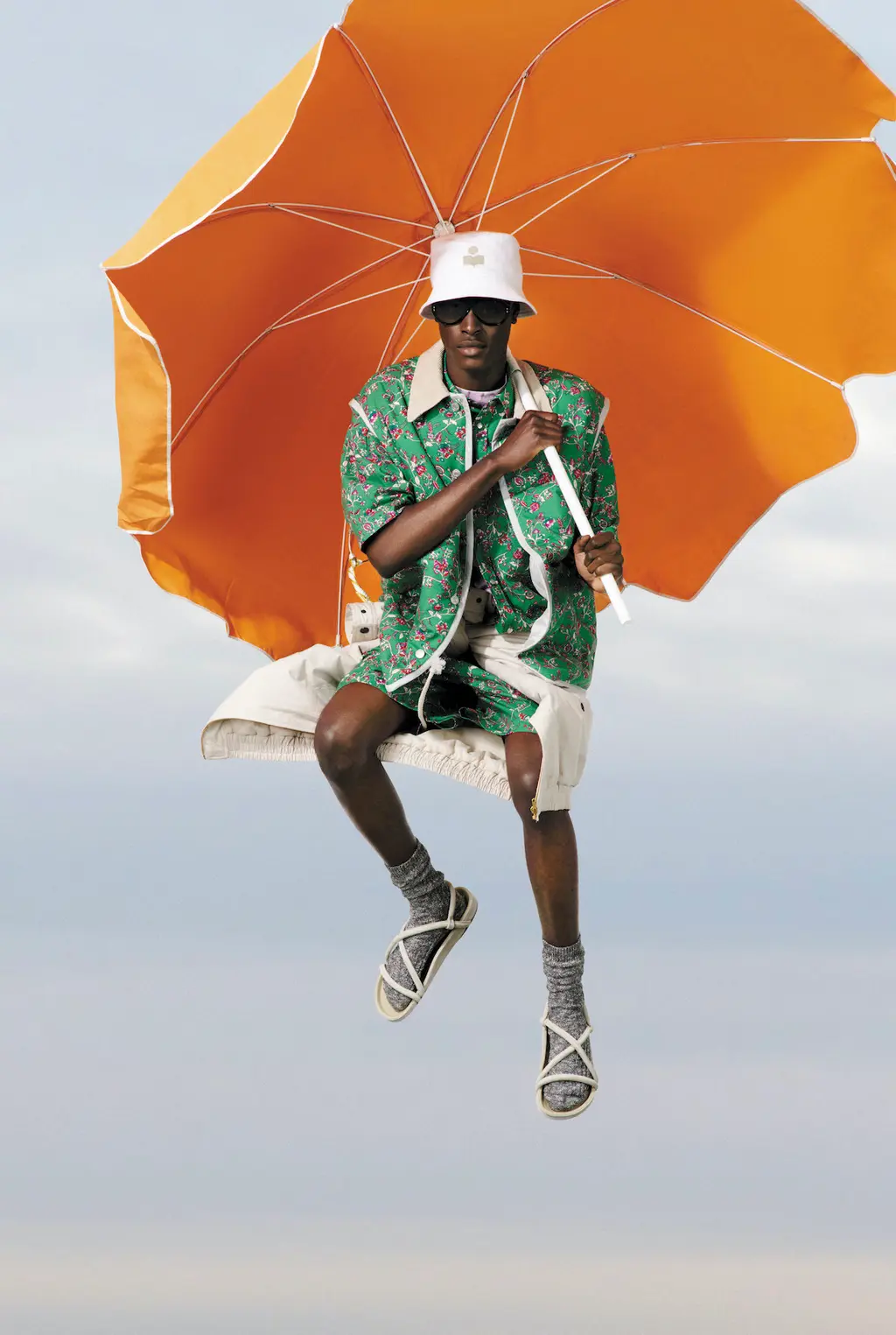 These playful and utilitarian garments form a pressing invitation to discover the world around us. Each outfit is completed with comfy, sporty trainers, while Marant even managed to introduce a socks-and-sliders combination that feels stylish – and most of all, appropriate, for spending time in the great outdoors.