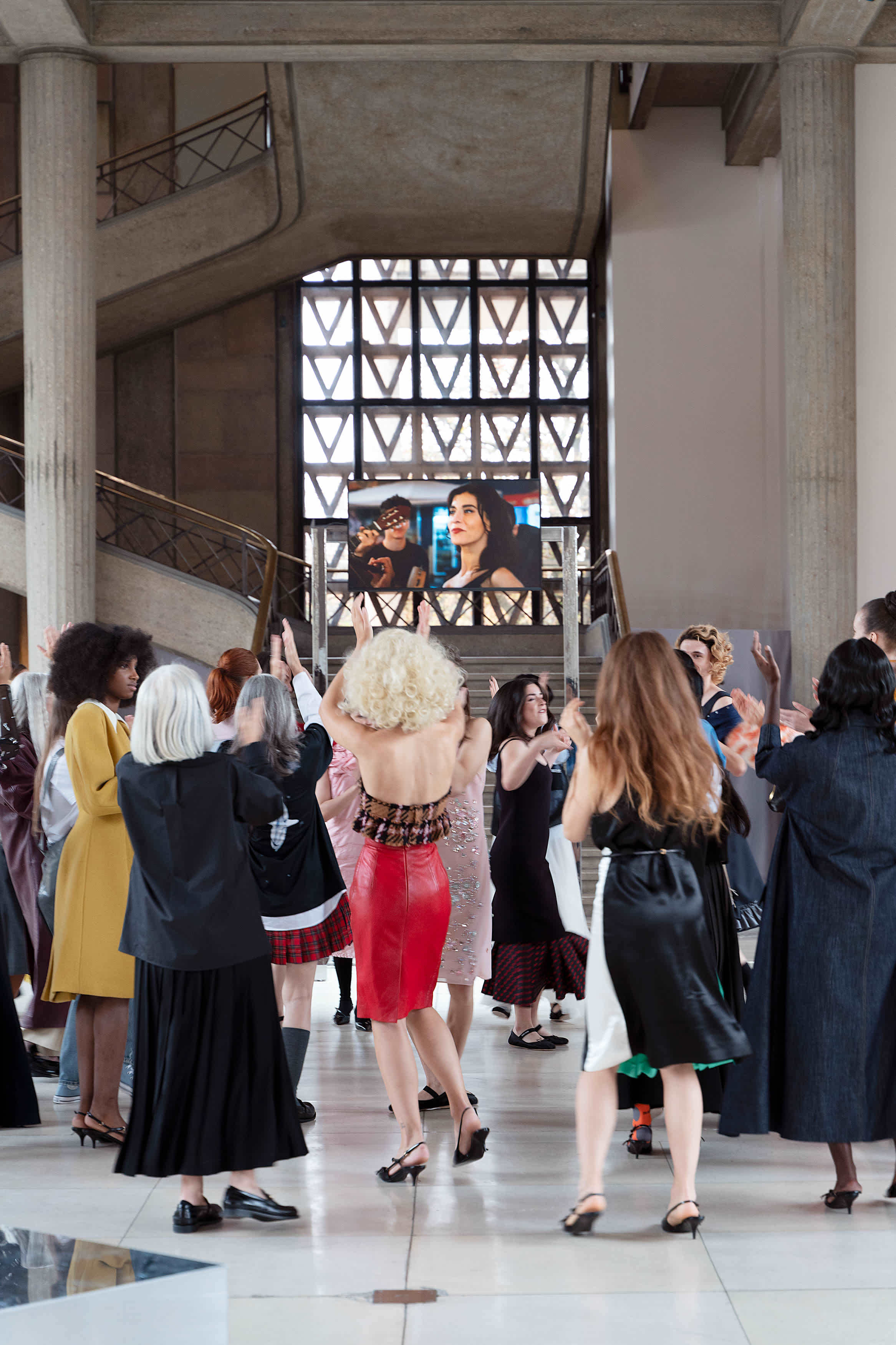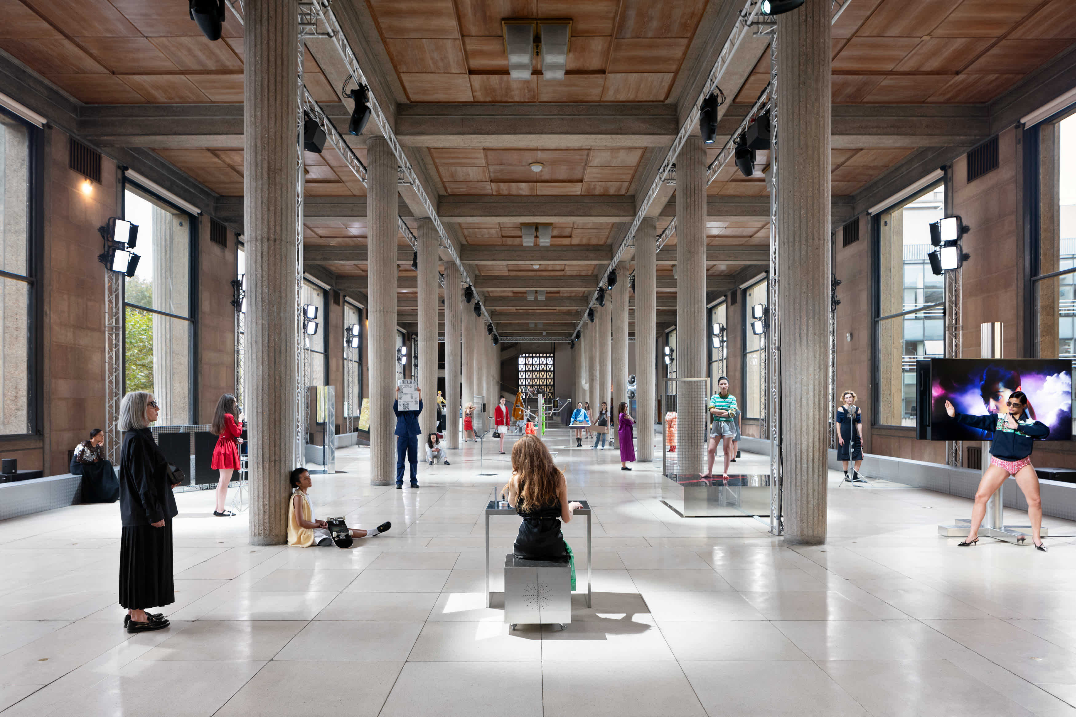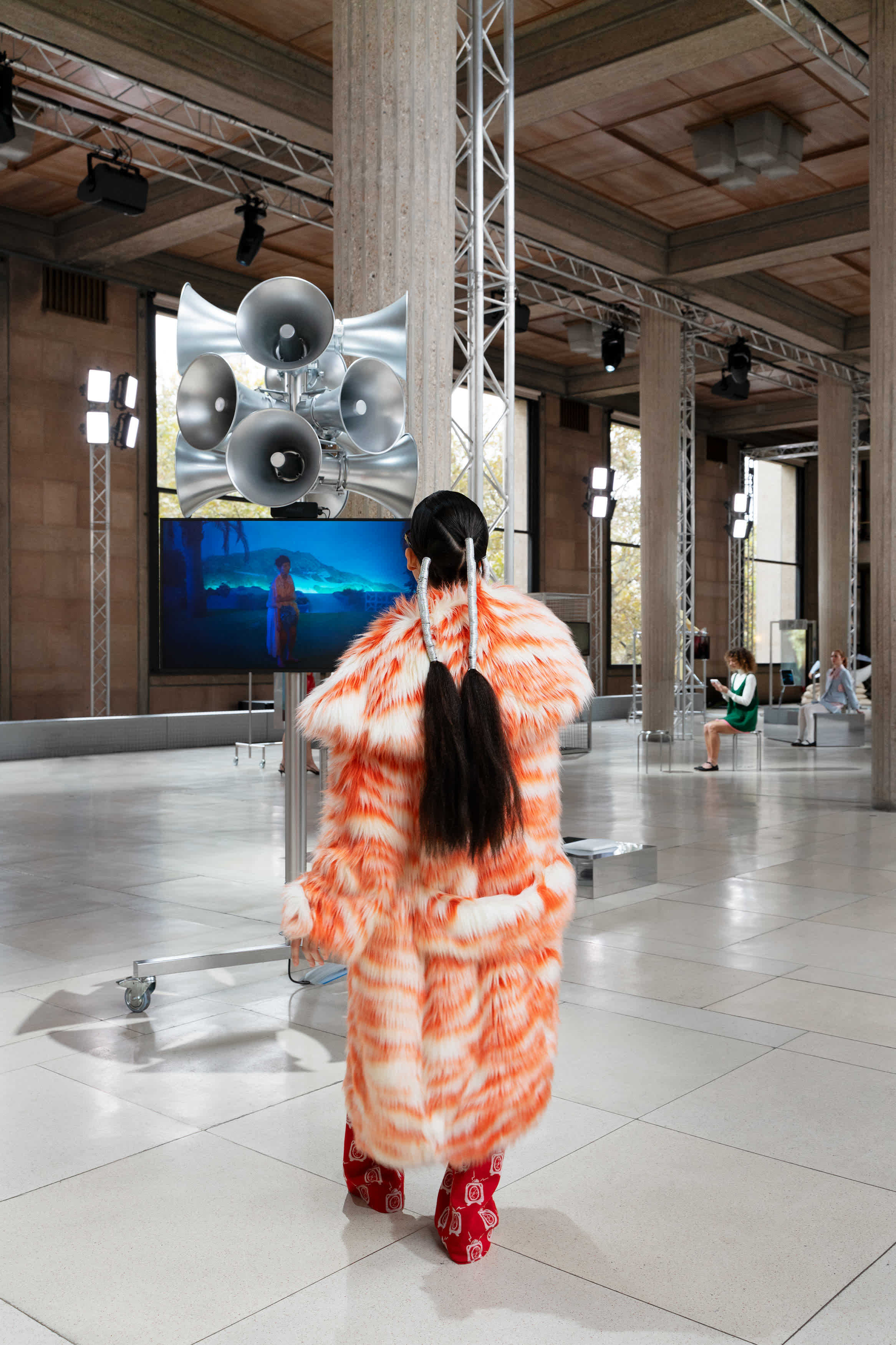 Miu Miu has long been invested in women and the arts. Not long ago, the brand had a queue snaking down the cobbled streets of Covent Garden to snap up free (!) era-defining books, all in the name of its Summer Reads book club. It feels like a logical next step, then, for Mrs. Prada to get involved in the art world, too. This week, Miu Miu secured a space inside Palais d’lena in Paris’ 16th arrondissement to execute the latest project with London-based artist Goshka Macuga, “Tales and Tellers”, at this year’s prestigious Art Basel (the lucrative art fair where people splash serious cash on some one-of-one art pieces).