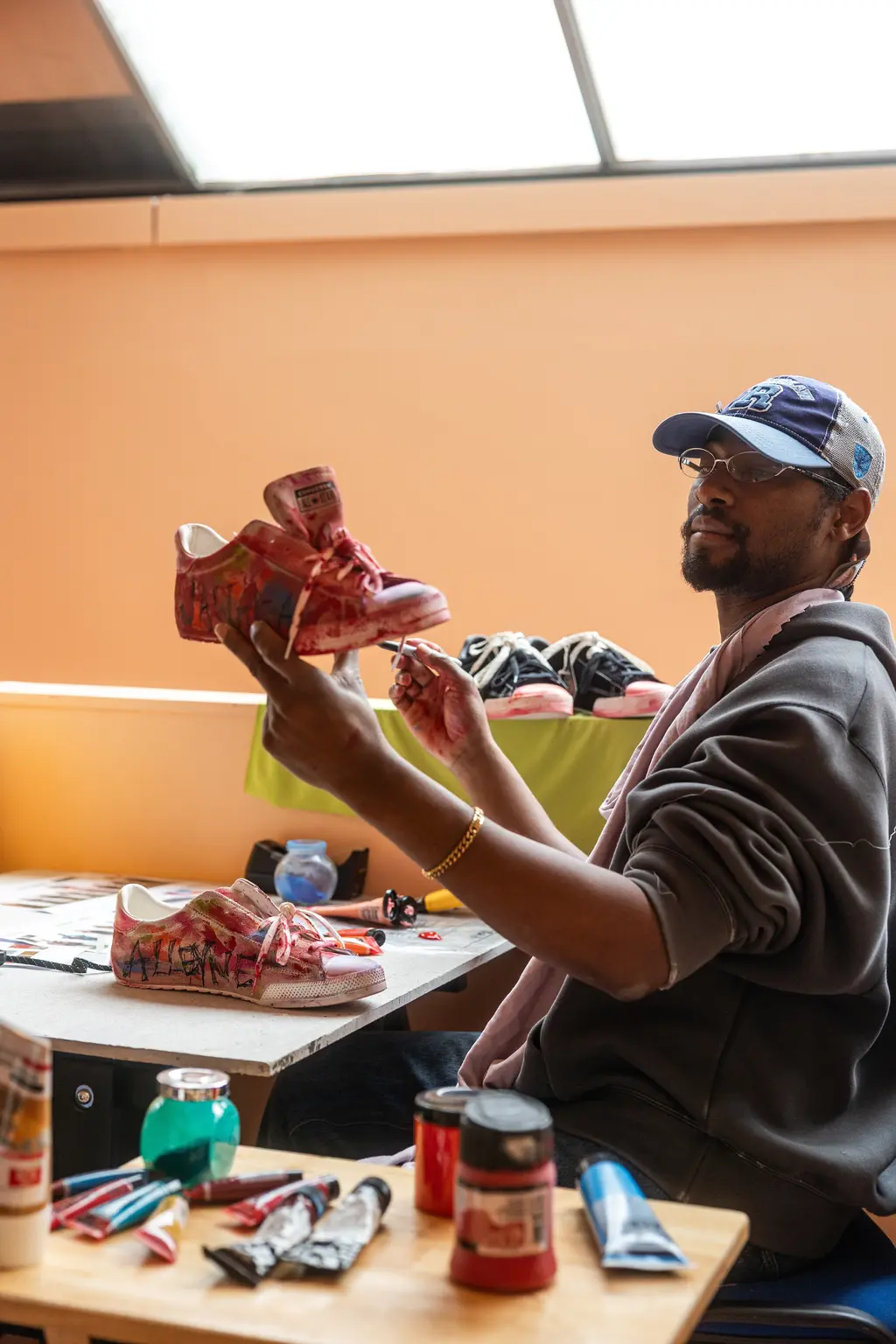 As we spoke, Alleyne pointed me to a few pairs in particular. A pair covered in purple fringed jersey peeked out from under a bench. And again, across the room, a pair artfully decorated in electric fuchsia, orange and red paint.
