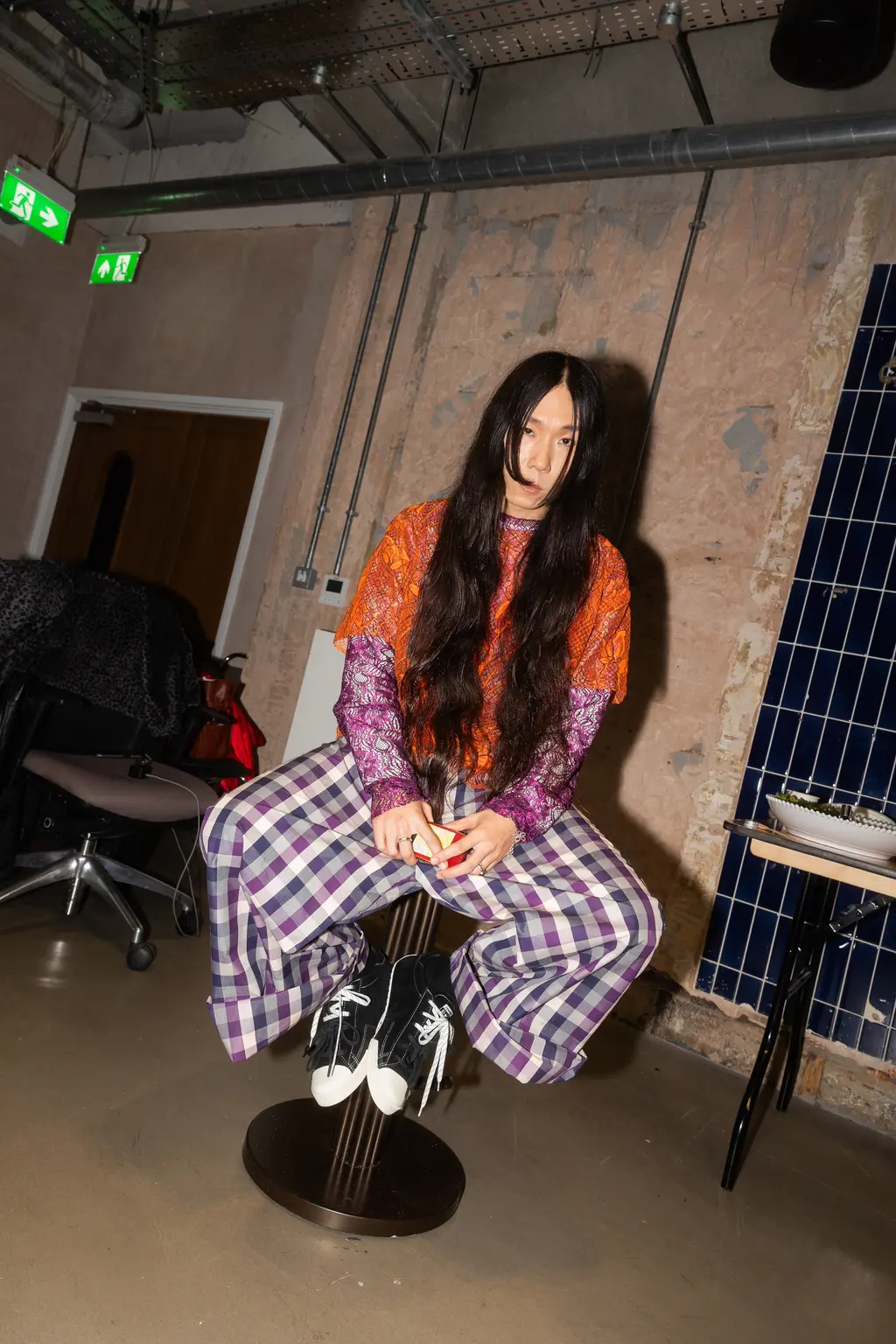 Hobbling inside the Bethnal Green gallery space, the magical disarray of Alleyne’s latest collection was just enough to take my mind off the pain. This season, the London-based, Jamaican-Caymanian designer was thinking about the future of London’s tested nightlife and how to dress for it. Inspired by that, his signature deconstructed garments – coloured in zingy neons – were splayed around the space, recalling a chicer version of my own clothes-strewn bedroom after prepping for a night out.