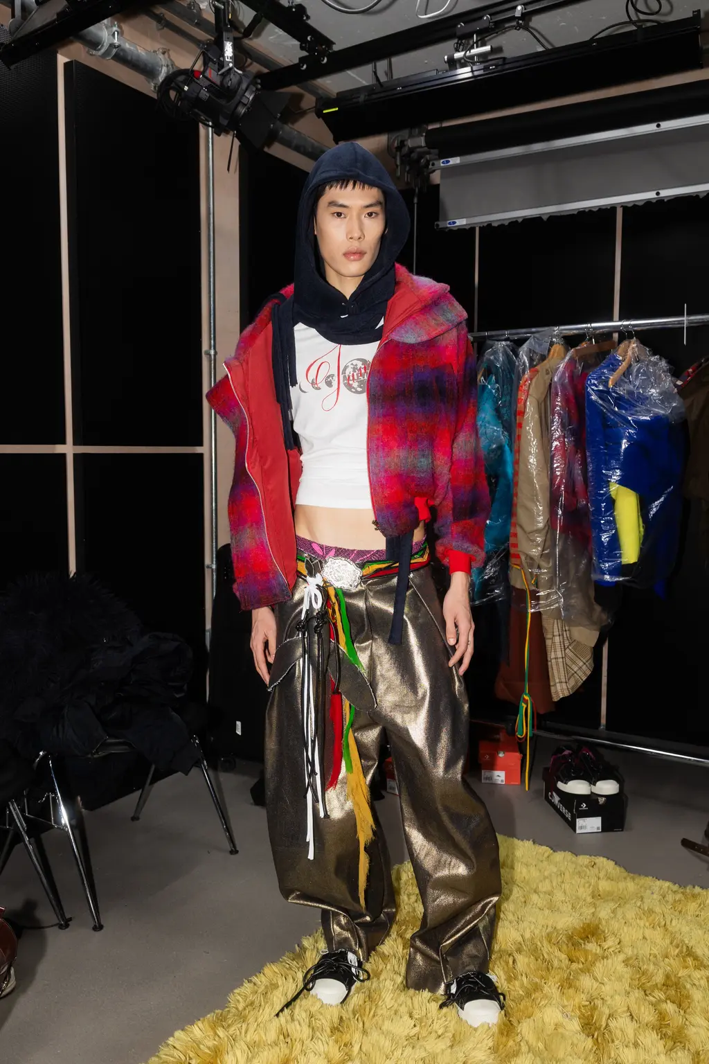The space was jam-packed with Alleyne’s community, from fellow Fashion East grads and artist Rhea Dillon to Off-White’s creative director Ib Kamara, photographer Campbell Addy, and Central Saint Martins’ MA Fashion course leader Fabio Piras. And there, amid the throngs of people, was Alleyne, wearing a pair of sexy gold trousers from this collection. “Considering that clubs are closing – places that we usually go out to find community, dress up, explore identity, have fun, where fashion’s actually in practice – I was thinking what the new version of that is gonna be,” he explained.