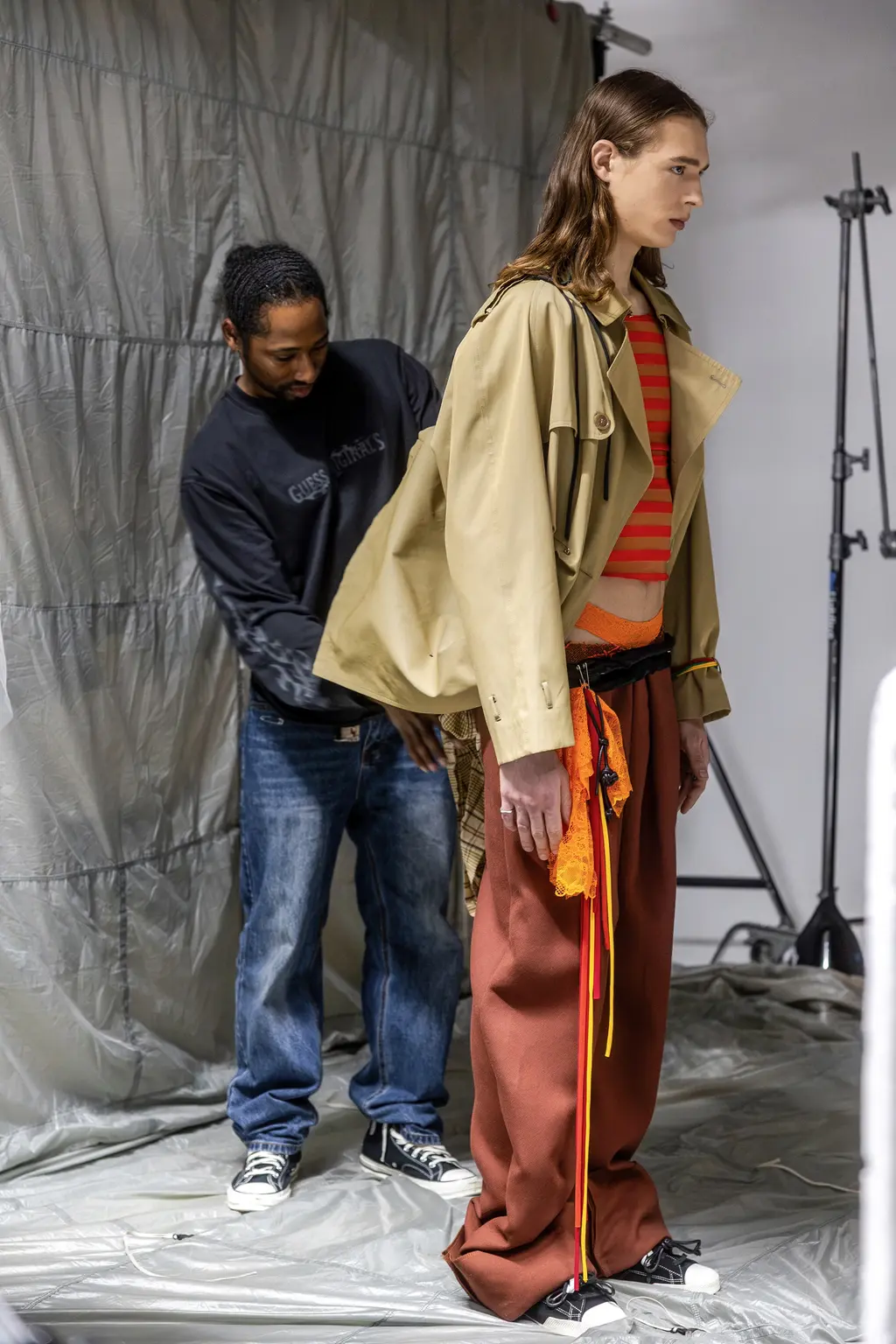 It was a fitting theme for Alleyne, whose SS26 collection took inspiration from the bittersweet post-party comedown, known as “tabanca” in Trinbagonian dialect. That show, much like this presentation, saw Alleyne celebrating his heritage through sensual draping and ebullient colours, all culminating in festively fringed and safety-pinned garments made to dance the night away in.