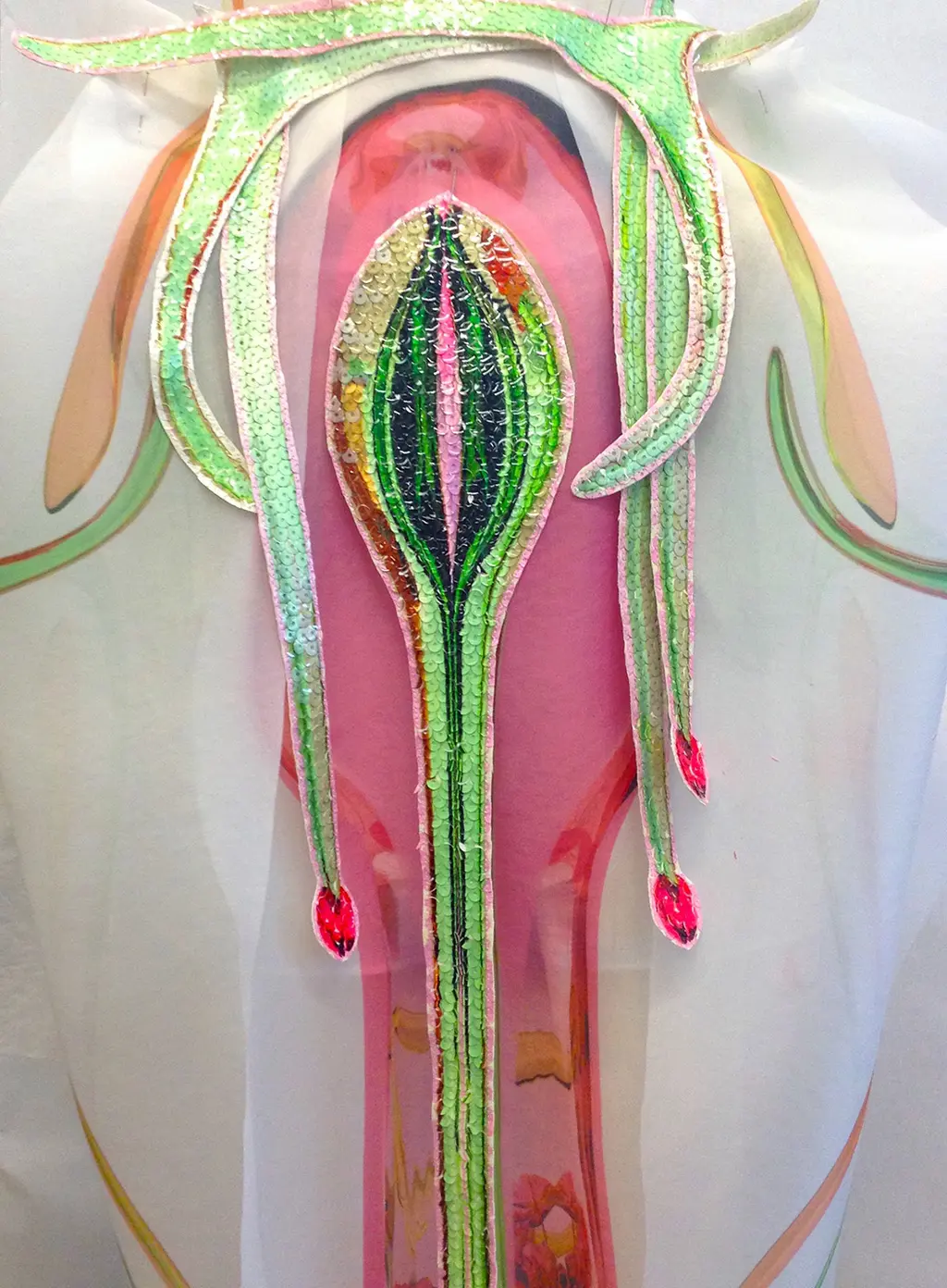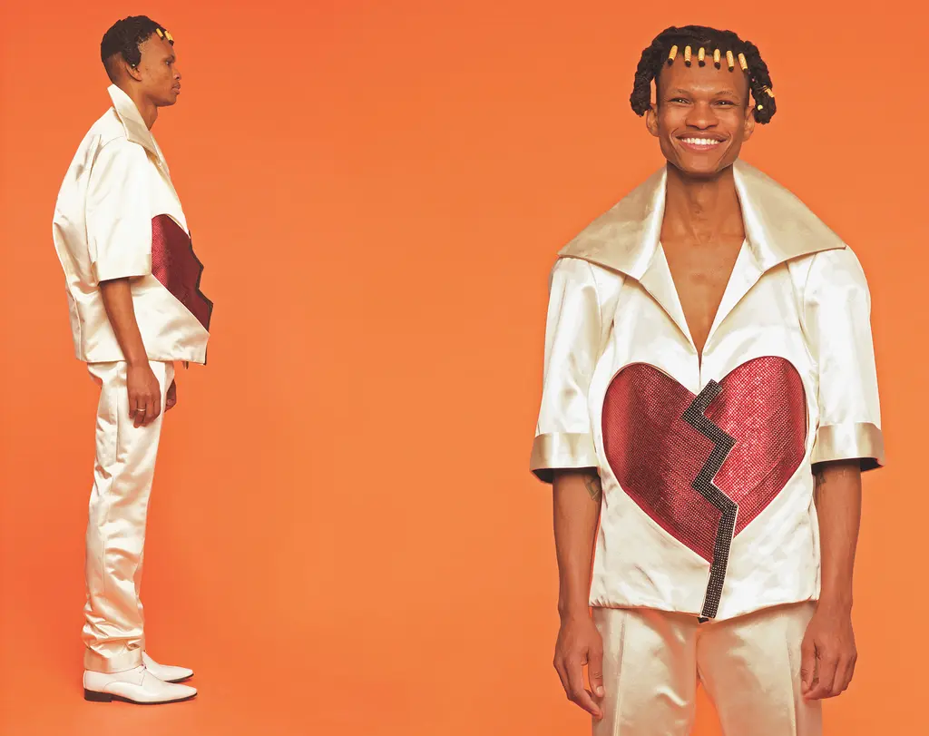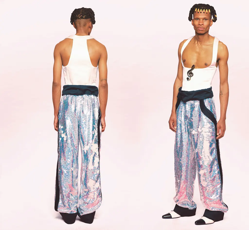Graduating from Central Saint Martins’ MA Fashion course this year, Pister’s designs are cut to expose and accentuate the male figure. From glam rock kick flares, to chest-exposing bodices and artful sculptures hanging off silk tops, each silhouette is theatrical and devilishly sexy.