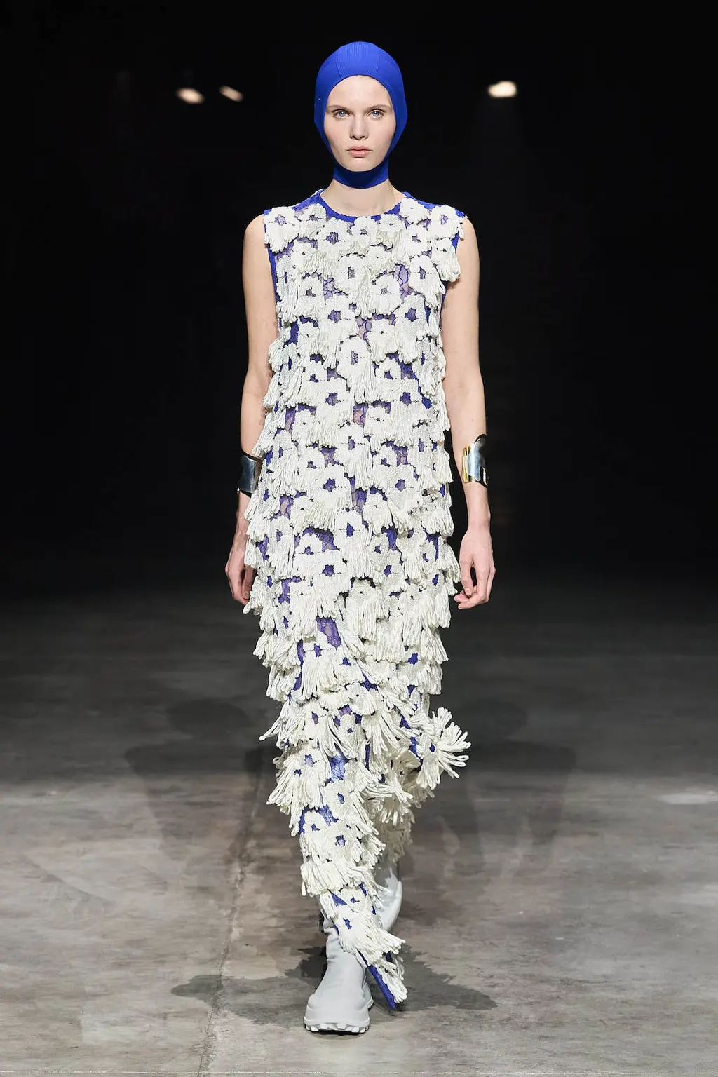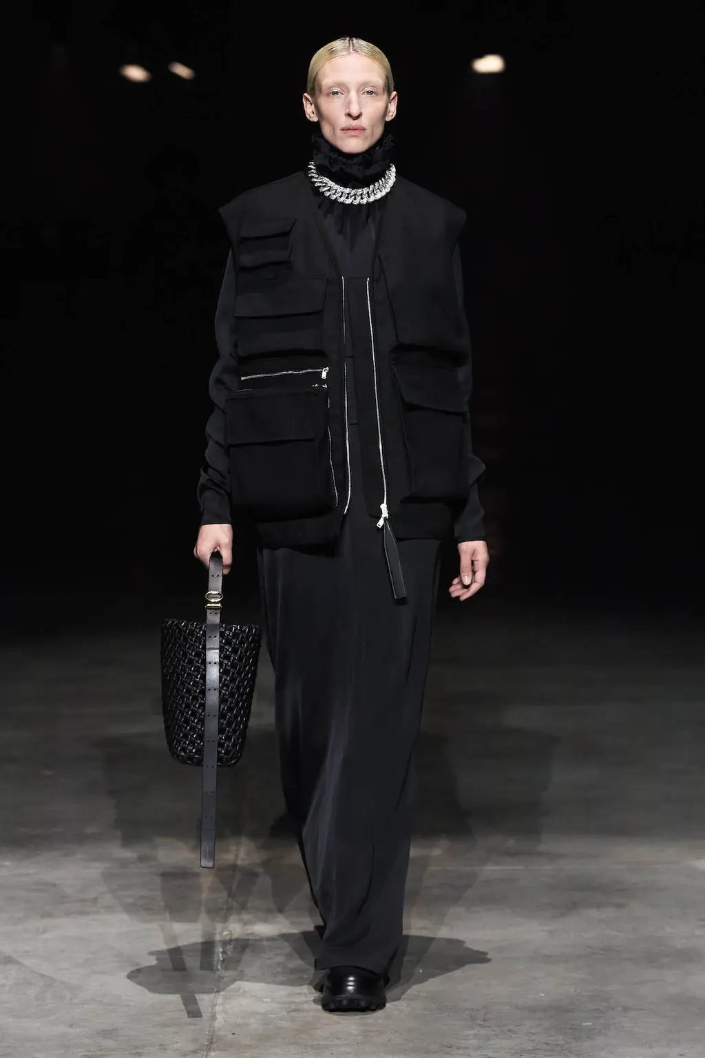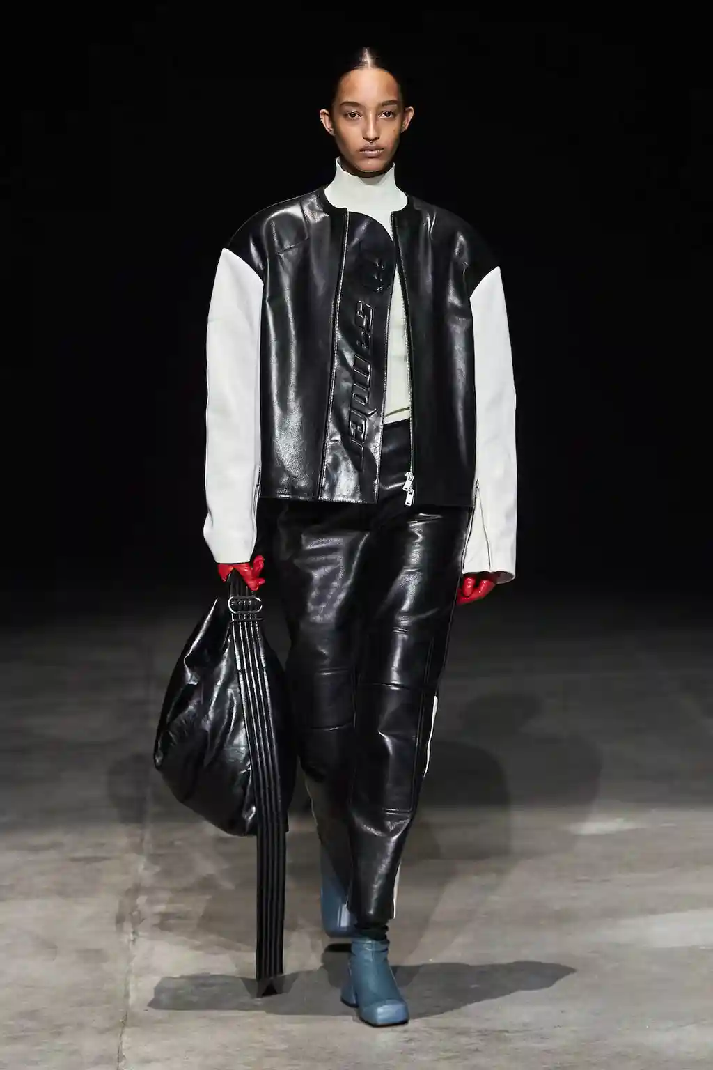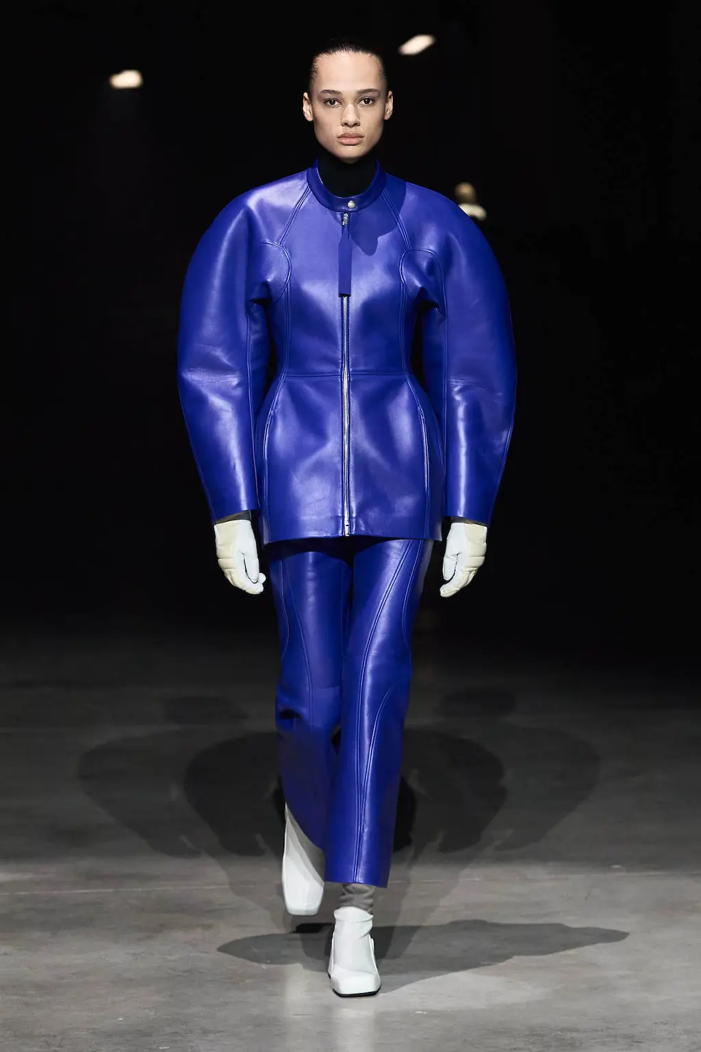 The decade’s advancements in technology that the Meiers mention could very well be interpreted in the first few looks of their collection: boxy leather that wouldn’t look out of place on a video game character, a fighting spirit in electric blue, and black two-pieces with protective silhouettes taken from motocross gear.