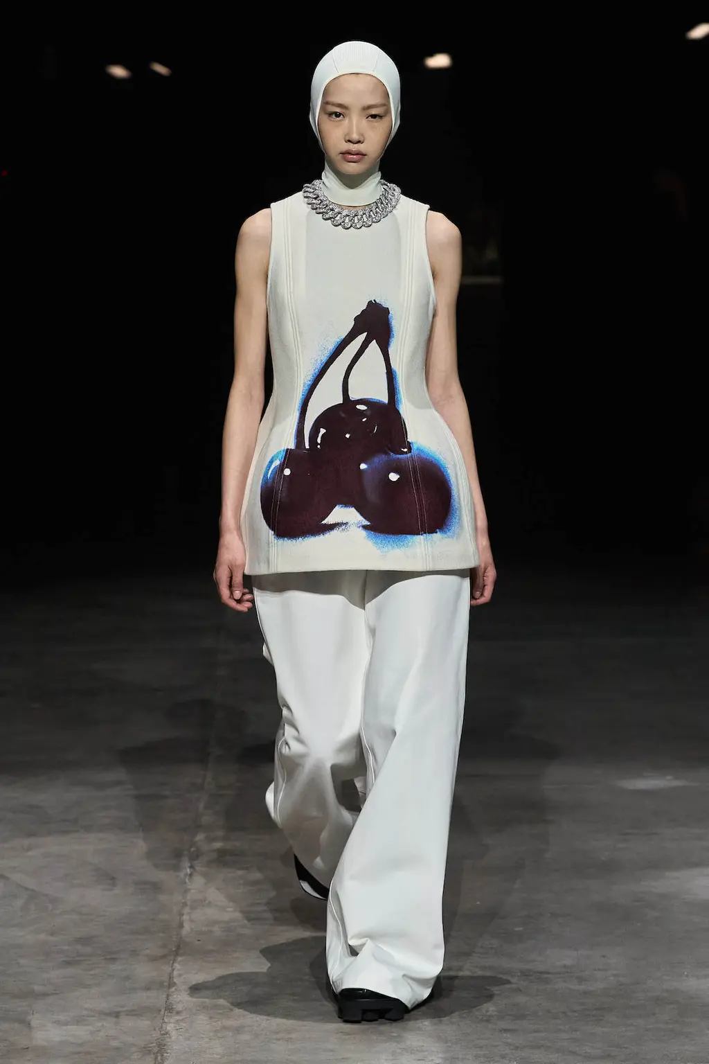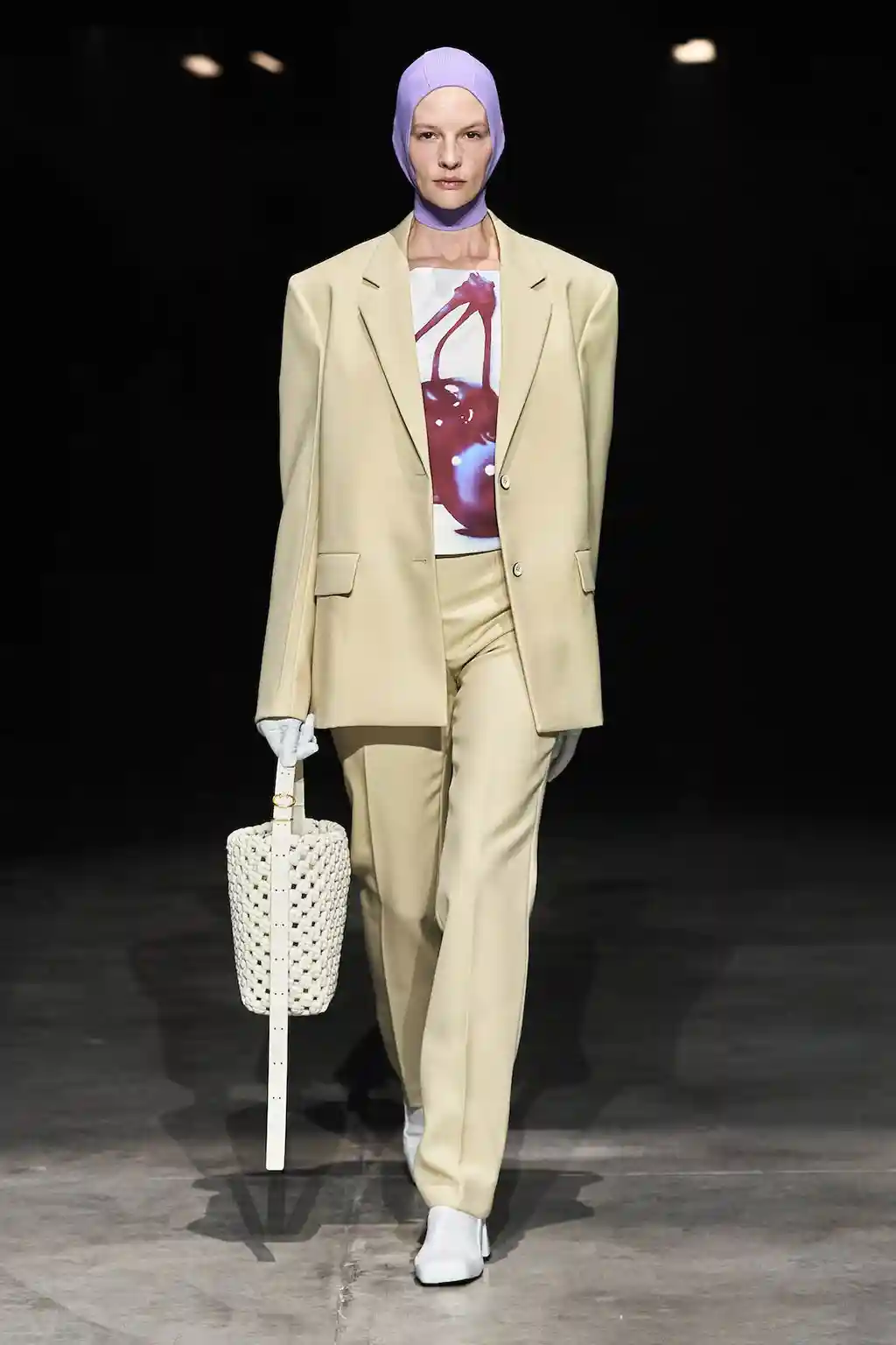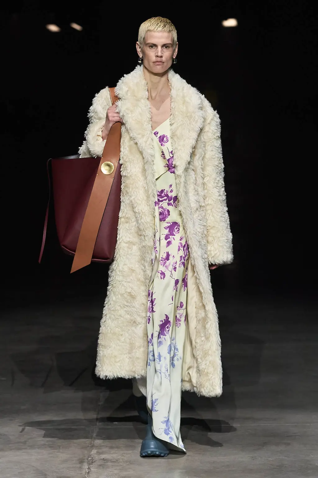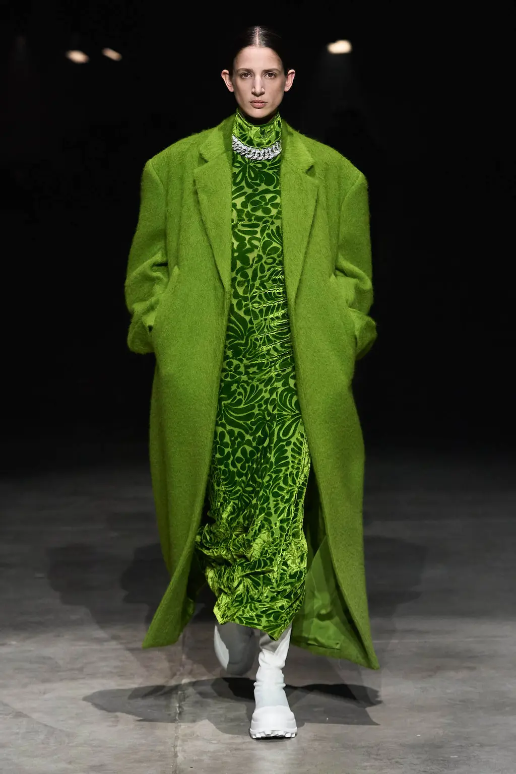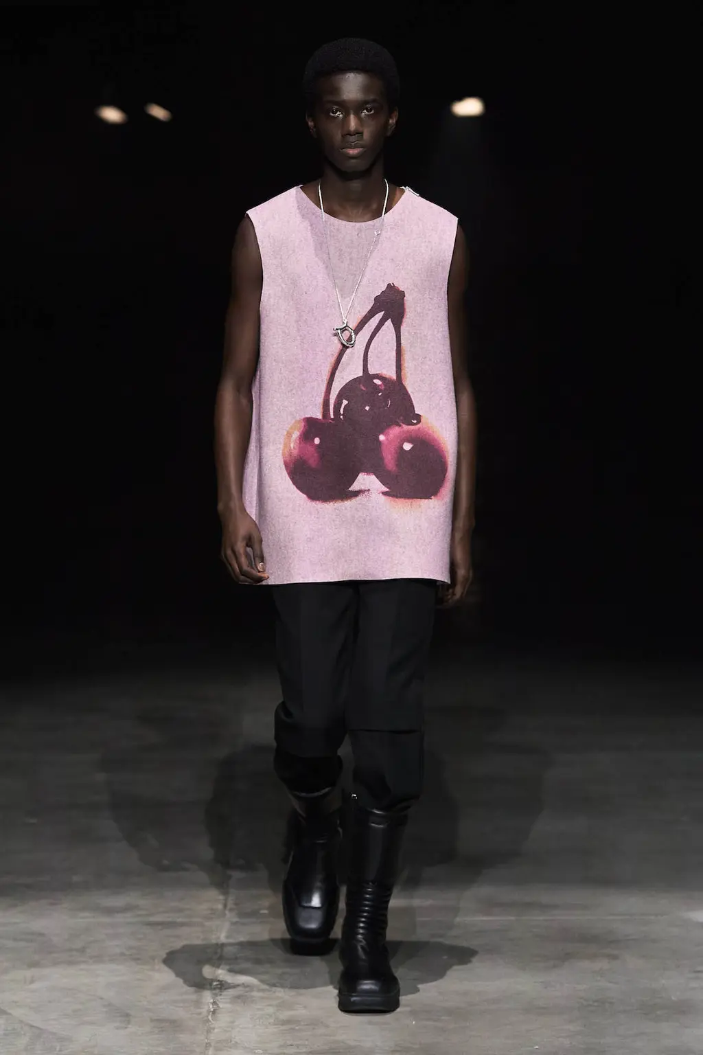 As the collection progresses, though, there are much softer touches: a custard yellow sleeveless top, calf-length cerulean blue dress or a pink coat with plenty of movement, the optimism coming through in the hues. And there are playful moments, too, in a camp shimmery silver evening dress, fuzzy lime green (faux) fur coat and prints of cherries across structured tops.
