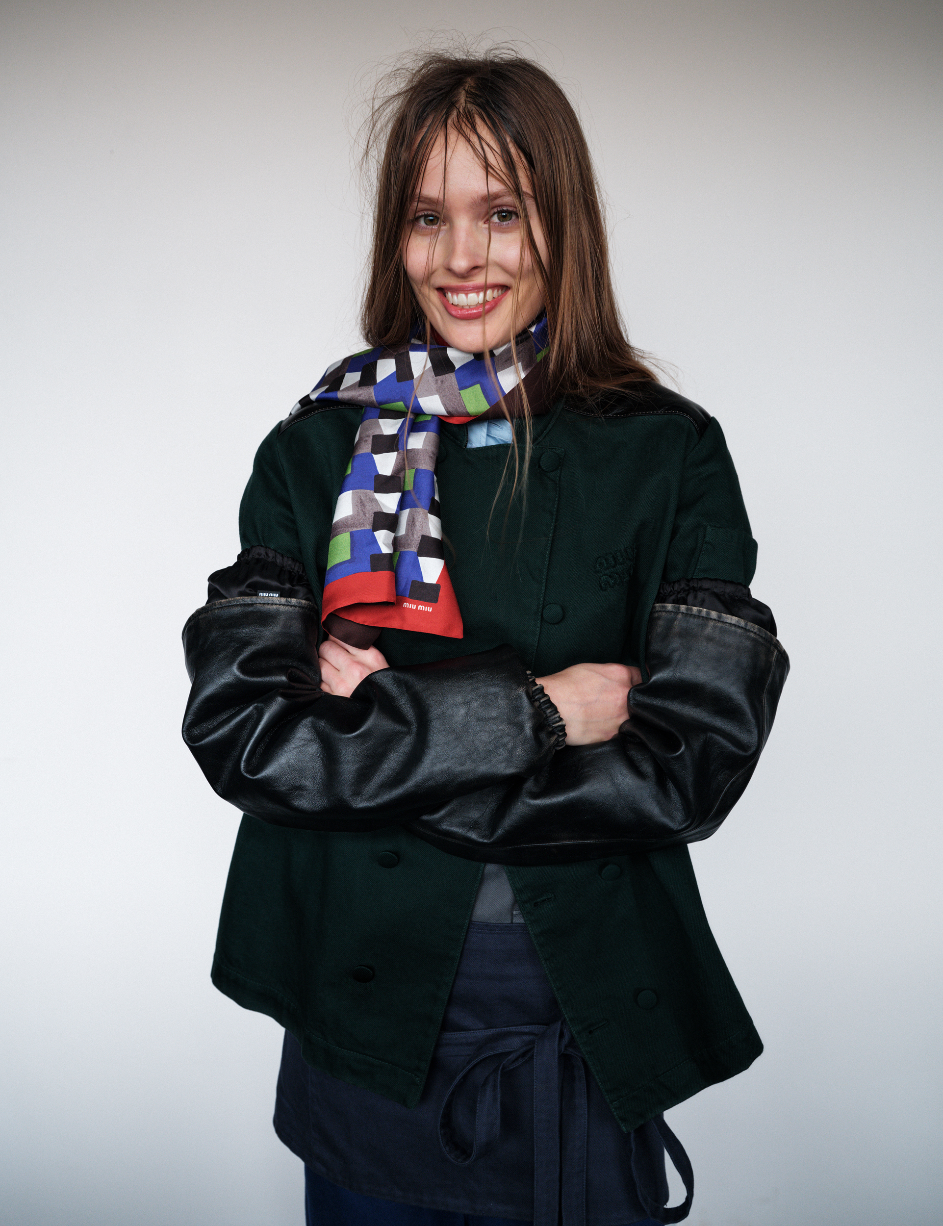Olivia wears jacket, shirt, jumper, sleeves, apron, trousers and scarf MIU MIU