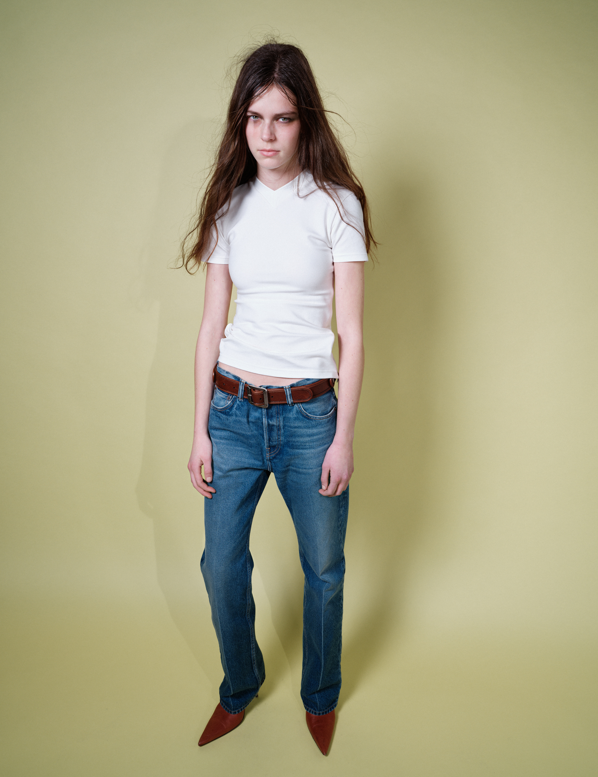 Nathalie wears T-shirt, trousers, belt and shoes ACNE STUDIOS