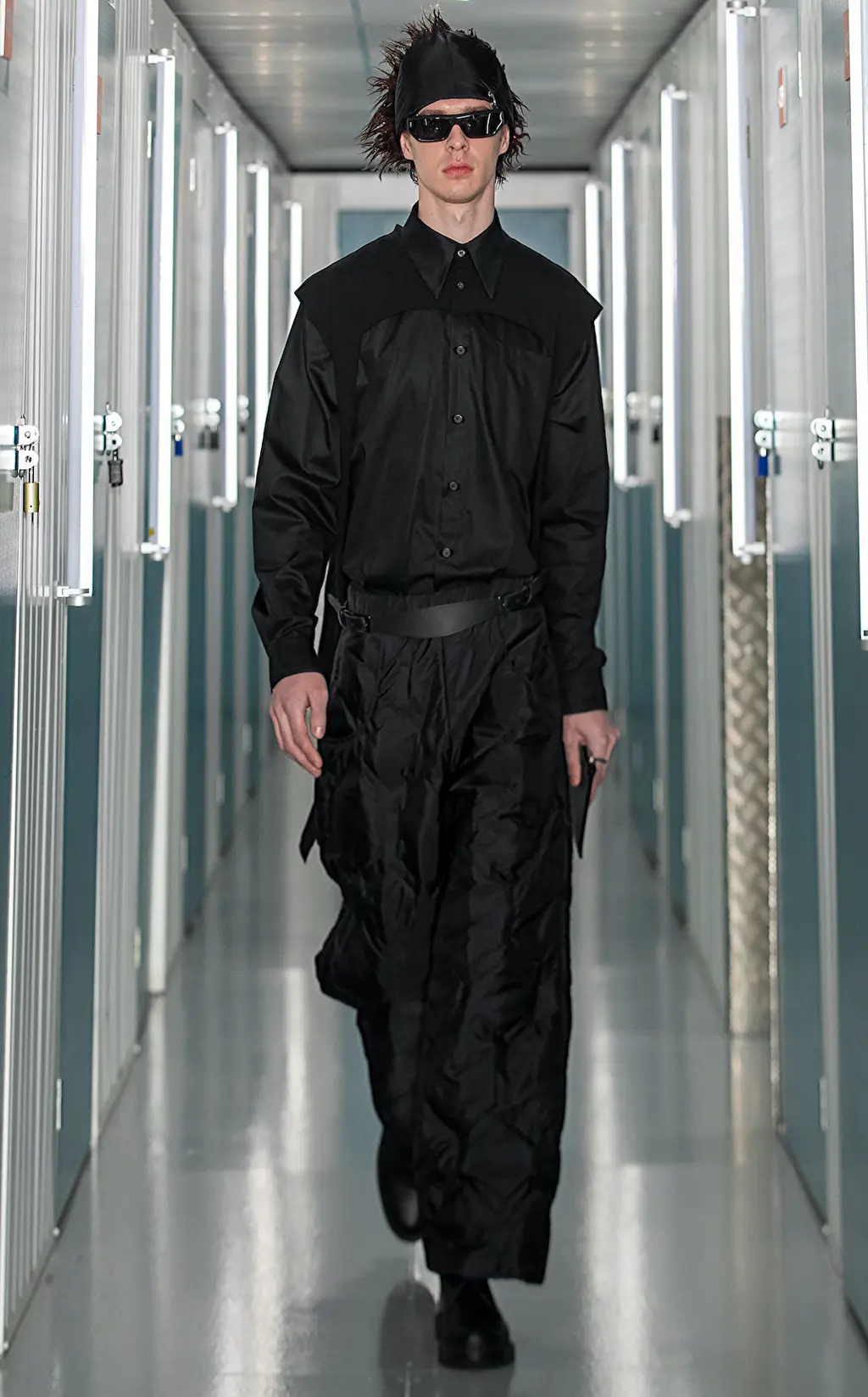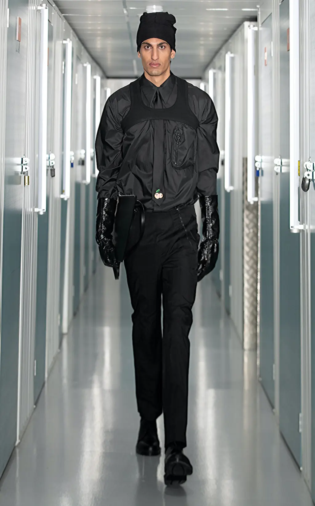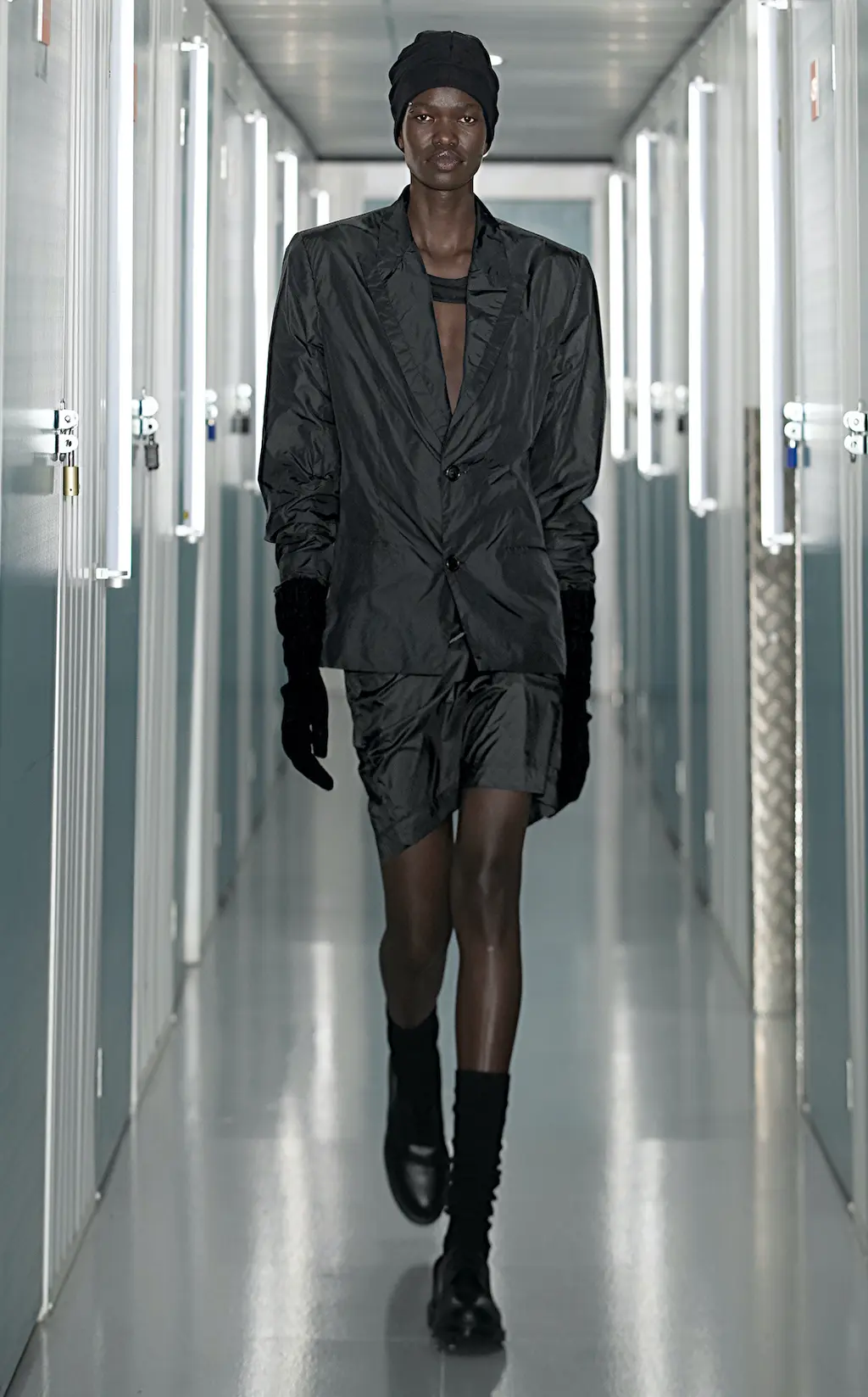 Black slim-fitting trousers and leggings nod to a rock and roll sensibility, while a sharp shouldered, checked overcoat and nylon suit with matching velour gloves indulge the collection’s dark tone. “We decided to take decisive control of the colour palette,” Bowen adds. “We wanted something pure. Usually, fashion is a product of the time and also a telegraph for the future.