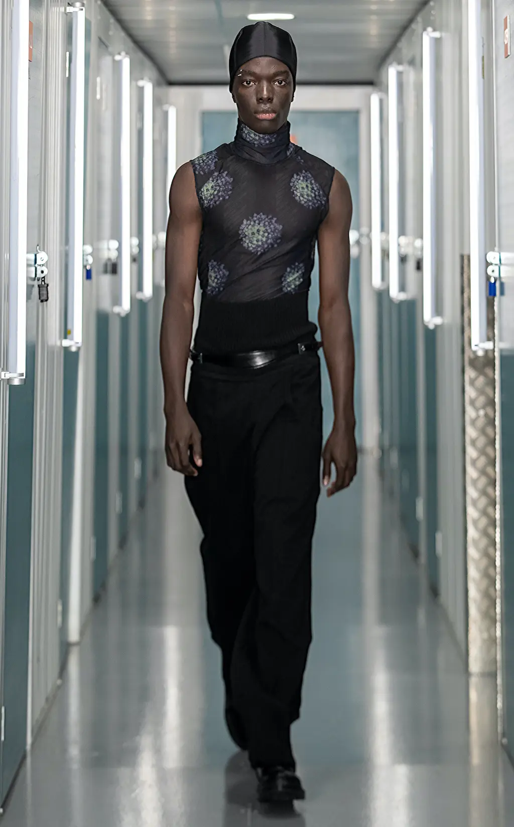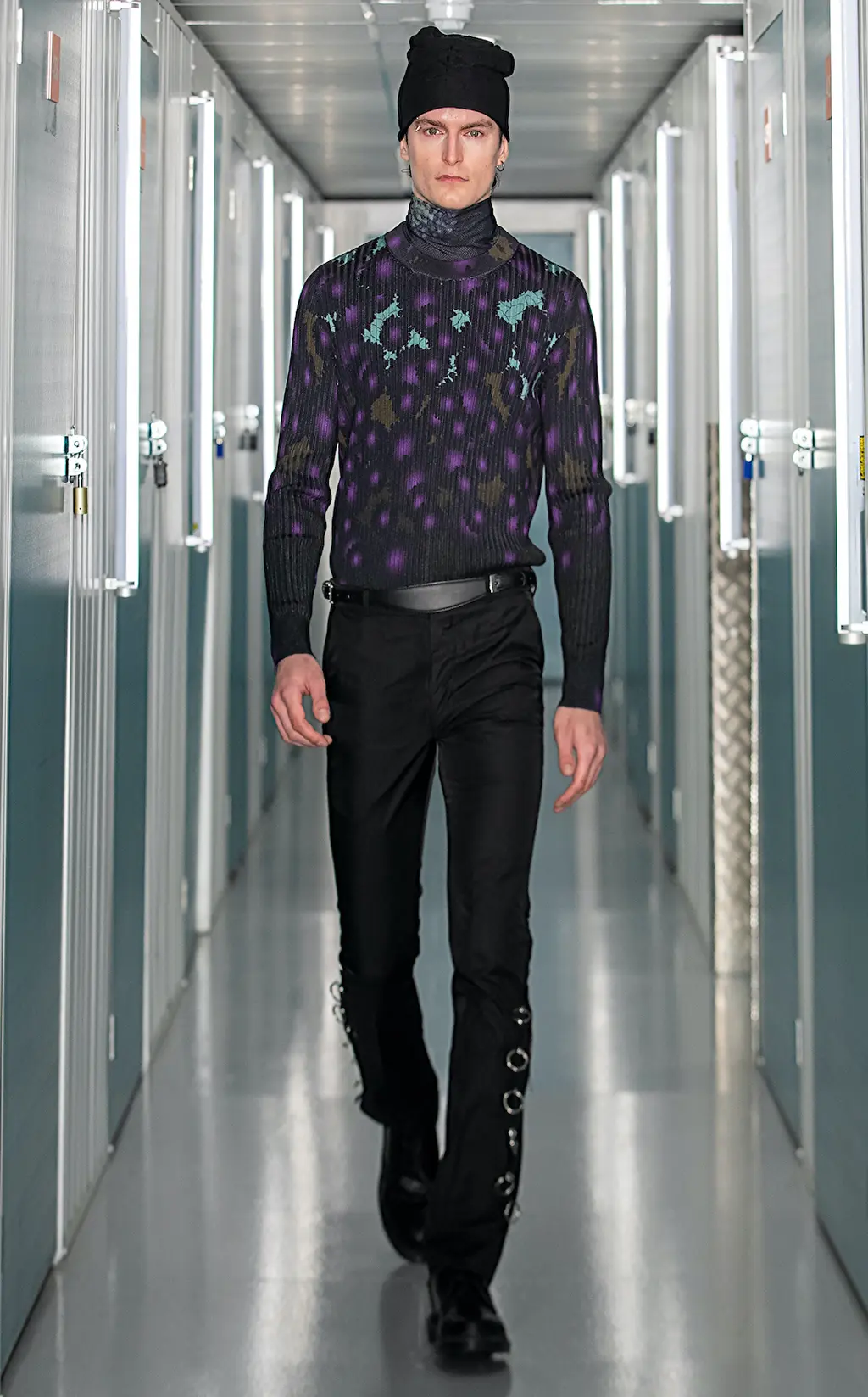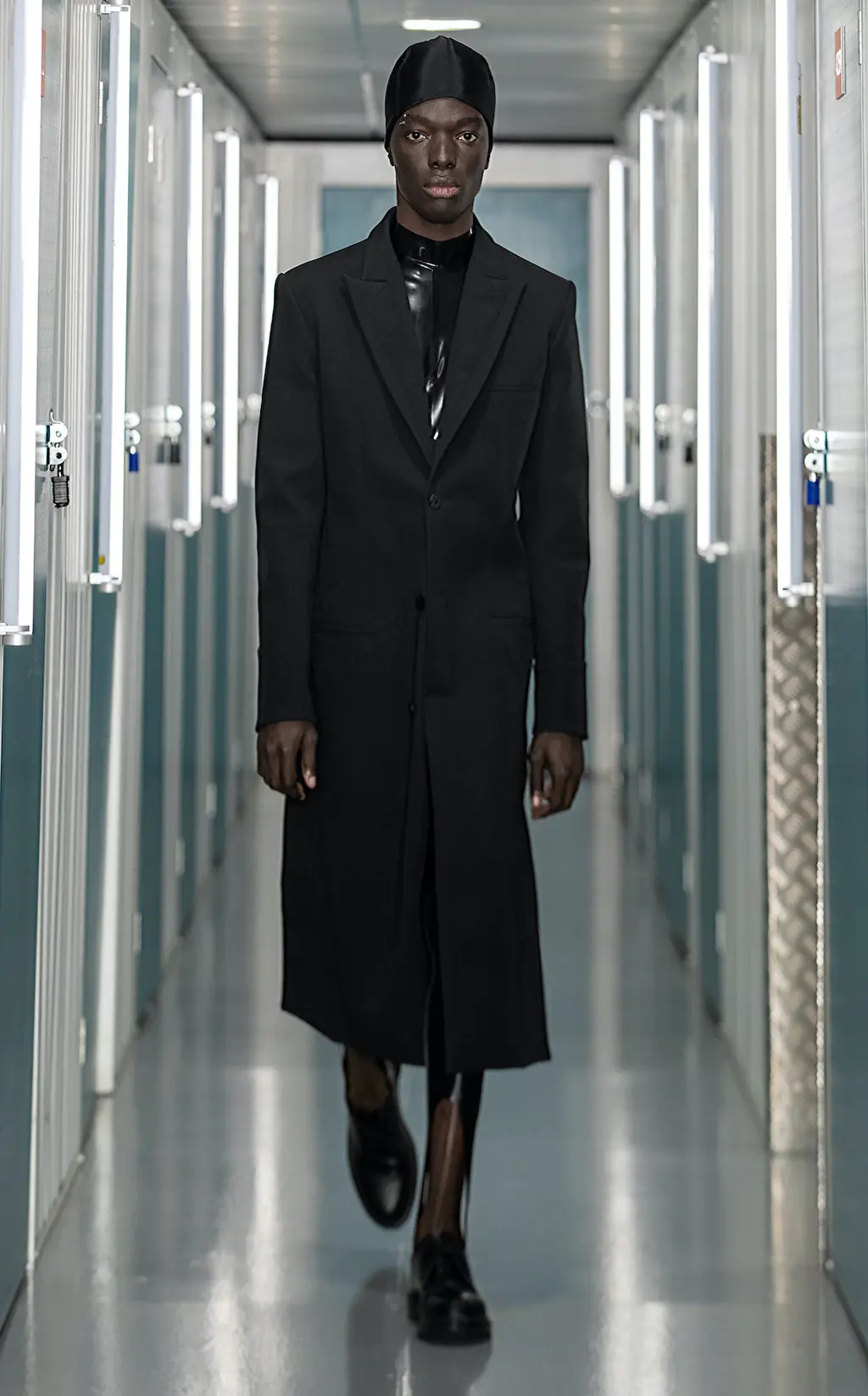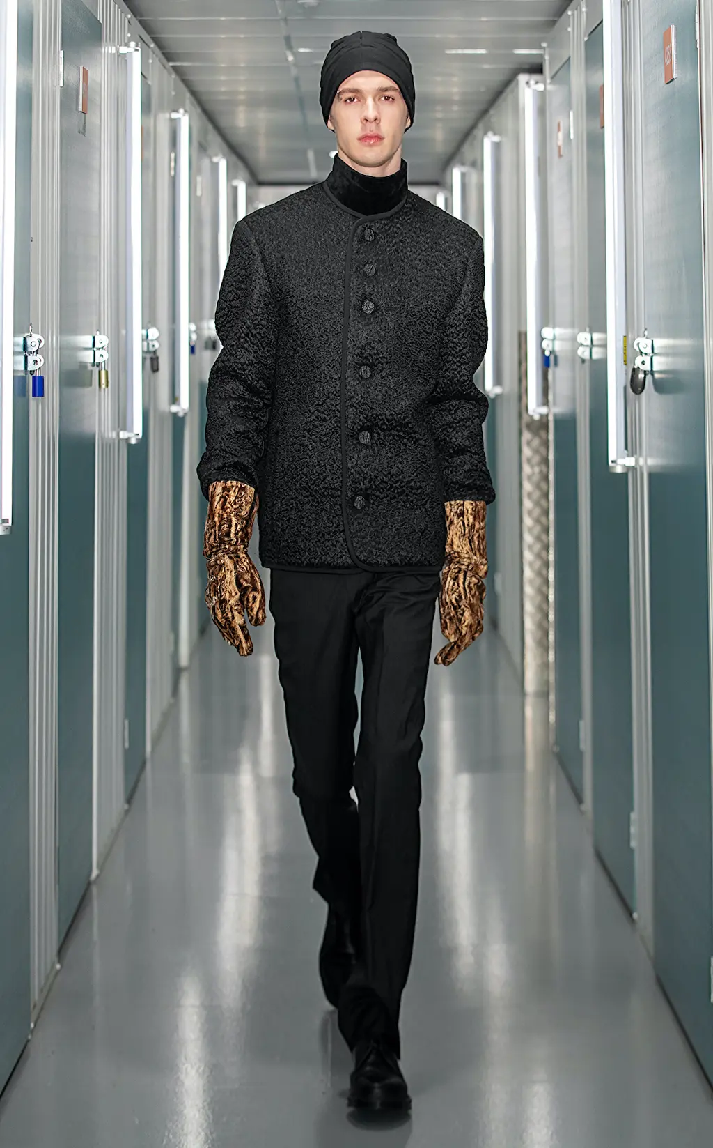 Black slim-fitting trousers and leggings nod to a rock and roll sensibility, while a sharp shouldered, checked overcoat and nylon suit with matching velour gloves indulge the collection’s dark tone. “We decided to take decisive control of the colour palette,” Bowen adds. “We wanted something pure. Usually, fashion is a product of the time and also a telegraph for the future.