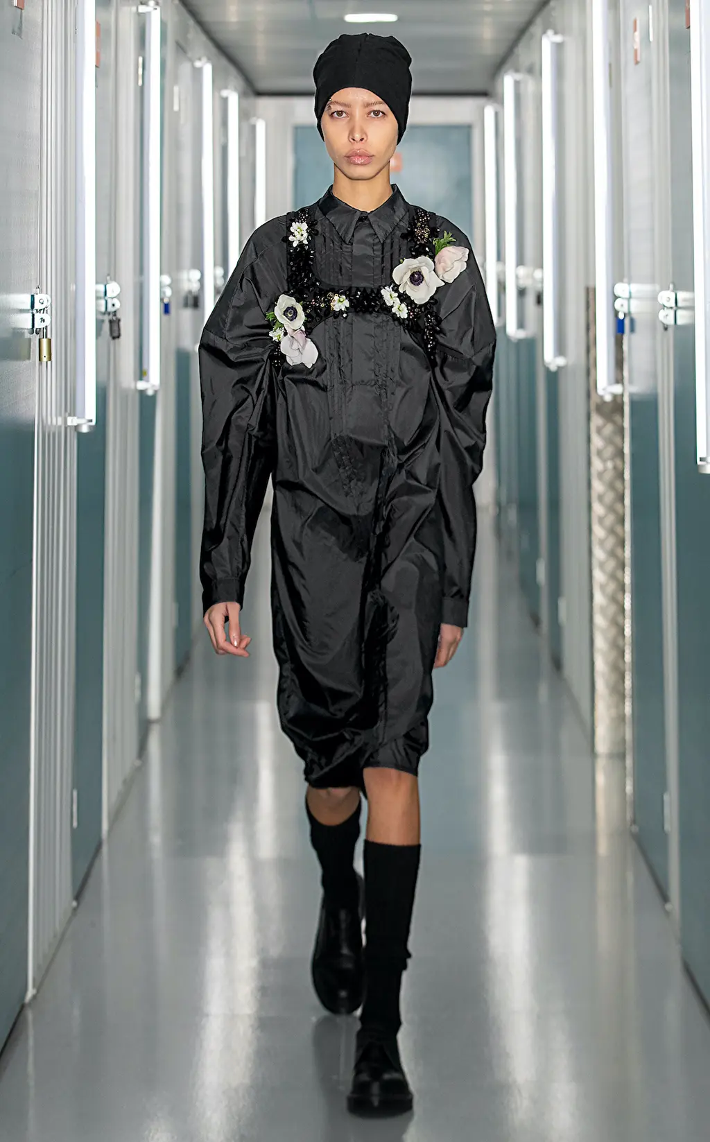 “We didn’t feel any desire to use bright colours,” the duo say of the collection’s shift in mood. “This wasn’t our moment to shine through the clothes but for them to serve us – we found a different kind of expression through black and muted colours, our floral prints faded as we went back to our passion, the construction of a garment.”