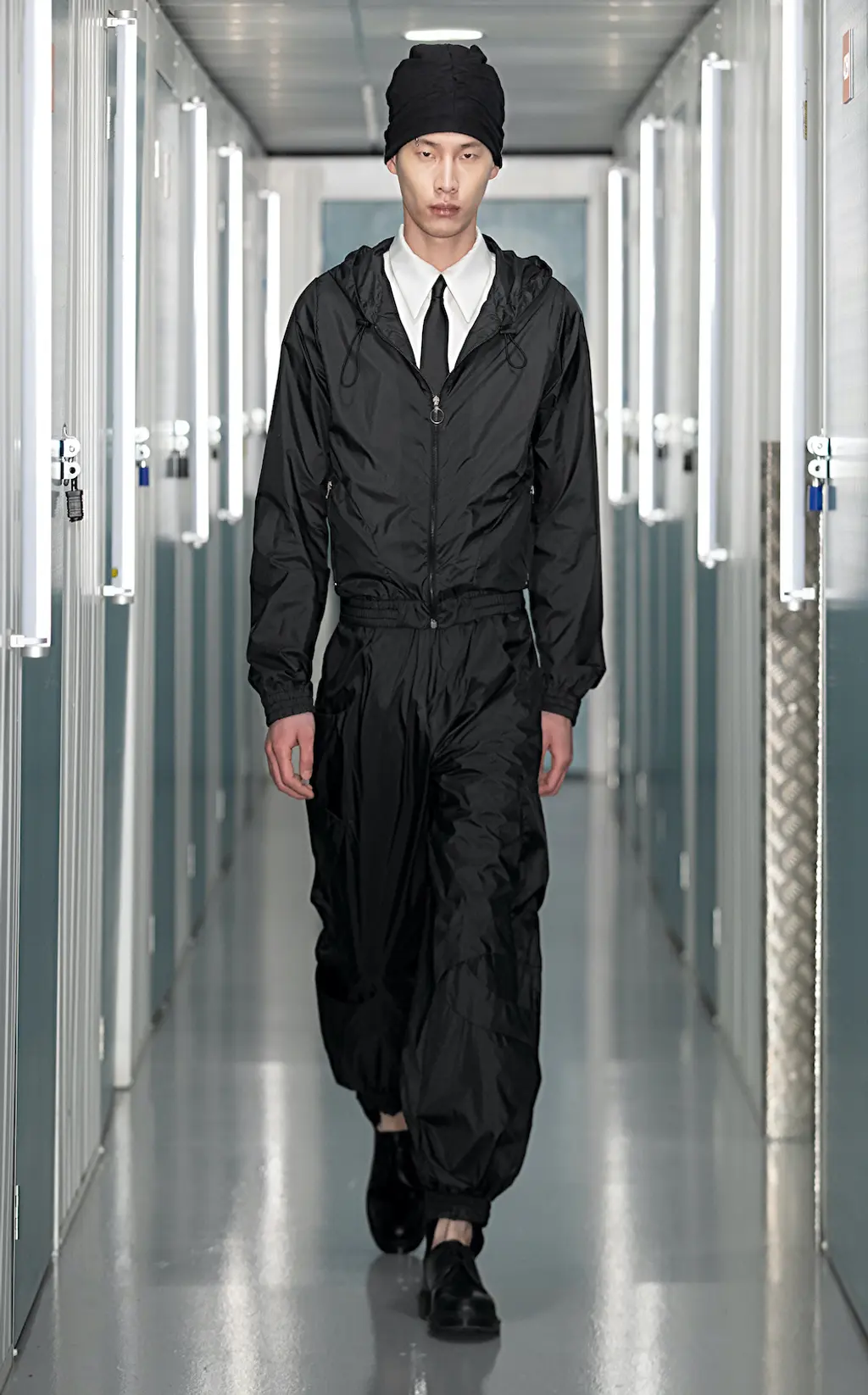 Silhouettes have been diminished to reveal only the most necessary base elements: suiting made from breathable materials merge elegance and practicality, as lightweight, loose-fitting cargos are paired with a matching waterproof jacket, worn with a crisp white shirt and black tie.