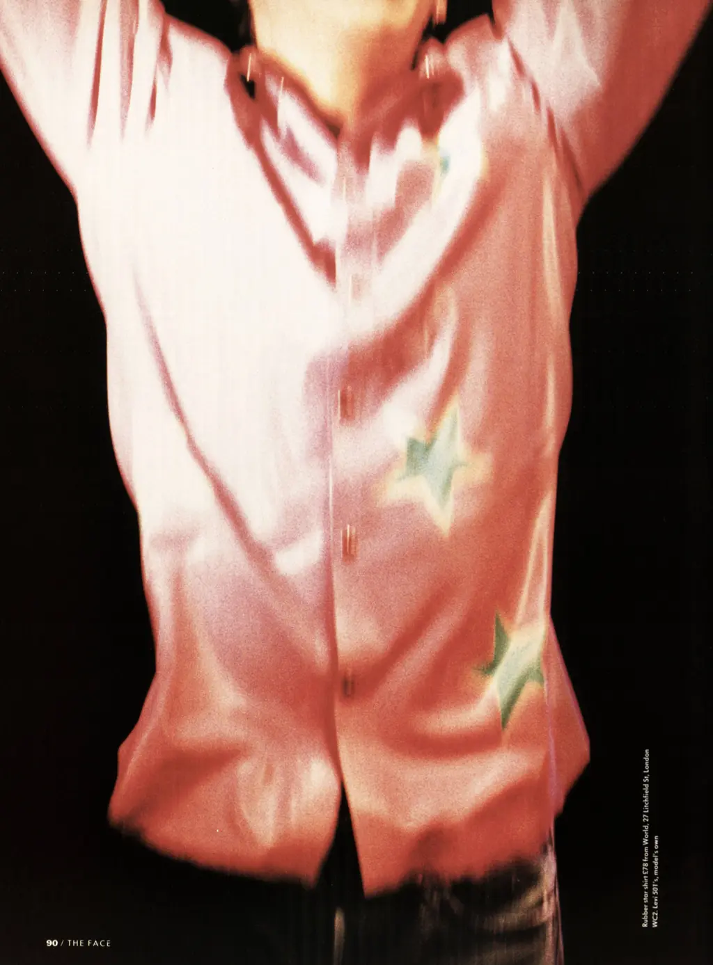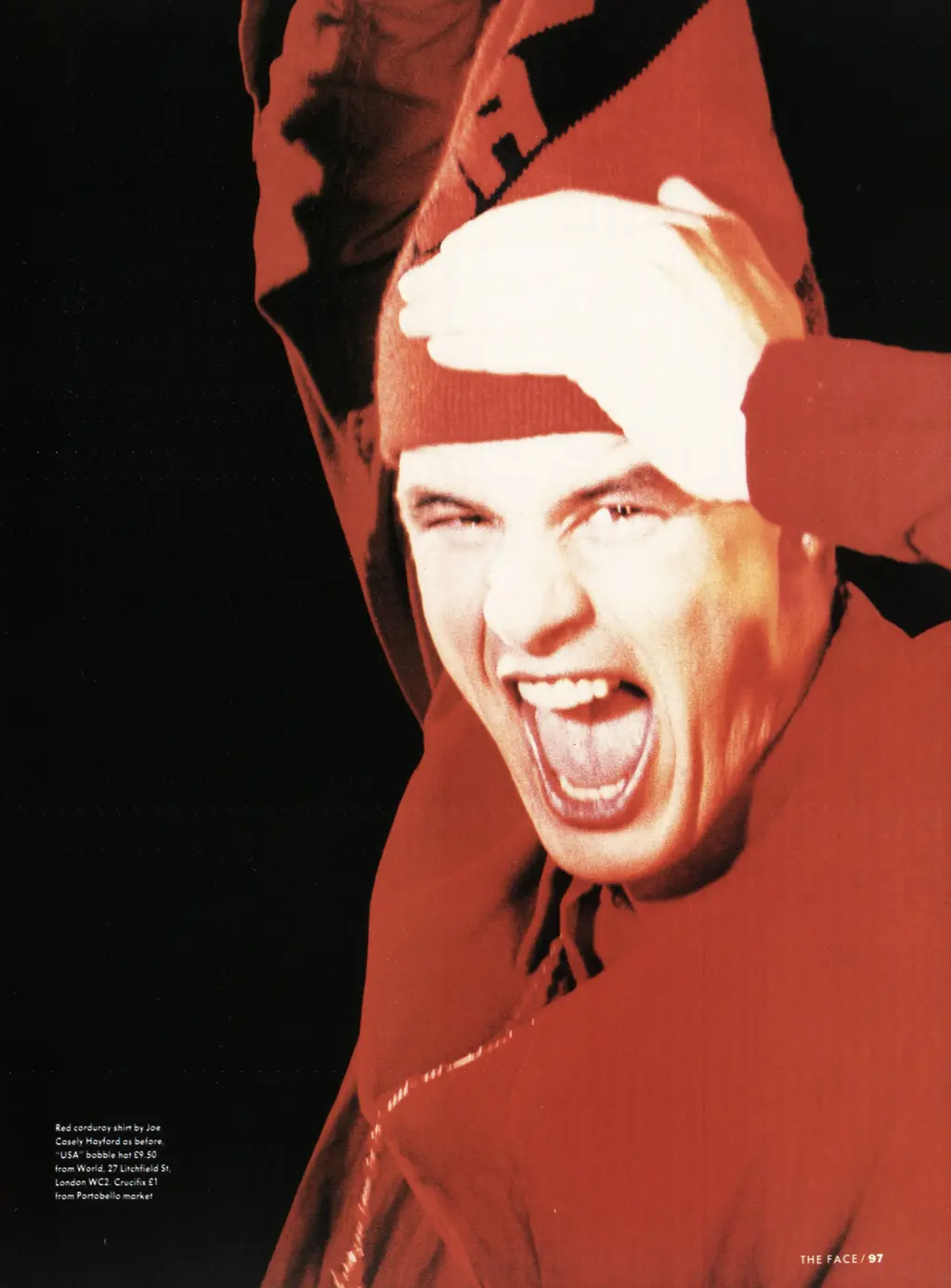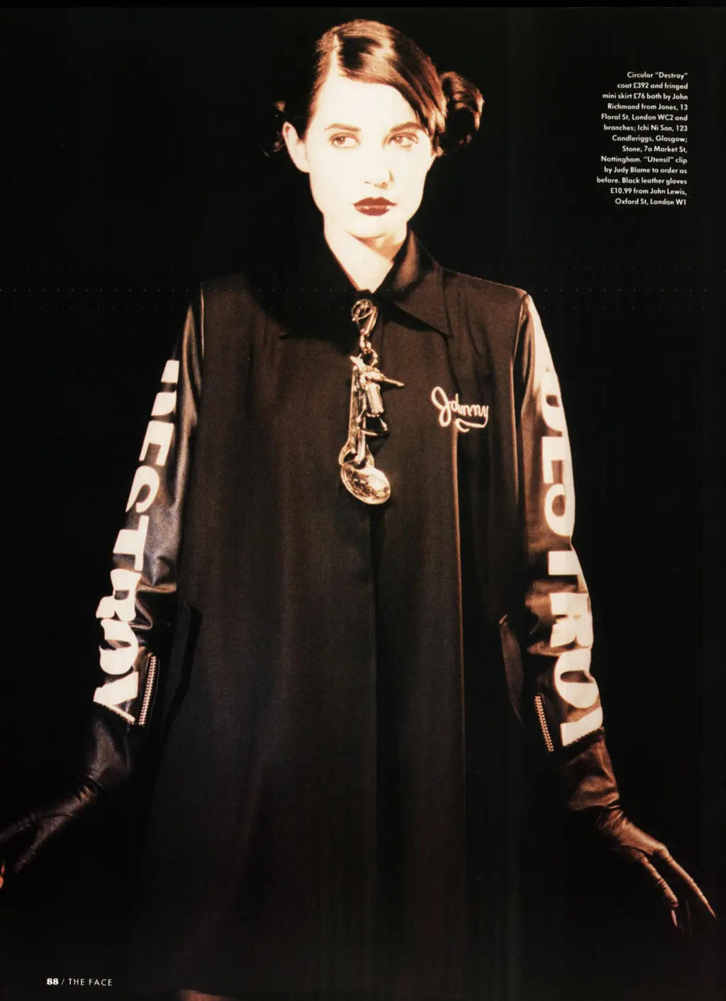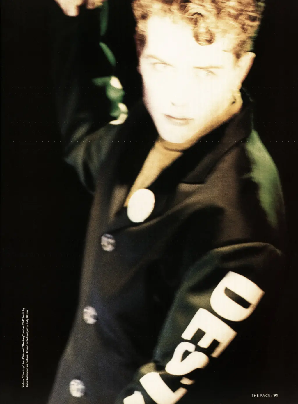 Two-tone bombers were worn with long leather and velveteen gloves (another Blame-ism) that ushered in a new, disruptive masculinity akin to the sense of irreverence pioneered by Blame in the ’80s within the pages of The Face. Scroll through a timeline of Blame’s revolutionary work for The Face below.