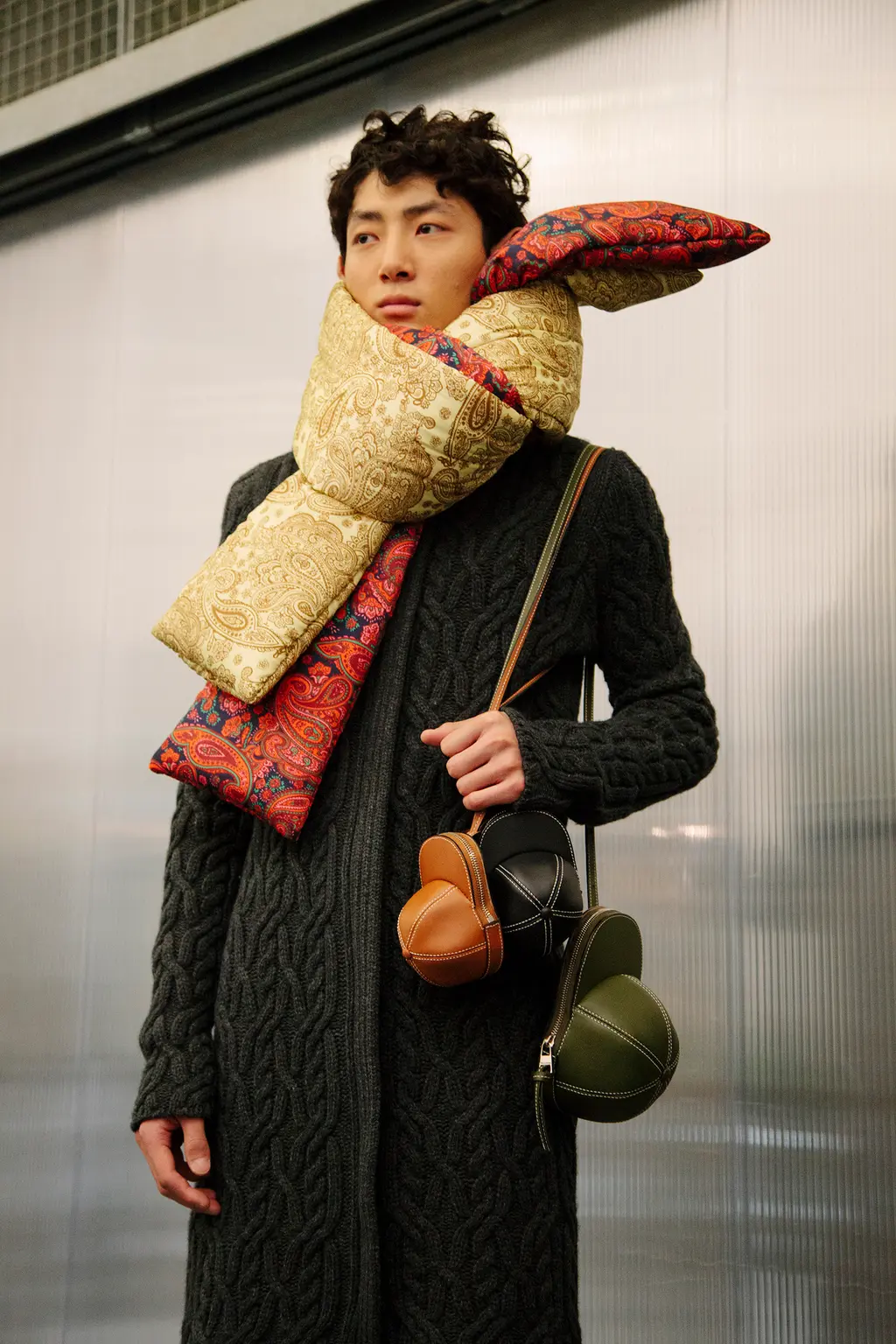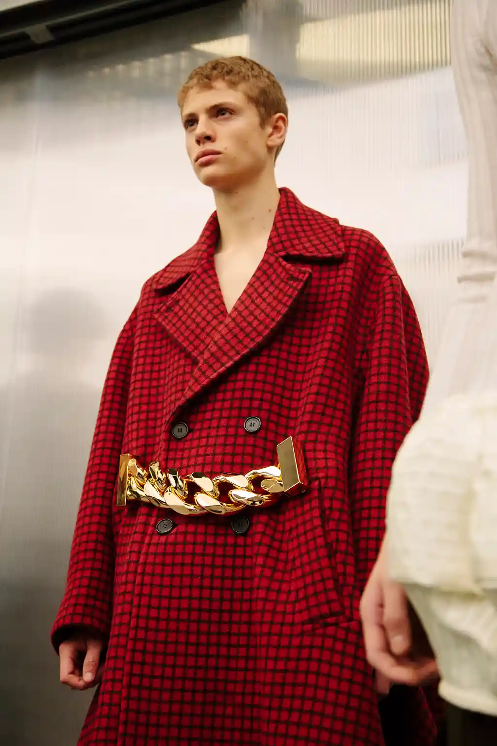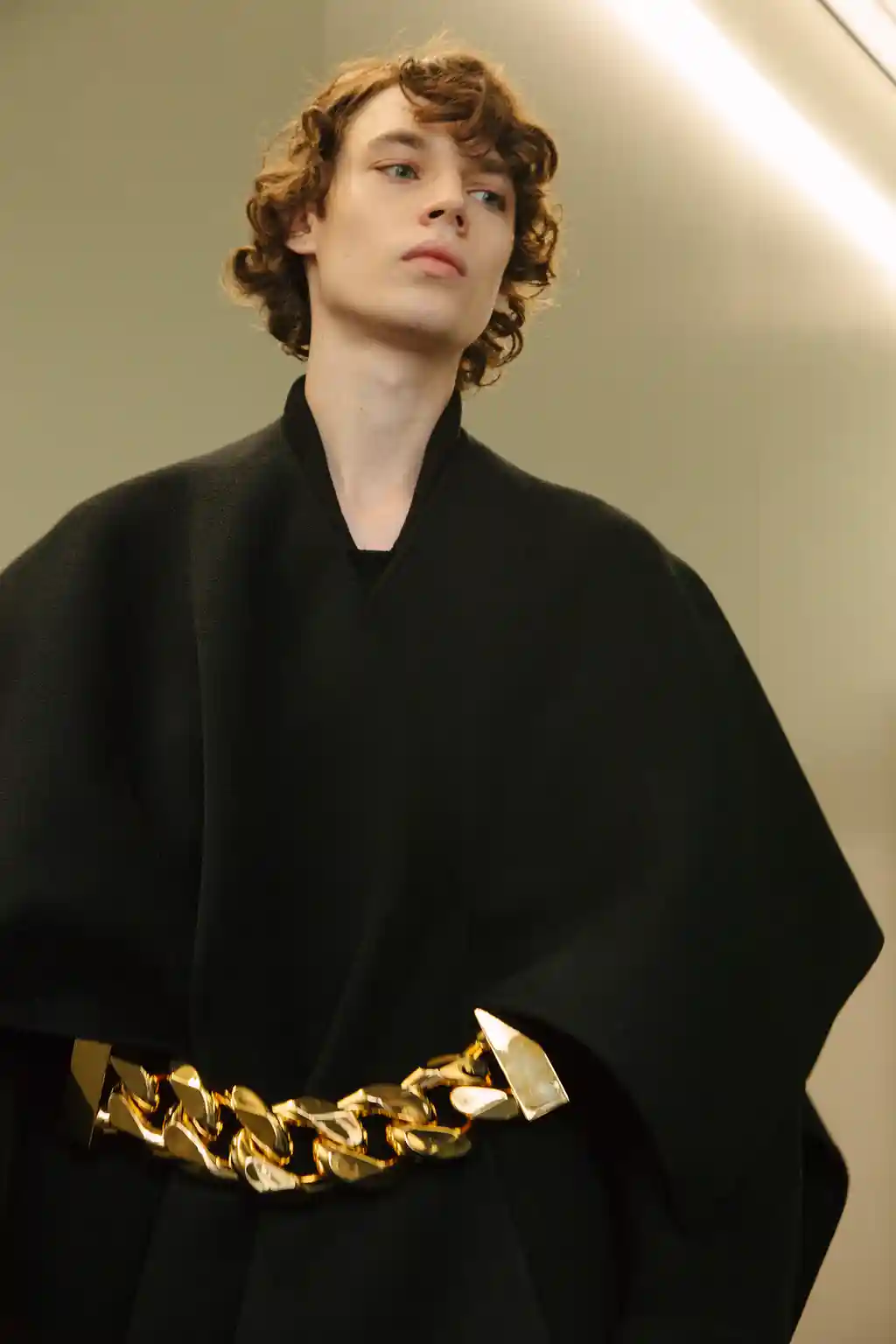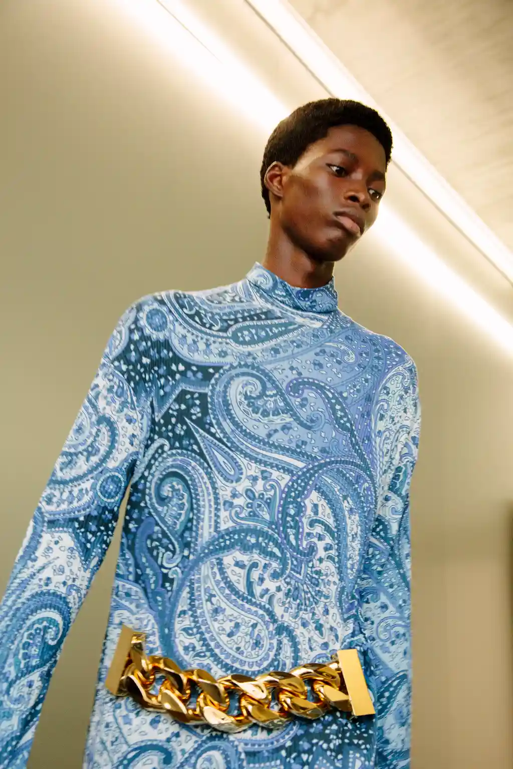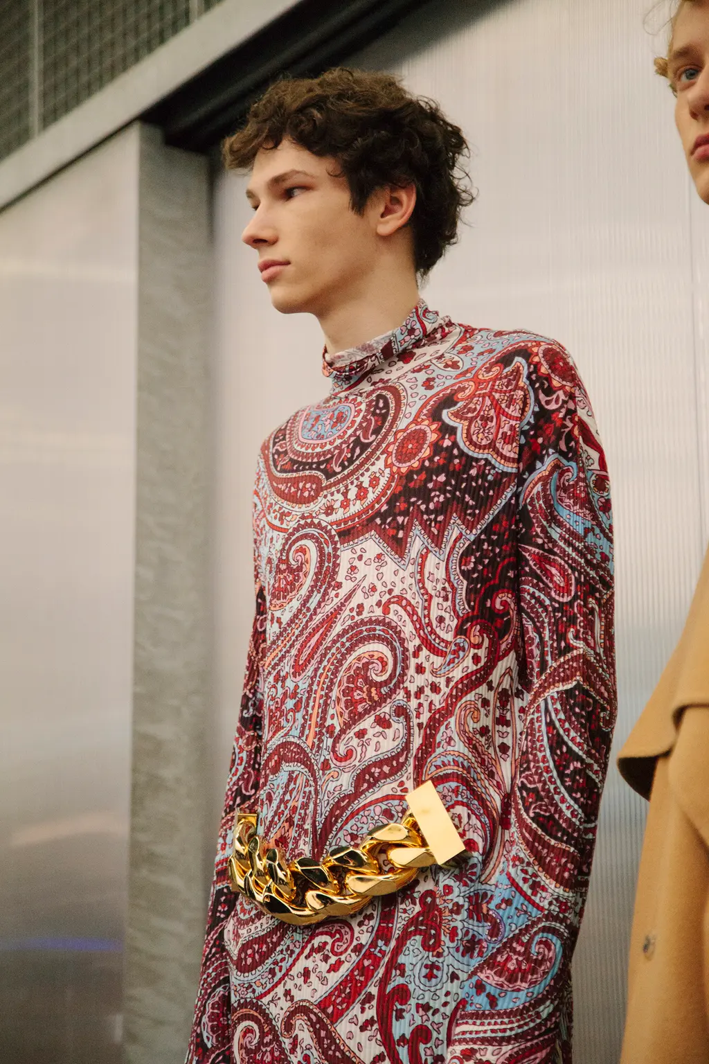 There was a heavy sense of classicism and romance, albeit one that retained a foot very much in the underground. The heavily featured paisley, for instance – which was once such an integral part of the JW Anderson brand – returned in abstraction; blown up and purposefully worn out, like a photocopy or a graffiti artist’s stencil. Heavy gold chains featured prominently – not least in the rather bling black loafers – and there was, perhaps, a nod to the most literal reading of the burning house in the sustainability of the silhouettes.