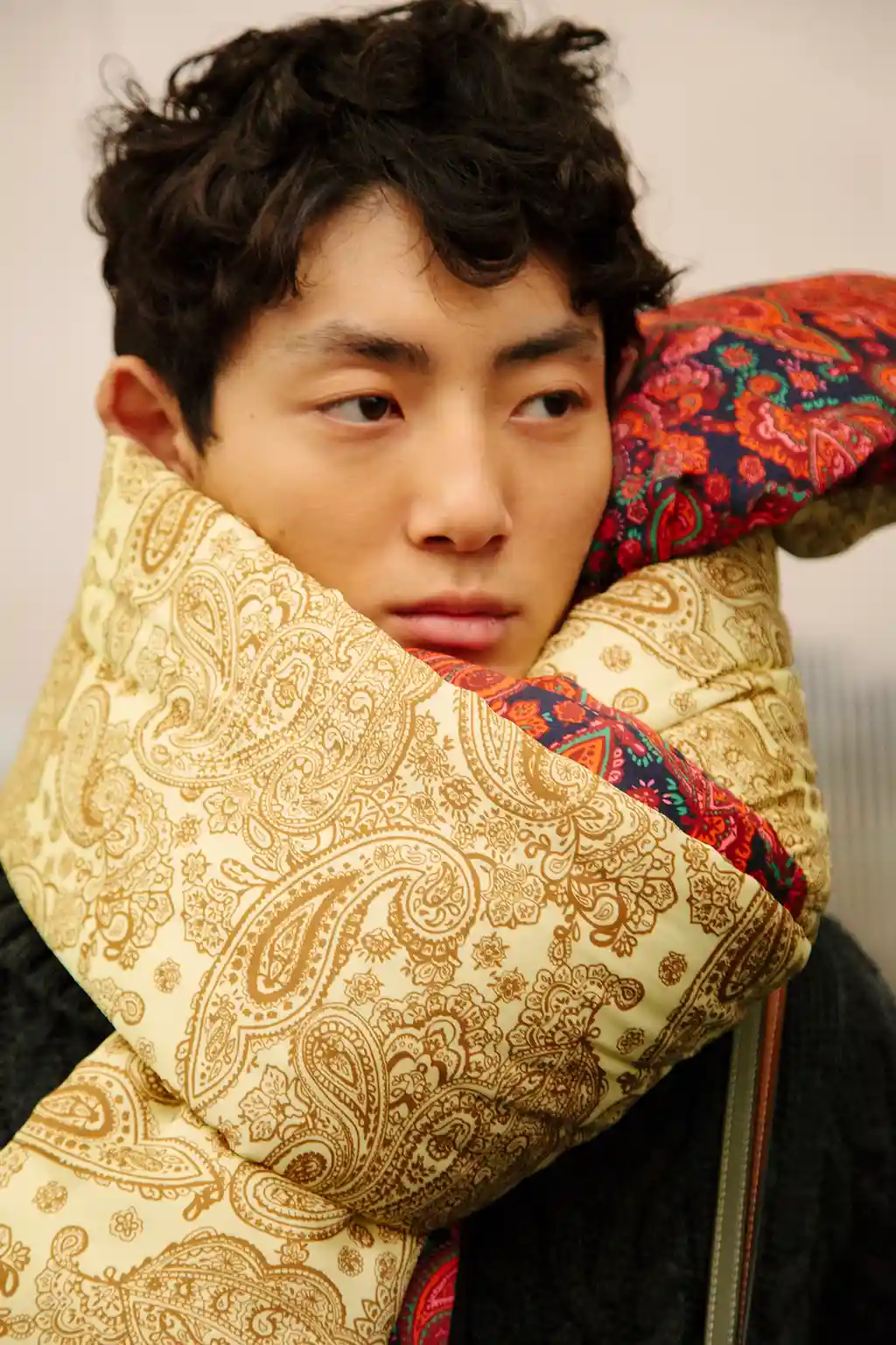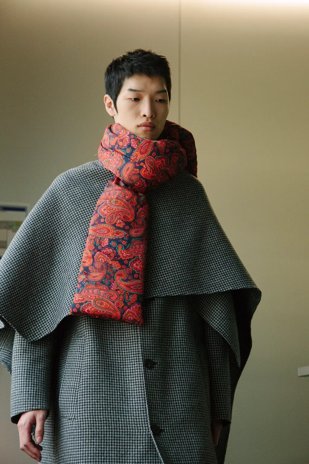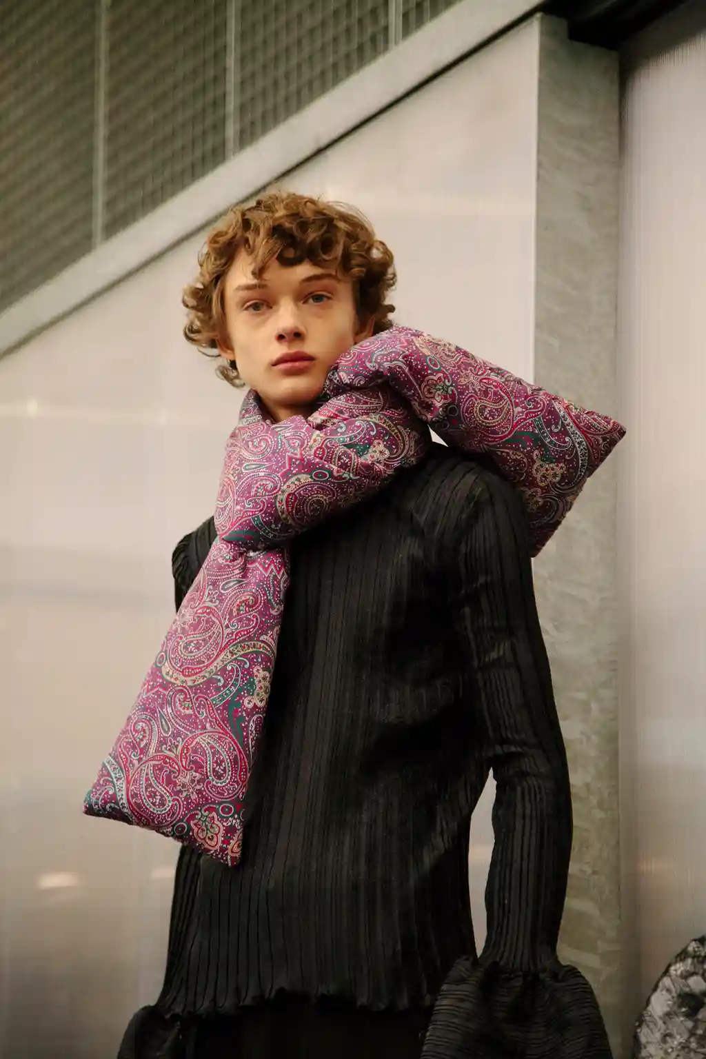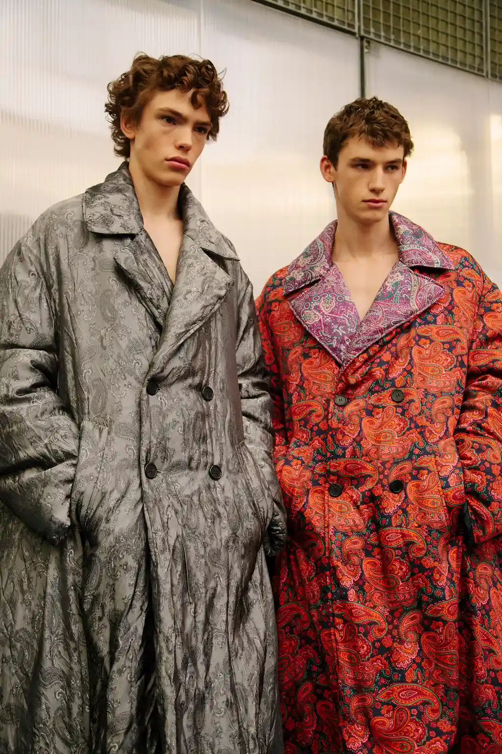 There was a heavy sense of classicism and romance, albeit one that retained a foot very much in the underground. The heavily featured paisley, for instance – which was once such an integral part of the JW Anderson brand – returned in abstraction; blown up and purposefully worn out, like a photocopy or a graffiti artist’s stencil. Heavy gold chains featured prominently – not least in the rather bling black loafers – and there was, perhaps, a nod to the most literal reading of the burning house in the sustainability of the silhouettes.