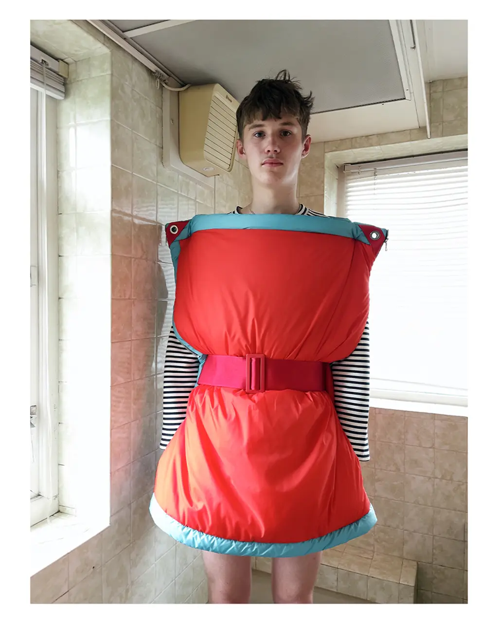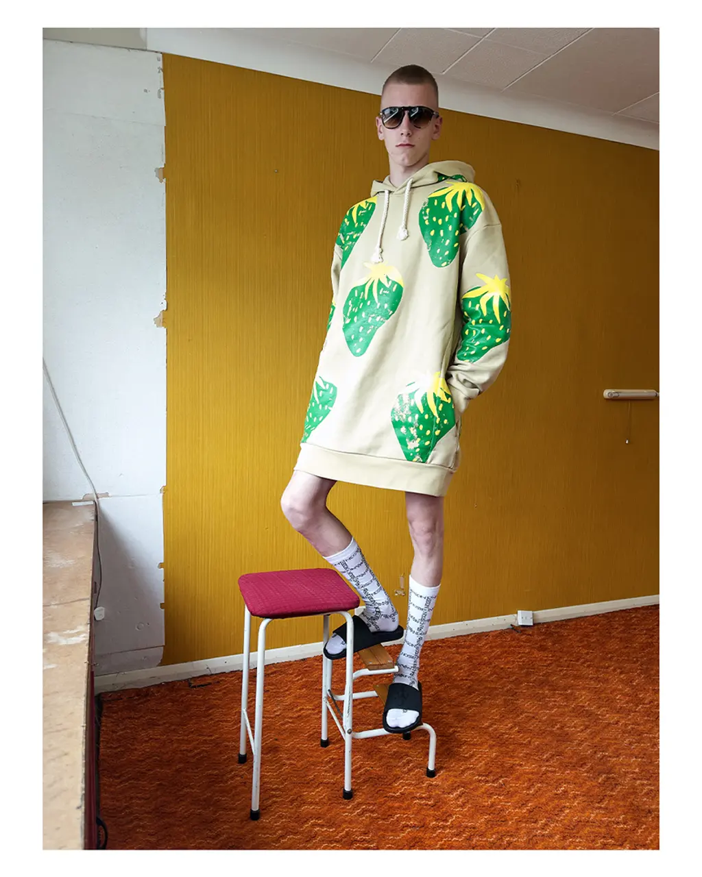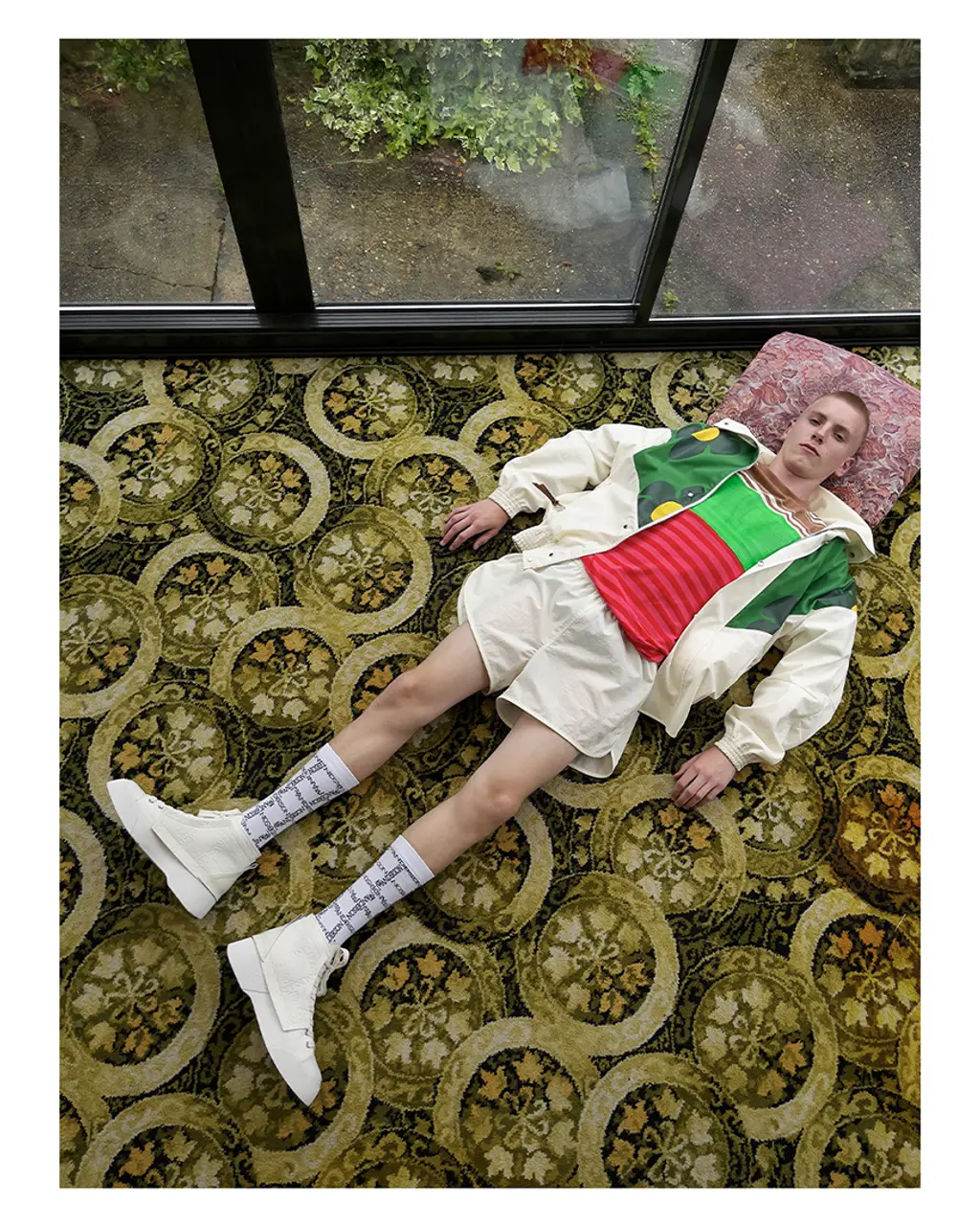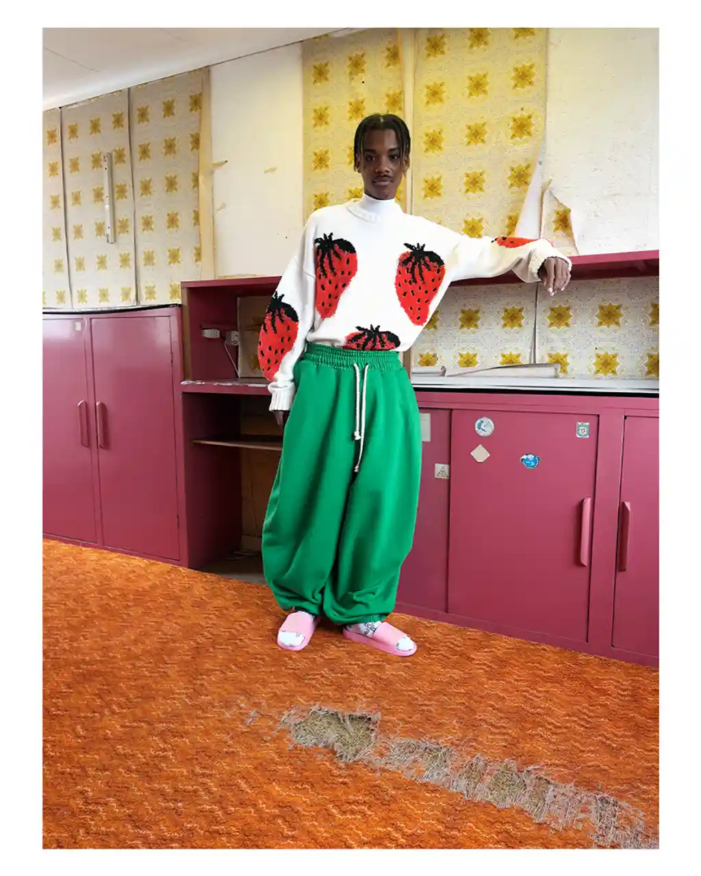 But the shapes are freeing. Knitwear is oversized and boxy, sat fluidly on the body and paired with bright green, open-back sandals, while pillows are reconfigured as dresses. Still, Anderson asserts that, as fluid as his boys are this season, they are still “proudly masculine,” just ambiguous.