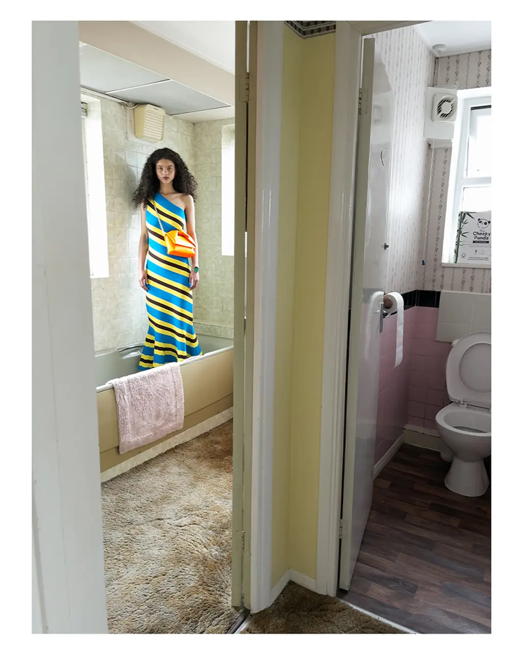 His Women’s collection takes its leanings to the dancefloor for Resort, placing emphasis on the party girl with a self-assured attitude. The pieces are relatively simple – in terms of the brand at least. Cuts are blunt, cutting across the chest in asymmetric dresses striped in yellow, black and brown. But experimental cues come in hyper-long sleeves, ’70s-style halter necks and day-glo footwear, embracing a “so wrong it’s right” mantra.