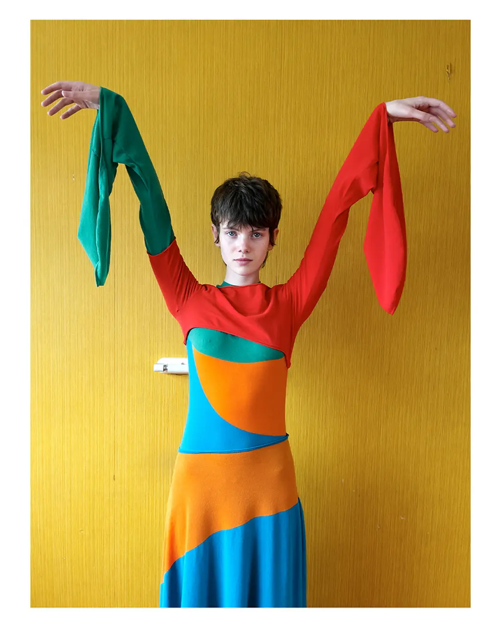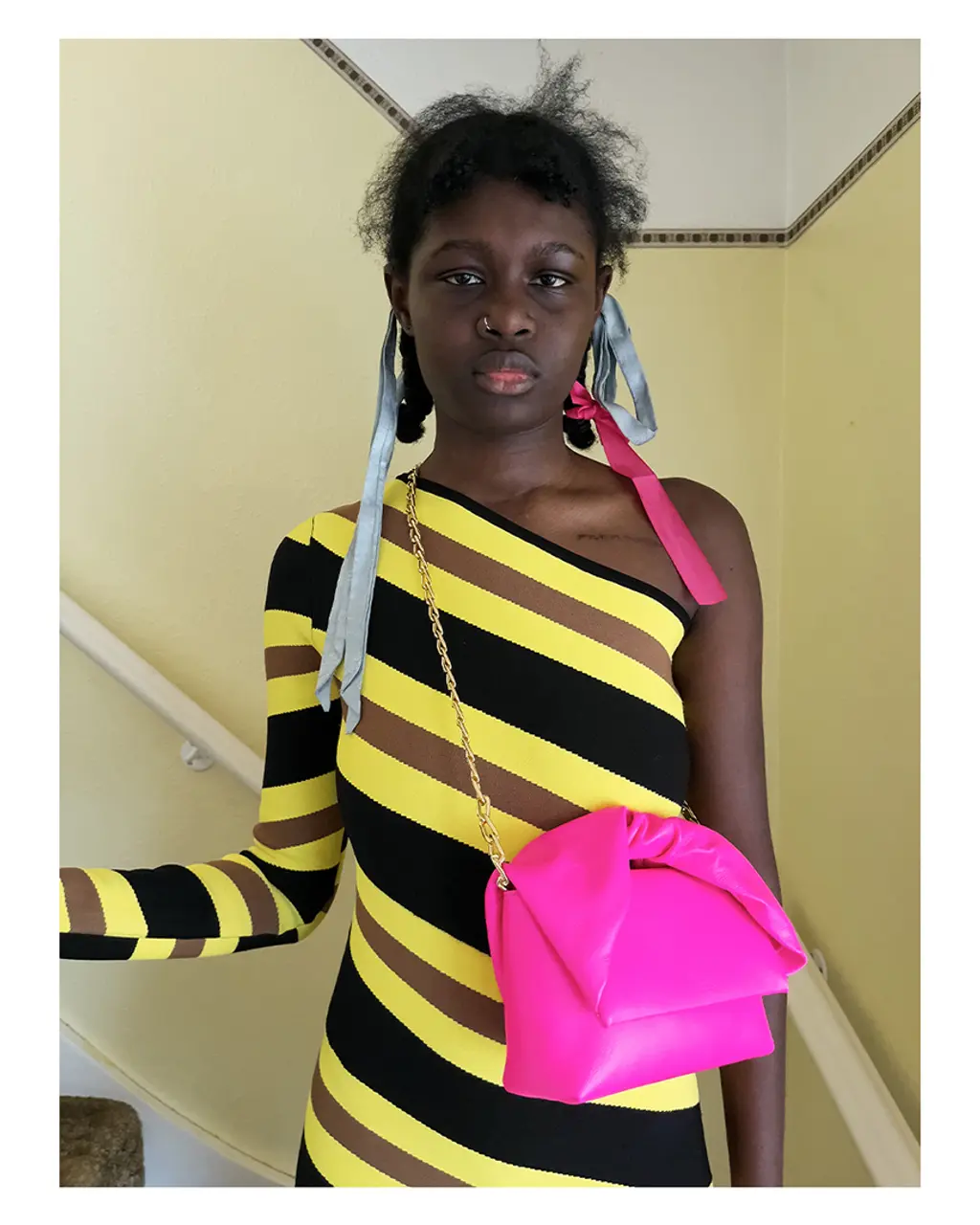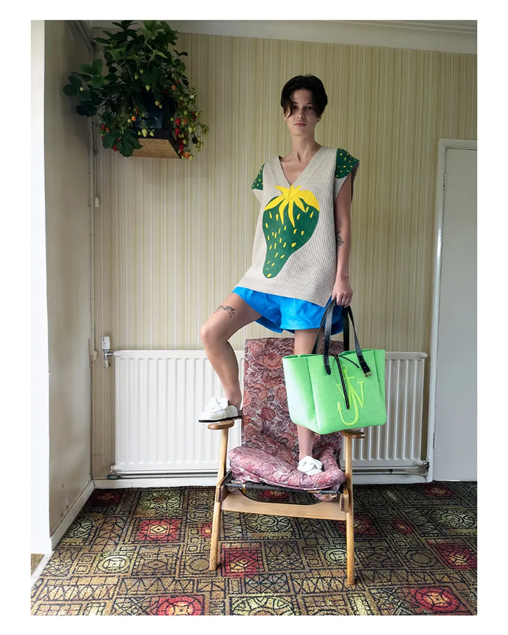 The collection, then, is a closed-door affair – an act of self-expression, singing into a can of hairspray and letting loose far from the prying eyes of judgement. Carefree youth is immortalised in strong shades of acid-pink, green, yellow, electric-blue and orange for the Men’s collection. The central character is “the lad” in the midst of a sexual awakening, experimentation and altered domesticity. Shot throughout a derelict house, JW Anderson’s boys are ambiguous, questioning – but enjoying – their desire for the outlandish. Running shorts become short-shorts, tracksuits are bold and printed.