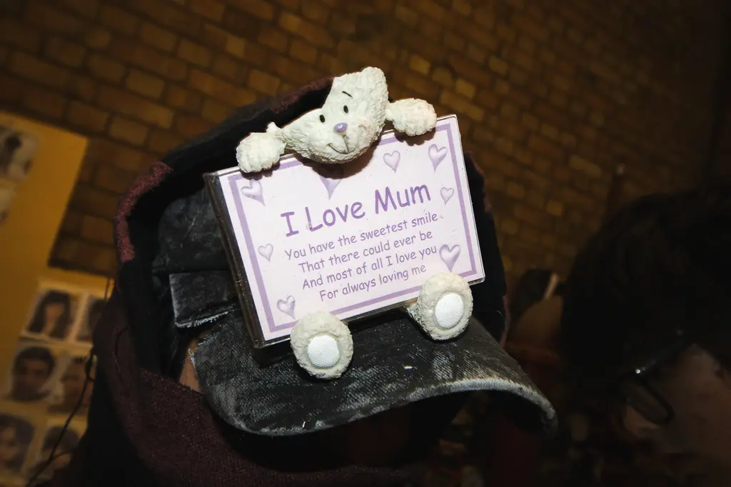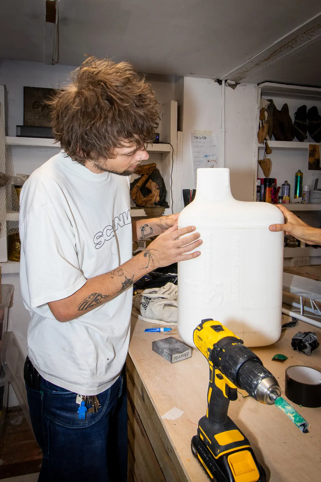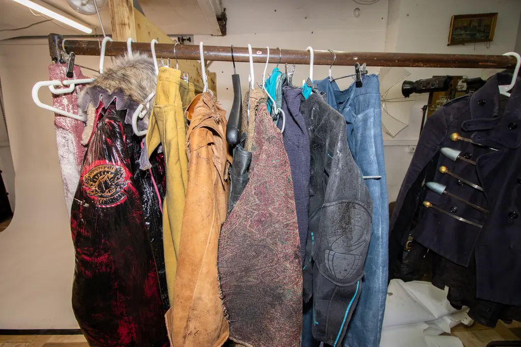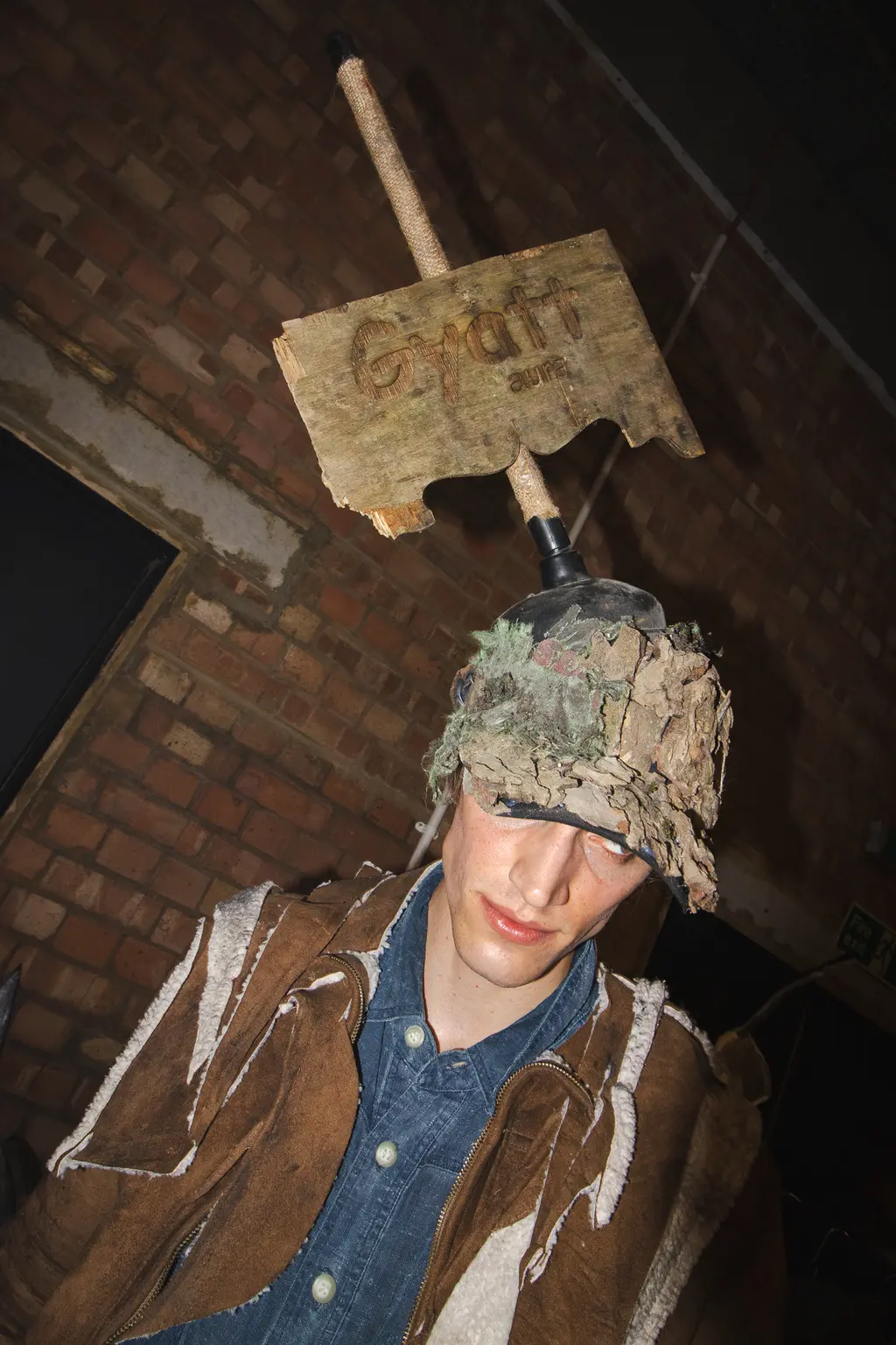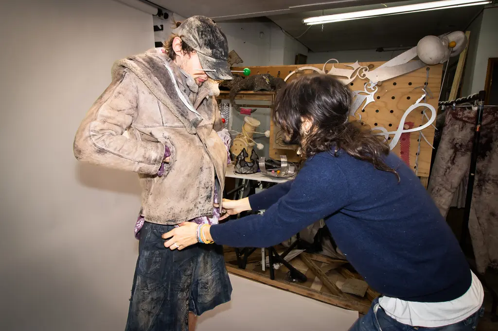 Beer in hand, I flip through rails: zip-up jackets with shoe trees hanging from dirt-encrusted shoulders; old wetsuits reworked into hoodies; a cap topped with an animal skull melting into a trailing veil. “We’ve picked shit up off the streets,” Kai says, “Traid let us raid their pile of unsellable garments, Corvidae donated offcuts and funded the metal props.” It’s ‘texturing week’ when I visit, and interns are rubbing flour and seasonings into fabric for colour. Ragged wings take shape from folding chair legs. Kai says he loves preexisting materials because they already have a life. “My favourite trousers are the ones I’ve worn for four years straight. The rips, the fading, the stains, the scuffs are what I like.”
