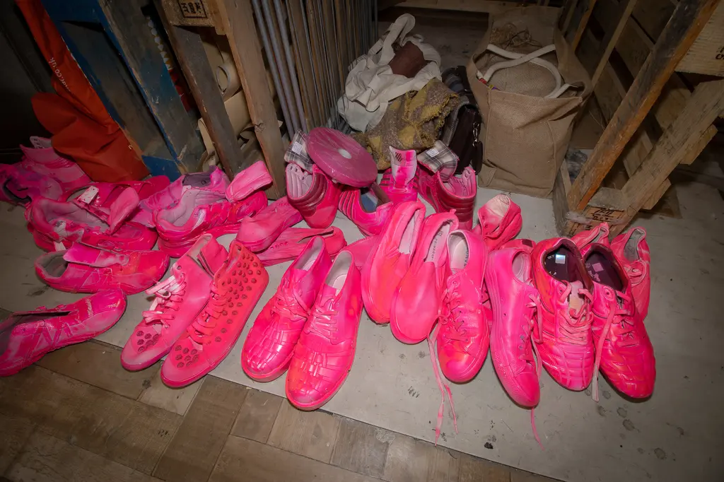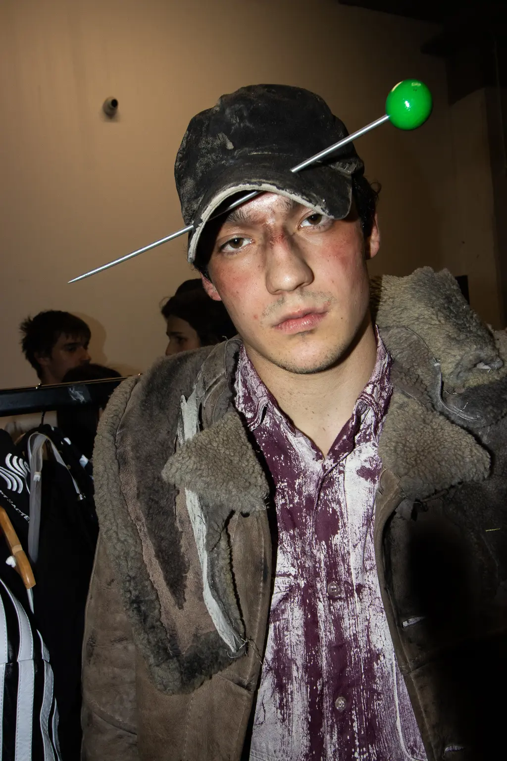 Kai had ten interns working on the collection, plus set designers, a stylist, a casting director, and a prosthetics artist for the show. And they’re all working for free. Why? “By going out and partying I met everyone who’s contributed,” he says. “They’re all friends. And this project gives them a chance to experiment with their own ideas. The interns have as much chance to get their work in the collection as I do.” Officially scheduled three days a week, the team members often also show up for the Friday night drinks. “We get fucked up and then come back hungover, some of what happened last night inspiring what we make today,” Kai explains. “Anyone that only works, their work has absolutely no life to it.”