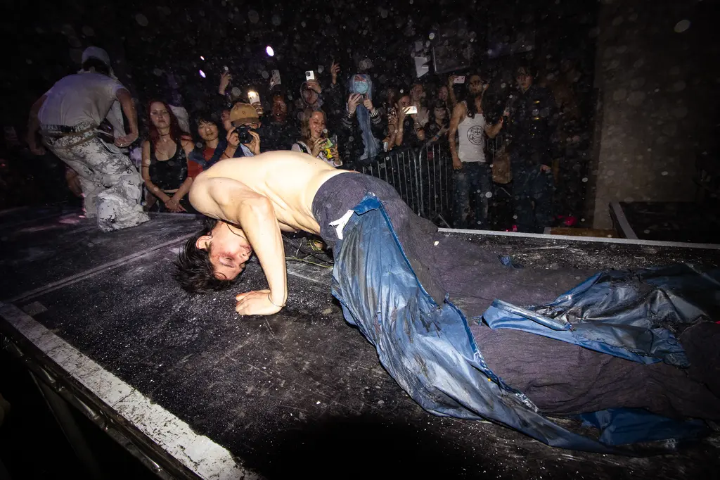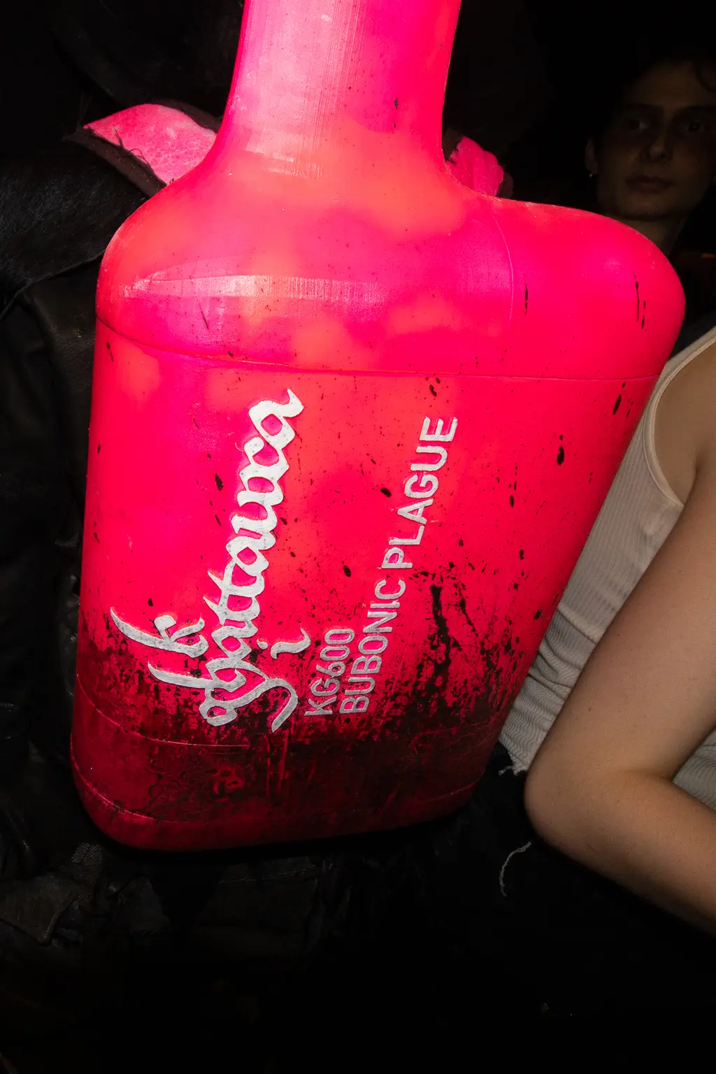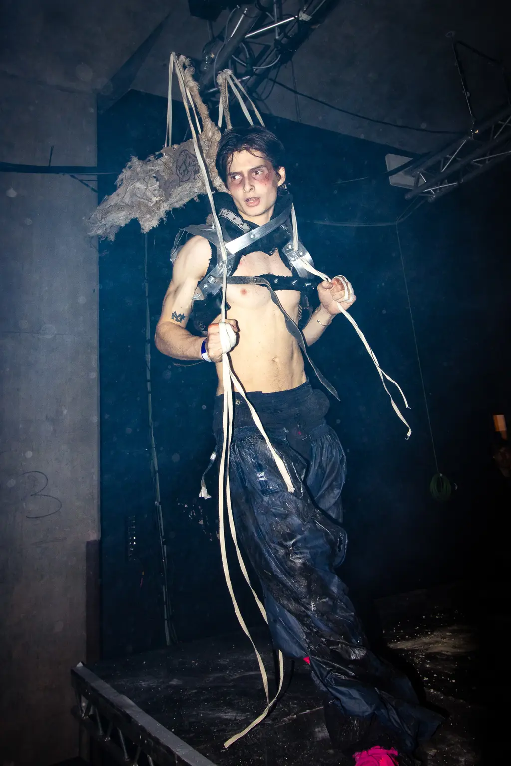 Rusted swords, gauntlets, and shields come later, all paired with these ragtag, weathered, but wearable clothes. A smoking neon backpack in the shape of a Lost Mary – apparently‘bubonic plague’ flavoured – makes its entrance before the final line-up. But instead of retreating backstage, the models stay for a rave. Kai runs down the runway, jumps behind the DJ decks, and kicks off a hardcore set. The whole design team follows, the crowd jump onto the runway with the models, a writhing mass of bodies ensues. It’s a scene that’s probably too chaotic for the luxury fashion industry. But for the small crowd who experienced it, A Scattered Dream will long haunt their memories.