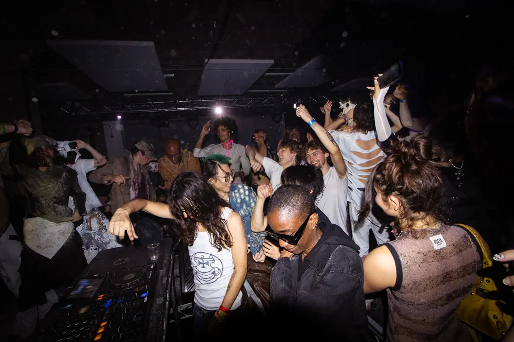 Rusted swords, gauntlets, and shields come later, all paired with these ragtag, weathered, but wearable clothes. A smoking neon backpack in the shape of a Lost Mary – apparently ‘bubonic plague’ flavoured – makes its entrance before the final line-up. But instead of retreating backstage, the models stay for a rave. Kai runs down the runway, jumps behind the DJ decks, and kicks off a hardcore set. The whole design team follows, the crowd jump onto the runway with the models, a writhing mass of bodies ensues. It’s a scene that’s probably too chaotic for the luxury fashion industry. But for the small crowd who experienced it, A Scattered Dream will long haunt their memories.