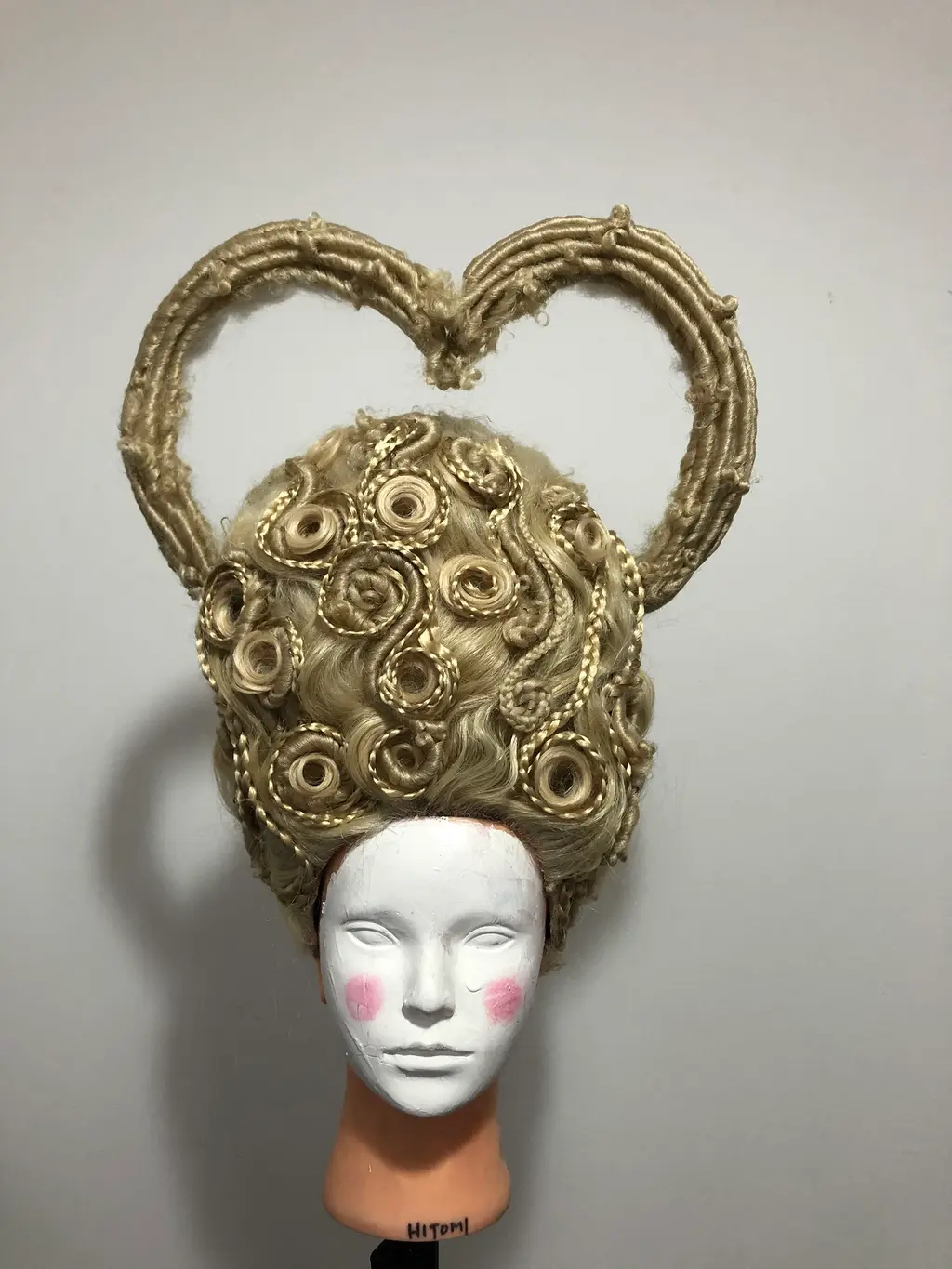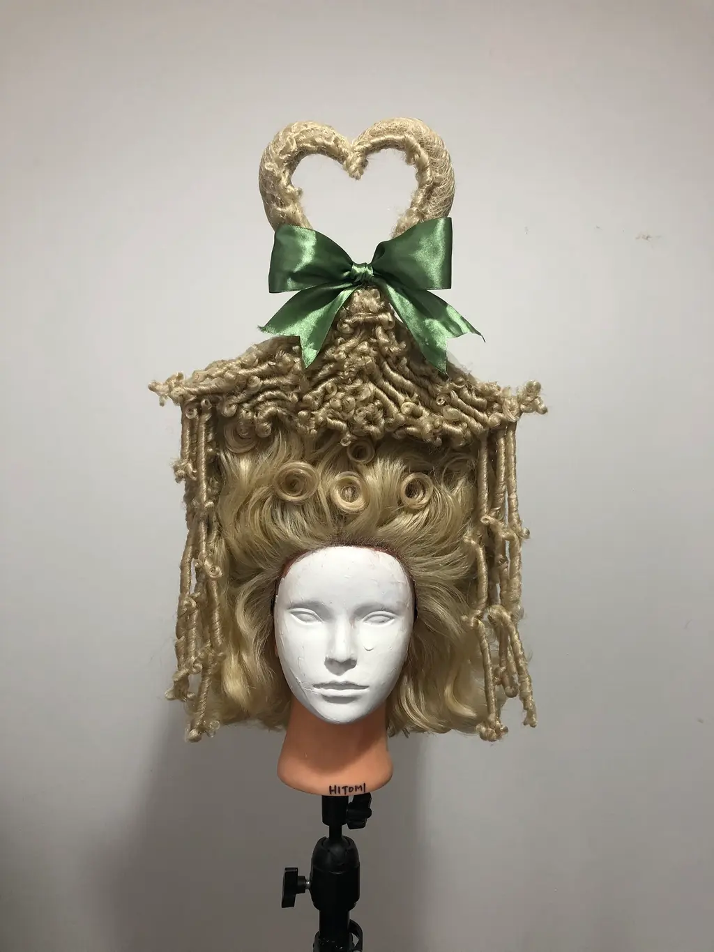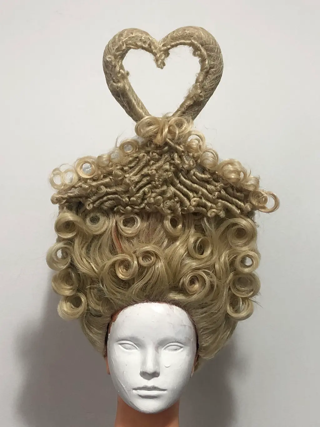I based the wigs on something with meaning for this situation in lockdown. I was inspired by the stamp on Instagram: “Stay at home for the NHS”. In the 18th century, [the French] invented the “pouf” hairstyle where they would build the hair high with over the top decoration. This gave me the idea to build a home and rainbow heart on the top.