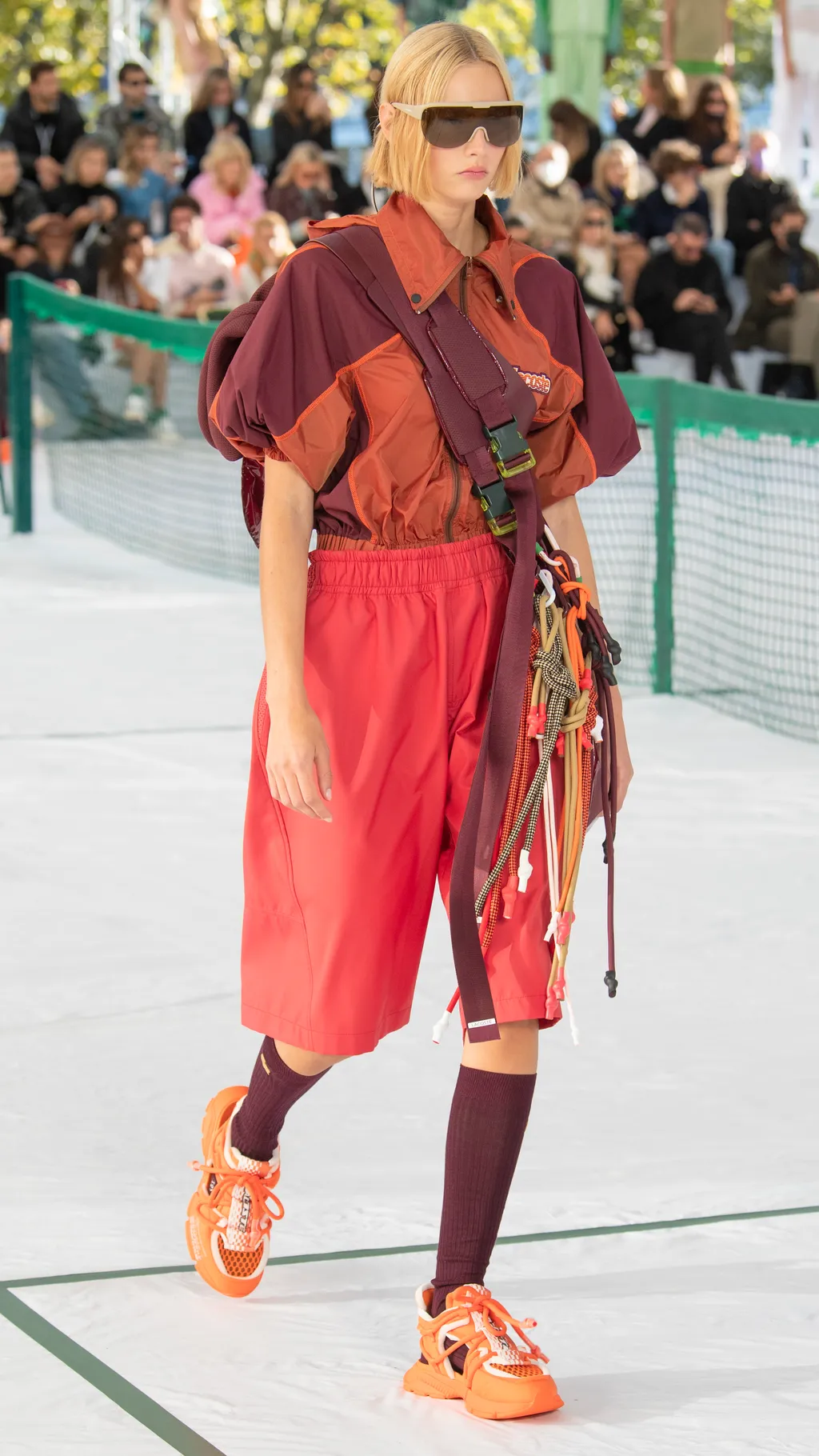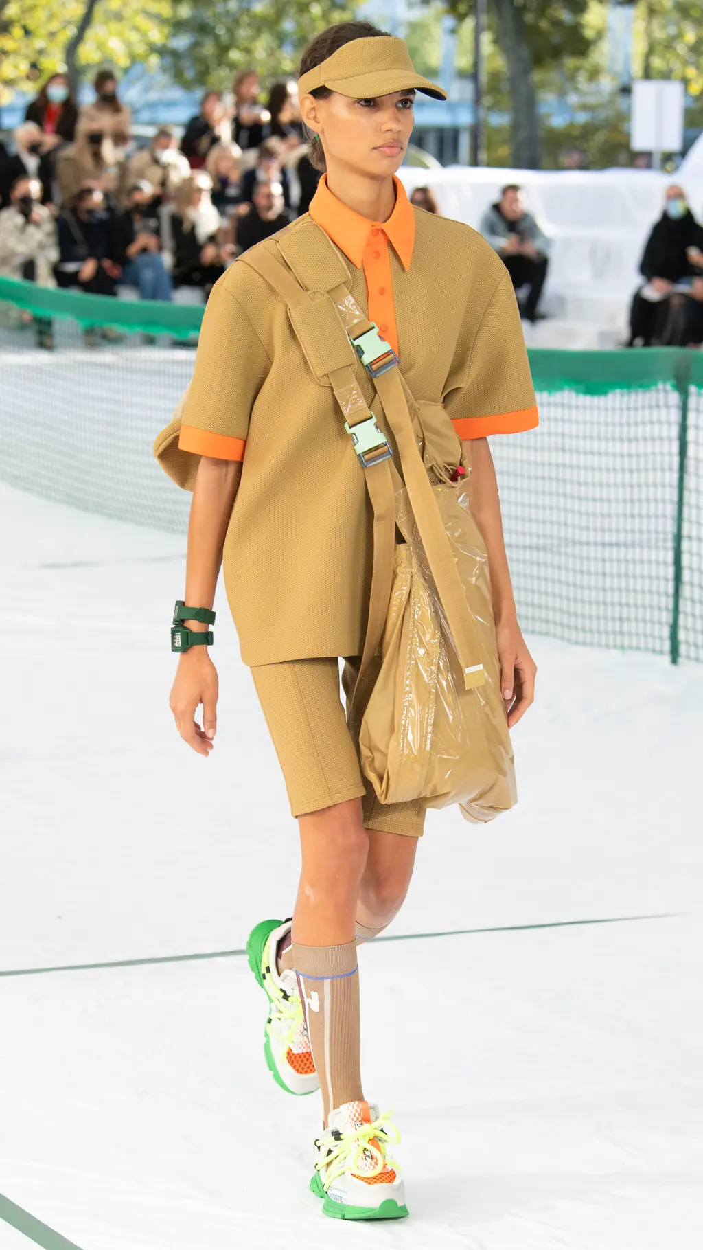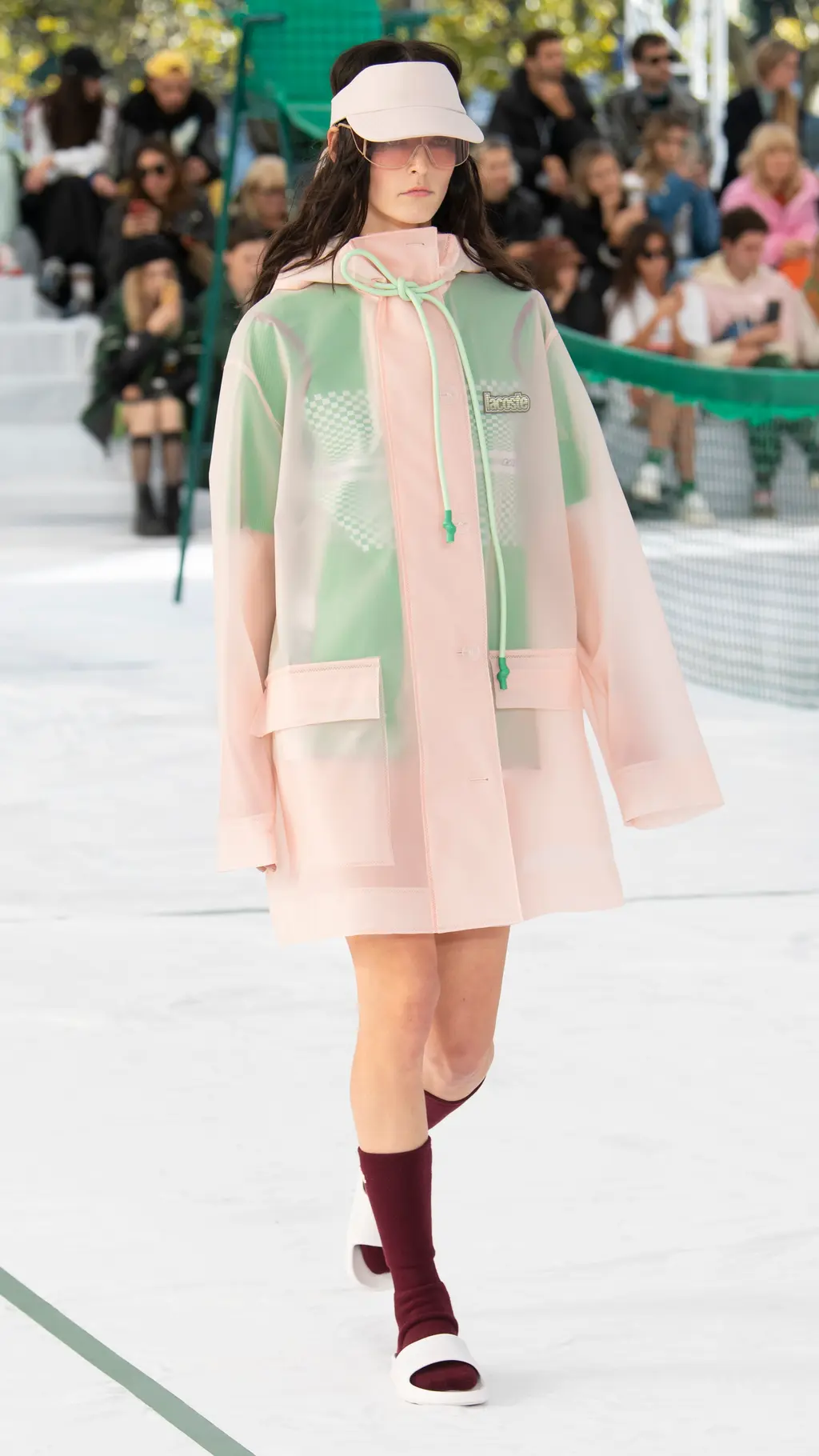 There were pleated tennis skirts reimagined in frosted pastel rubber, shorts suits, bandeaus and varsity jackets cut from neoprene piqué jersey, and classic Lacoste polos remade in printed mesh. Mesh logo panelling could also be found across cycling vests, track shorts and basketball tanks which were accessorised with cushioned visors, athletic socks and pool slides. Meanwhile, trainers with bungee cord lacing, pastel carabiner keyrings, and climbing ropes dangling from shoulder bags all bolstered the collection’s commitment to its athletic theme. The result was a hybrid collection of disparate athleisure tropes from across all sporting subcultures.