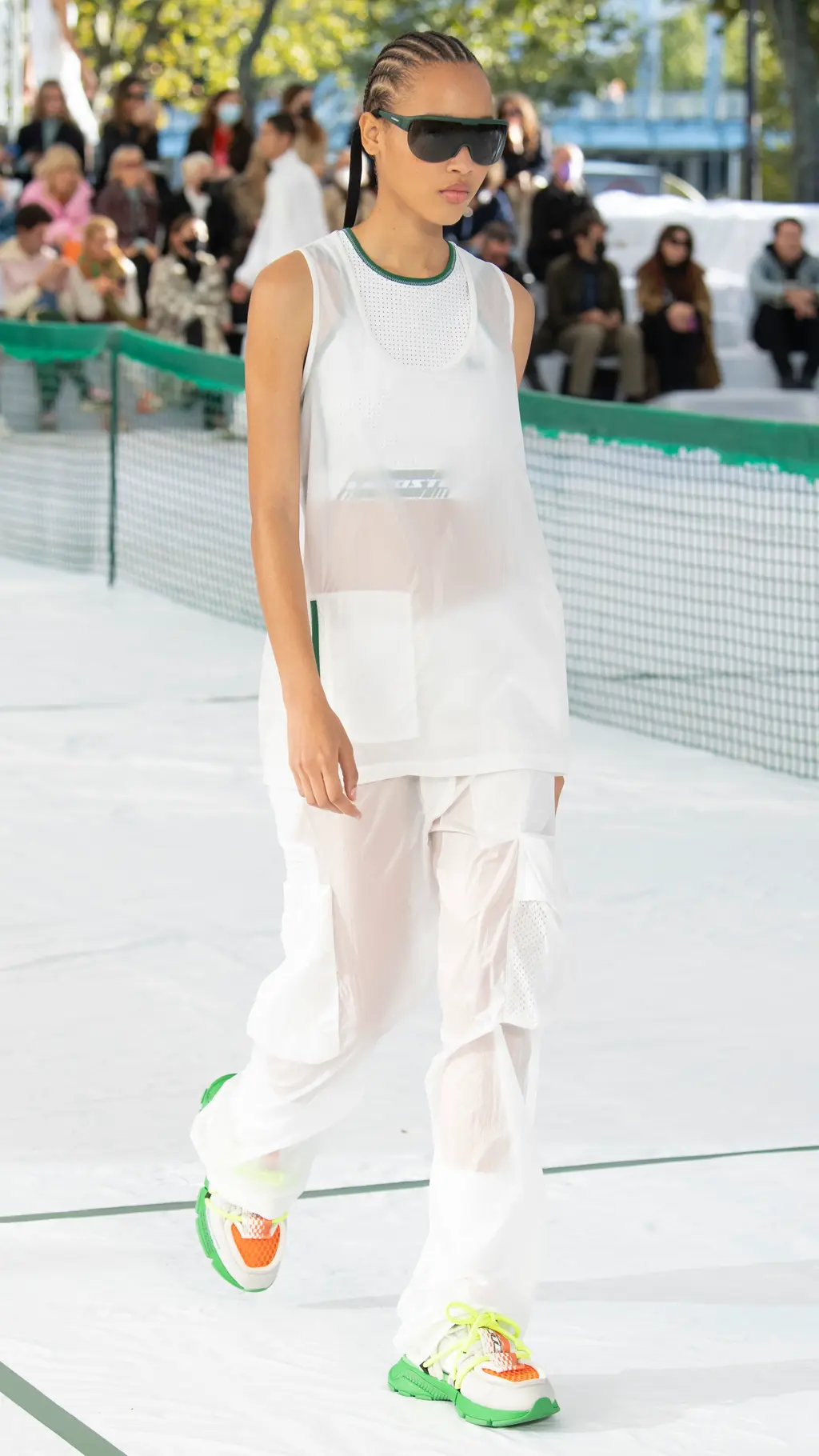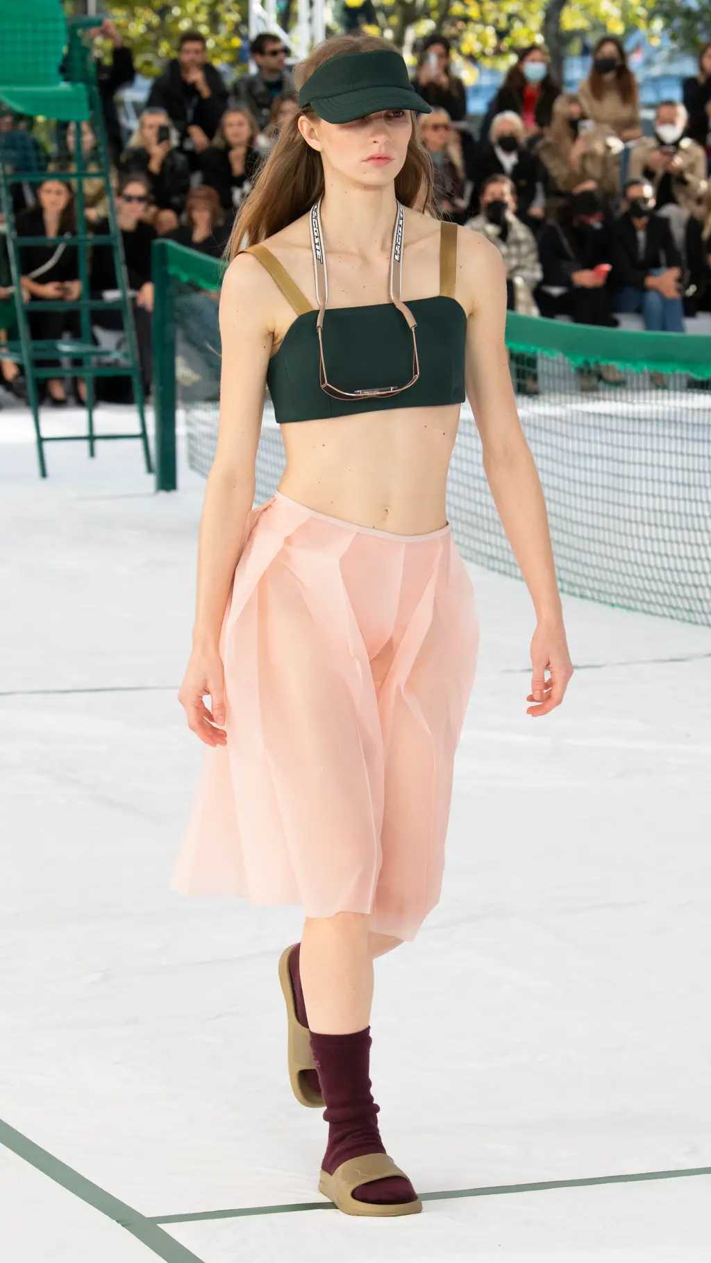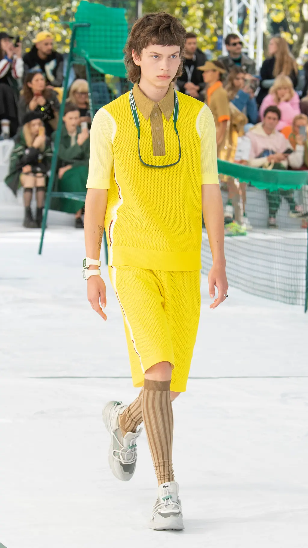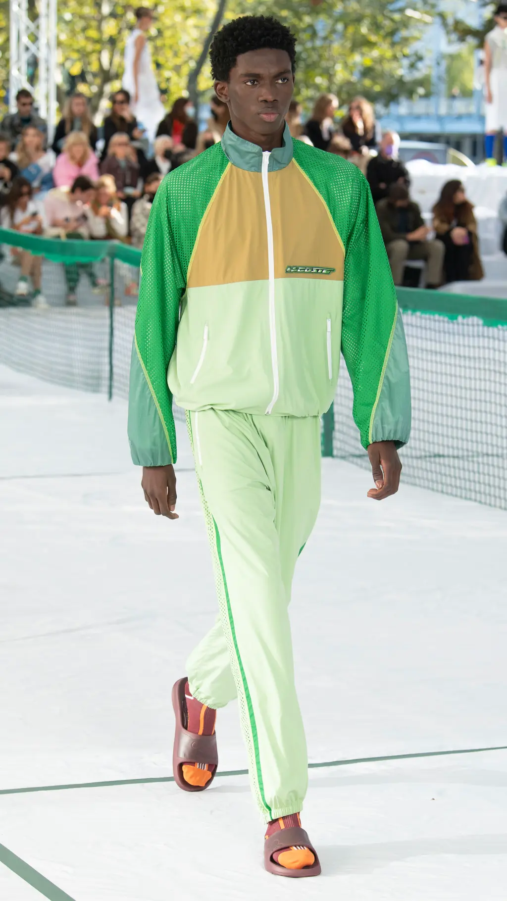 There were pleated tennis skirts reimagined in frosted pastel rubber, shorts suits, bandeaus and varsity jackets cut from neoprene piqué jersey, and classic Lacoste polos remade in printed mesh. Mesh logo panelling could also be found across cycling vests, track shorts and basketball tanks which were accessorised with cushioned visors, athletic socks and pool slides. Meanwhile, trainers with bungee cord lacing, pastel carabiner keyrings, and climbing ropes dangling from shoulder bags all bolstered the collection’s commitment to its athletic theme. The result was a hybrid collection of disparate athleisure tropes from across all sporting subcultures.