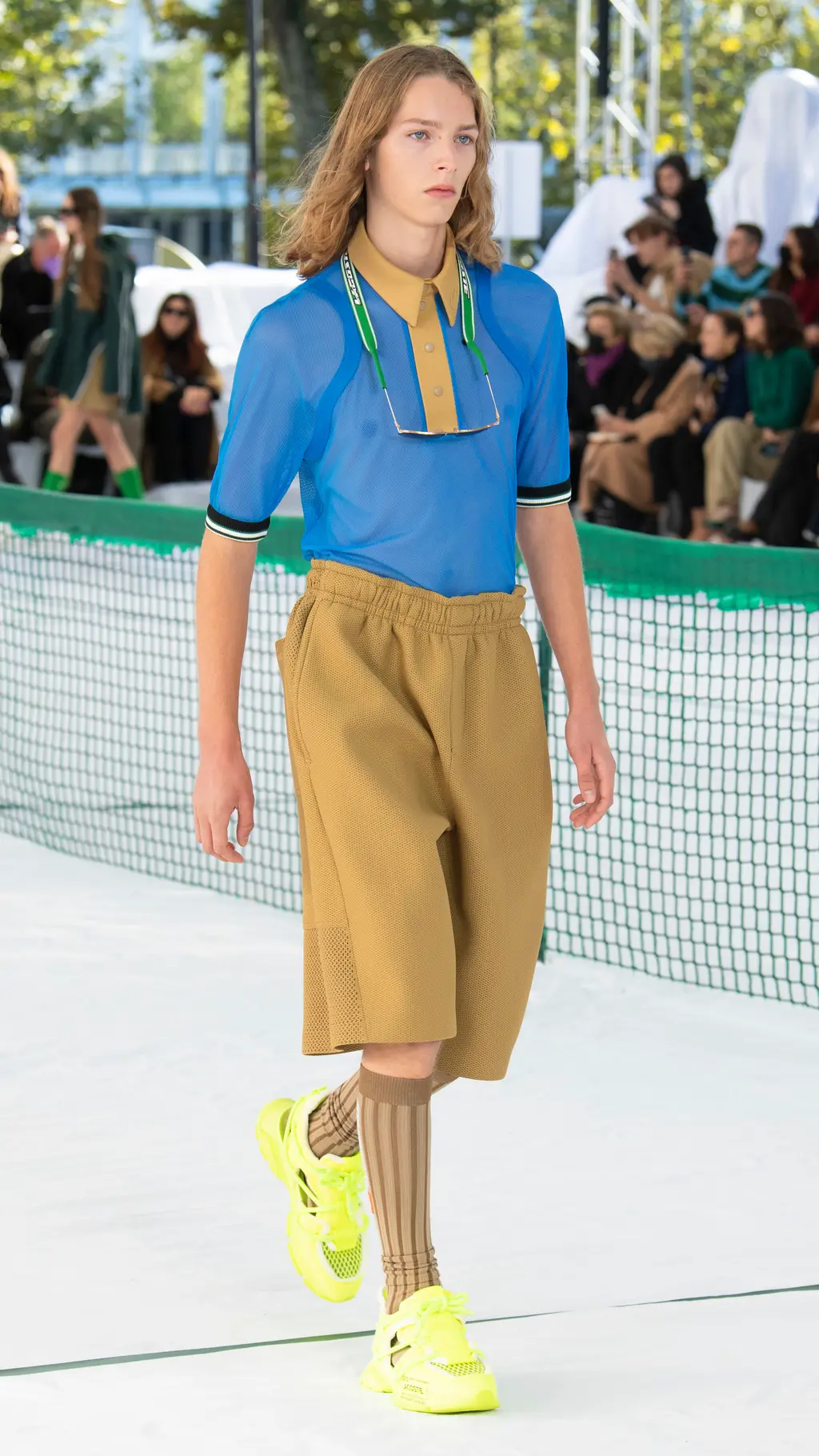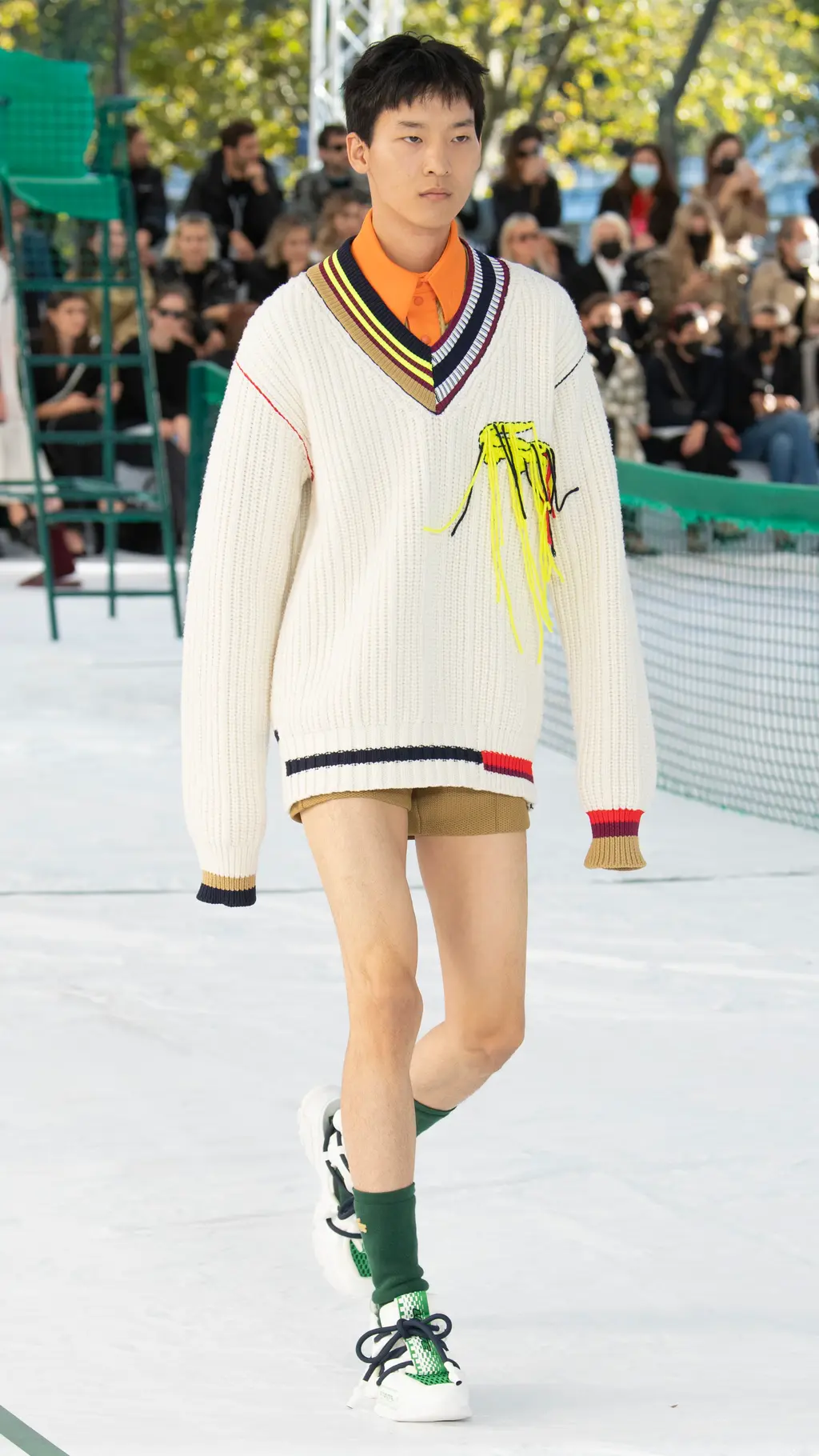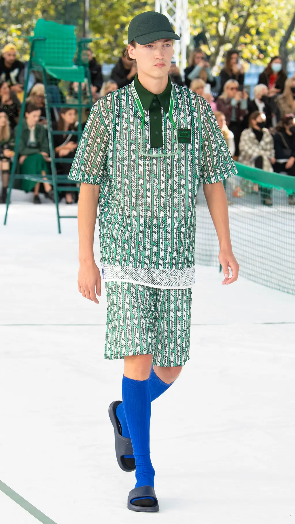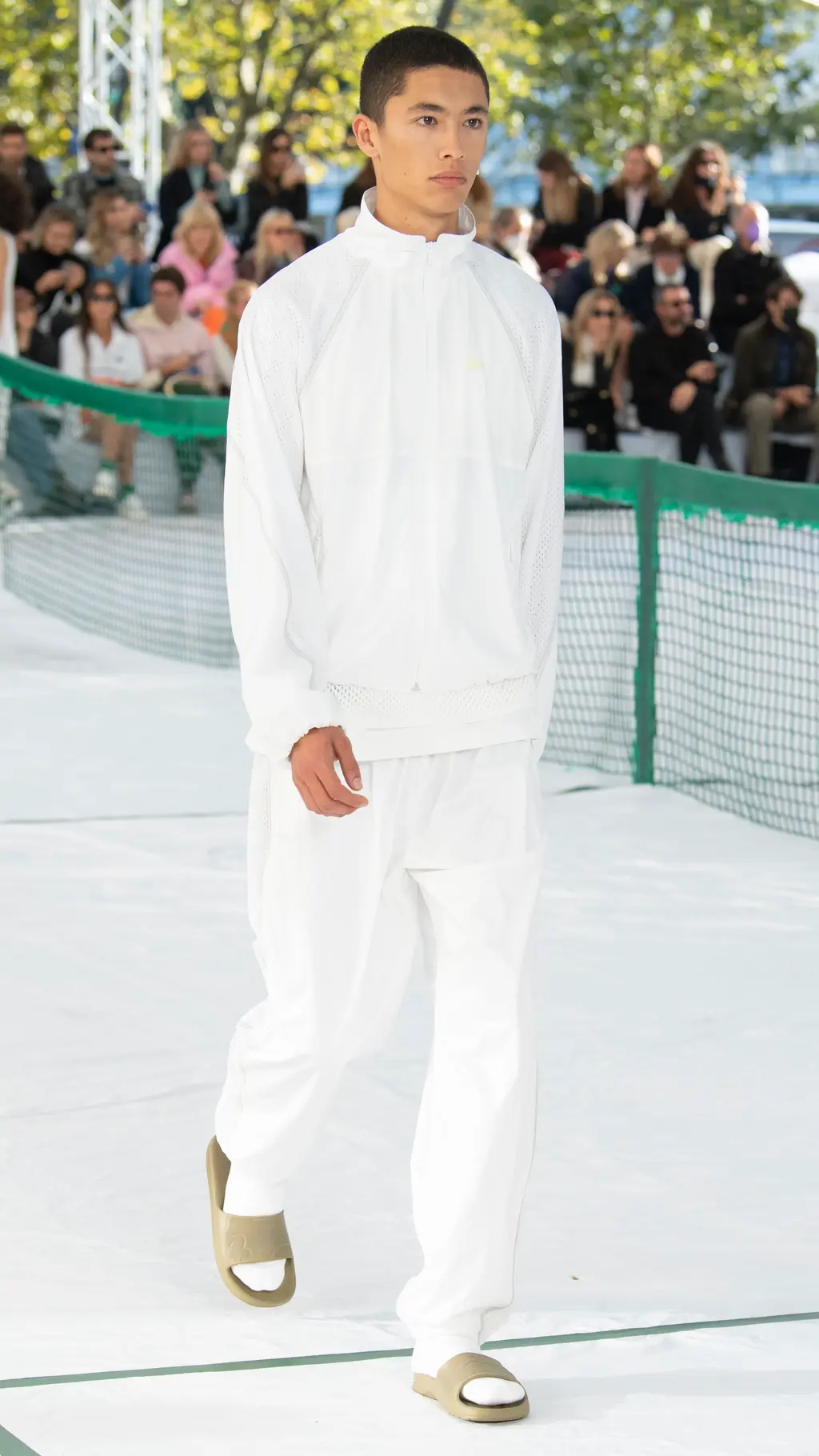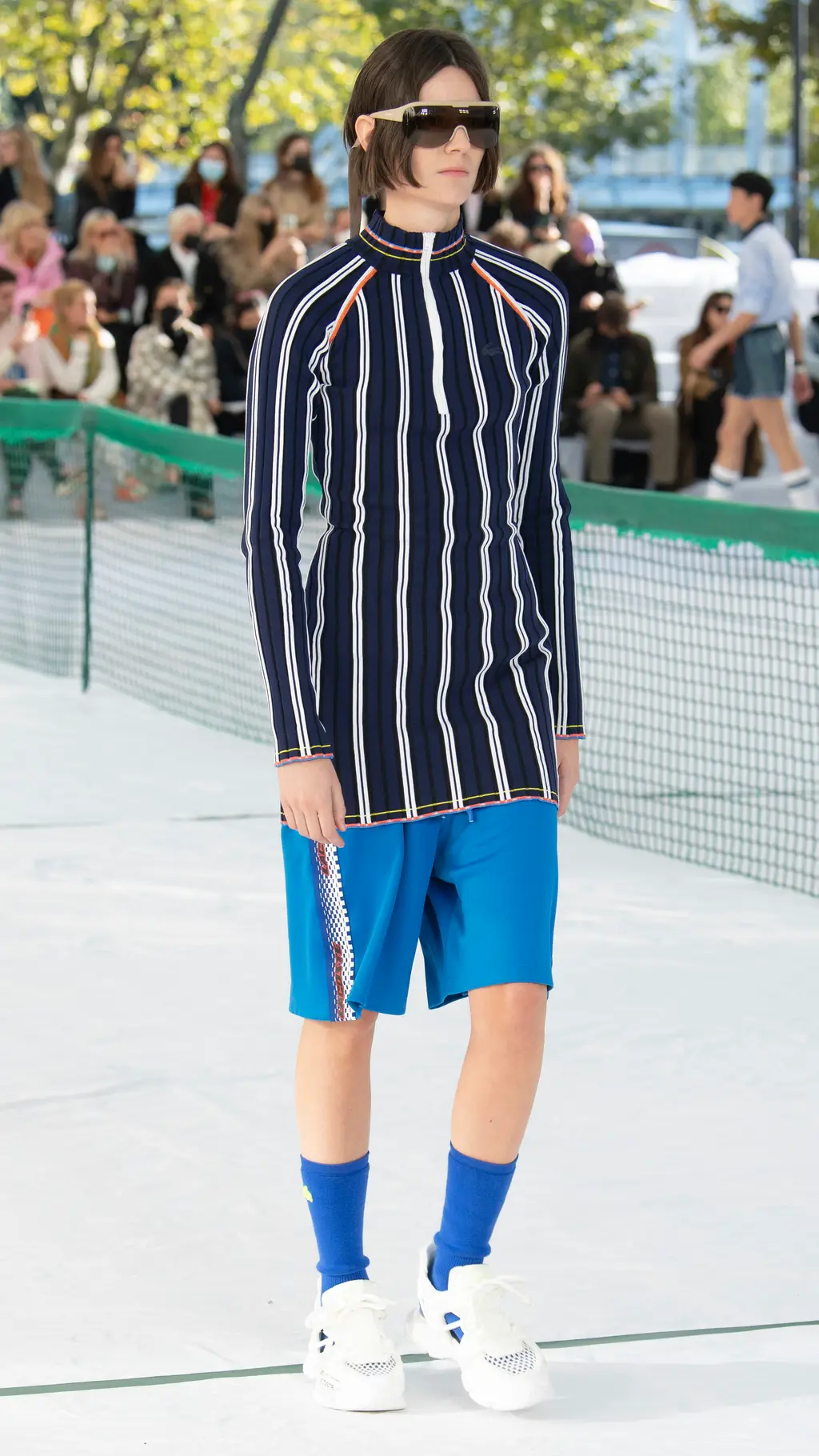 Founder René Lacoste’s legacy and the jeu de paume beginnings of the brand were front and centre at Tuesday’s Spring/Summer 2022 show – quite literally. A long tennis net and umpire’s chair featured at the centre of the show space on Palais de Tokyo’s esplanade, a favoured hangout of Parisian skateboarders. Meanwhile, marks on the nylon floor accurately mimicked those of a tennis court.