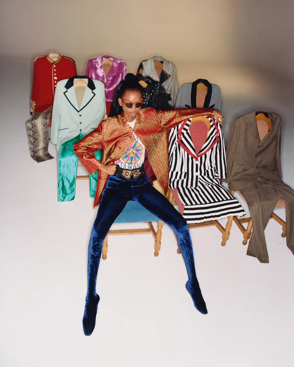 On the chair, front row, from left to right: suit Dunn & Co., jacket Vintage, trousers Vintage. Second row, left to right: jacket Auck Land, jacket Vintage, trousers Kenzo. Third row, left to right: jacket Versace, jacket Vintage from Crazy Clothes Connection.