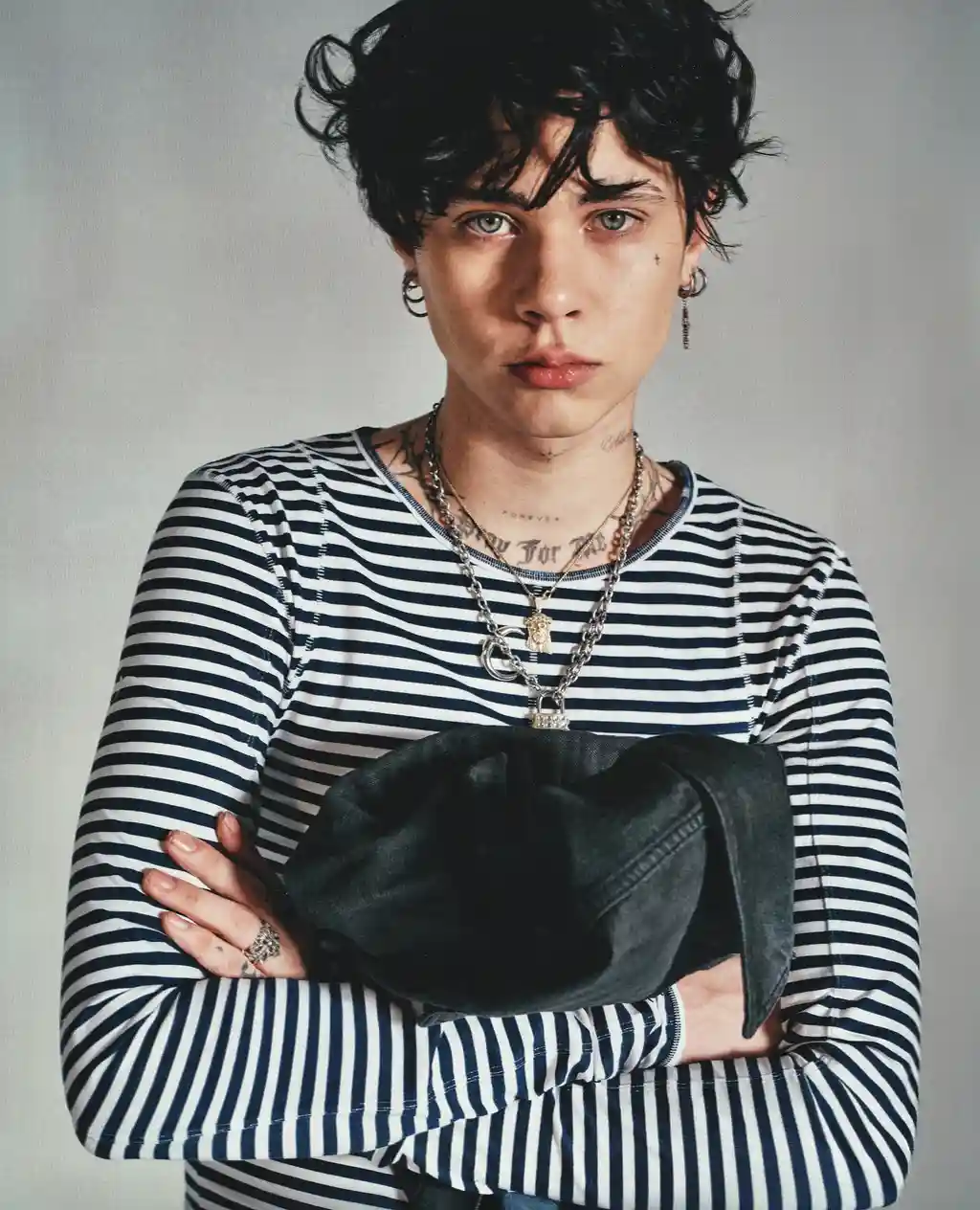 Elsewhere, you’ll find holed crew necks, slouchy black cottons, a cheeky breton and a belt studded with what looks like cigarette lighter caps. Basically, everything you need to dress like it’s 2004. Emos and e‑kids, rise!