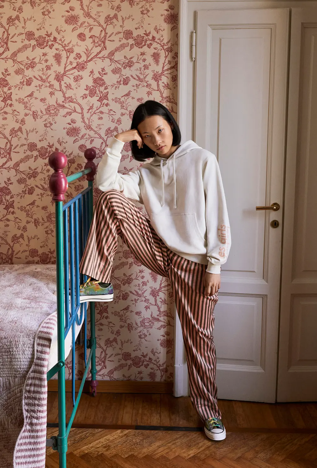 In terms of things to enjoy, there’s a striped pyjama set, along with soft hoodies and T‑shirts adorned with the Les Girls Les Boys logo. Elsewhere, ribbed knit bralettes and high-waisted briefs are styled with soft-touch sweatpants. The idea is that they can take you from “bed to street”, mixed and matched with anything in your wardrobe – perfect for the Sunday morning trip to the offie for a pint of milk.