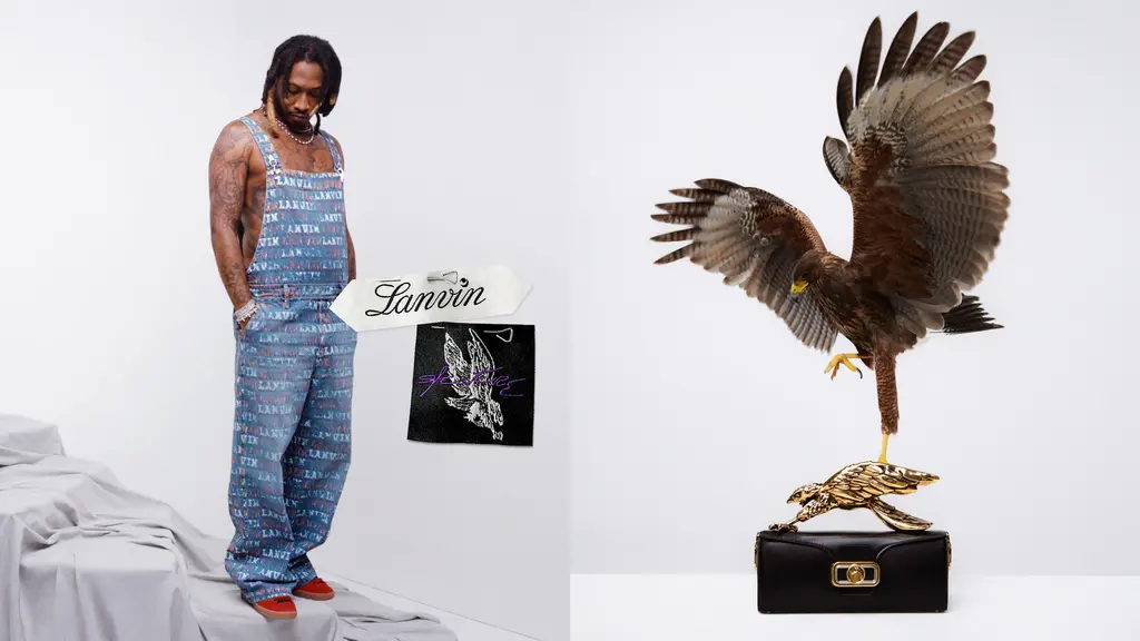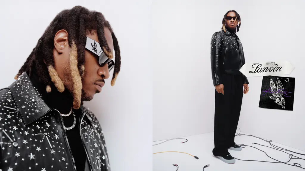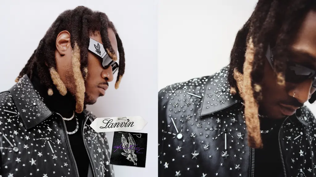 Lanvin announced a new collaboration with none other than Atlanta’s finest export, Future. The unisex collection, titled Lanvin Lab by Future, is inspired by the rapper’s nickname Pluto, a symbol of “regeneration and transformation to achieve a new perspective”. That all takes shape in a lotta layering and slick tailoring, while leaning into Future’s knack for accessorising, namely in the faux fur hats, dark, angular sunglasses and leather gloves. Elsewhere, there’s an embroidered varsity jacket, pockets-a-plenty, printed dungarees and custard yellow tracksuit bottoms.