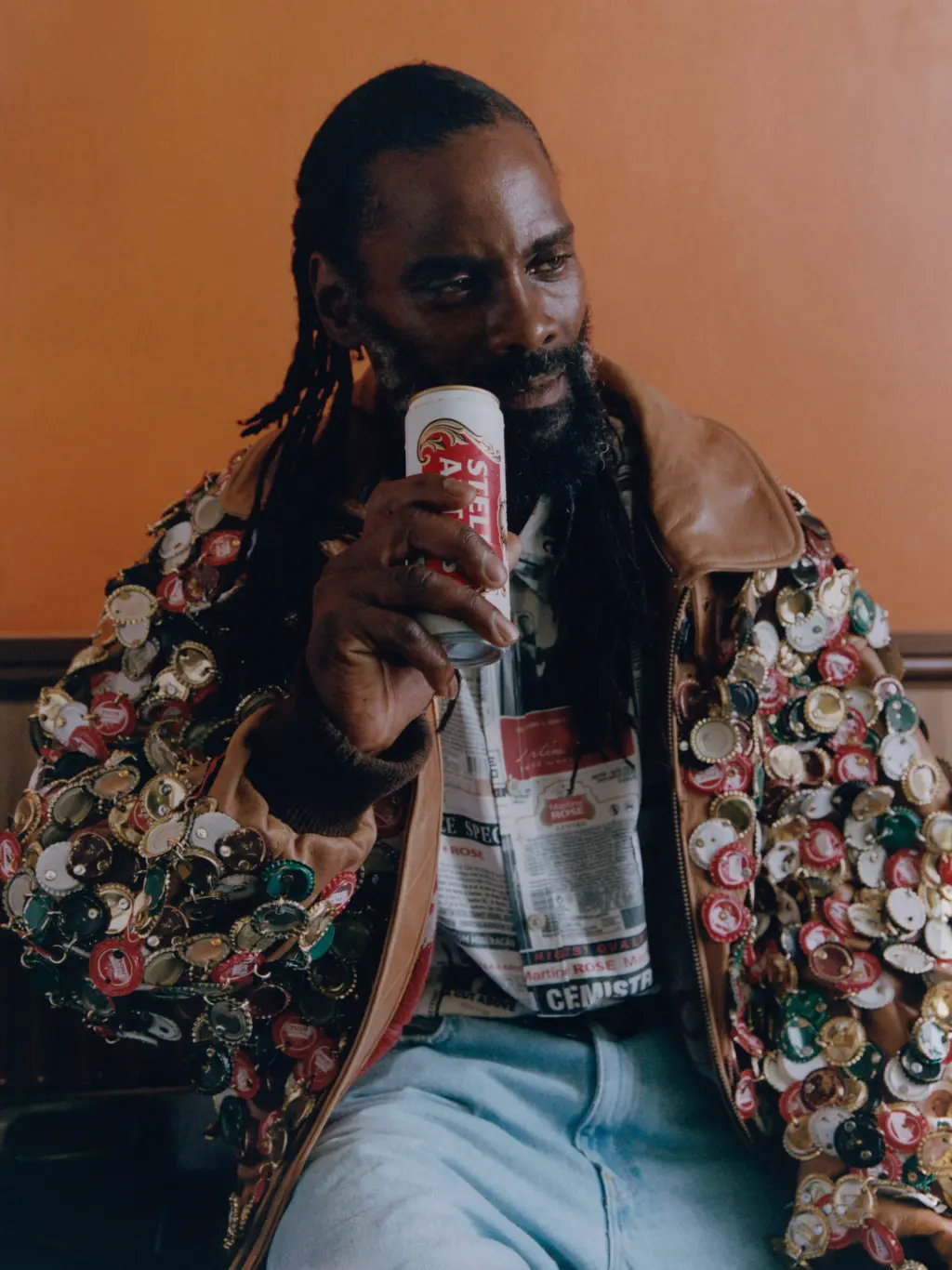 It was sweltering at Martine Rose’s SS24 show back in June, which was held in a community centre in North London. But to keep things cool during the heatwave ice-cold cans of Stella were handed out to guests. Ahh. That was but a hint for what is now a bonafide collaboration between the much-loved British designer and the Belgian beer brand. Influenced by the spirit of punk, the collection includes an oversized bomber jacket with Rose incorporating beer mat towelling into jacket linings and Stella’s glass bottle caps patchworked all over the front. There’s also a distressed pair of jeans covered in special Stella x Martine patches, an oversized graphic tee and a buttoned shirt that features photography from Rose’s show and an all-over newspaper motif that nods to British tabloid culture. We’ll cheers to that.