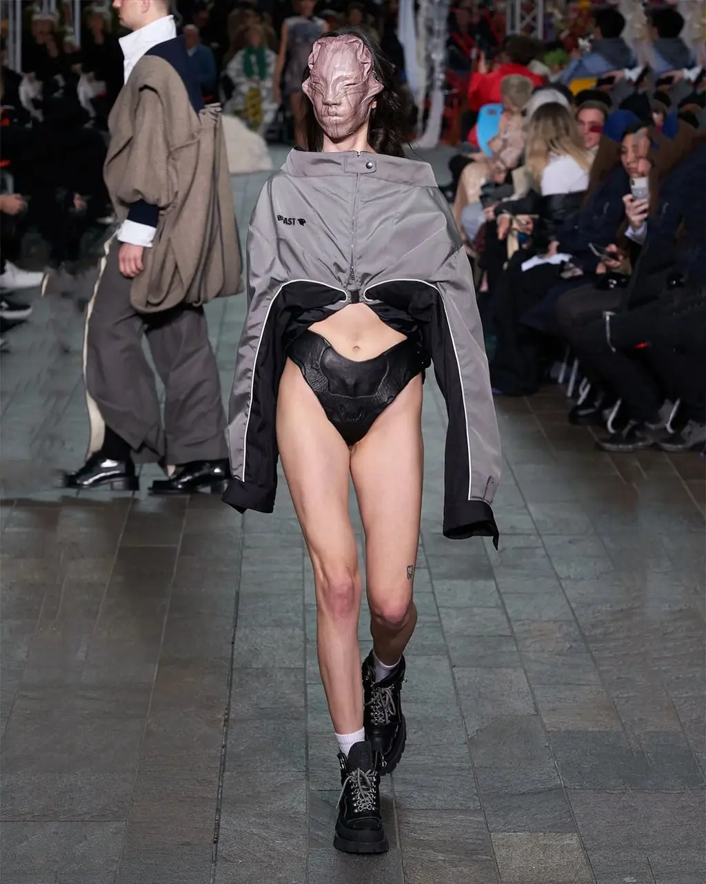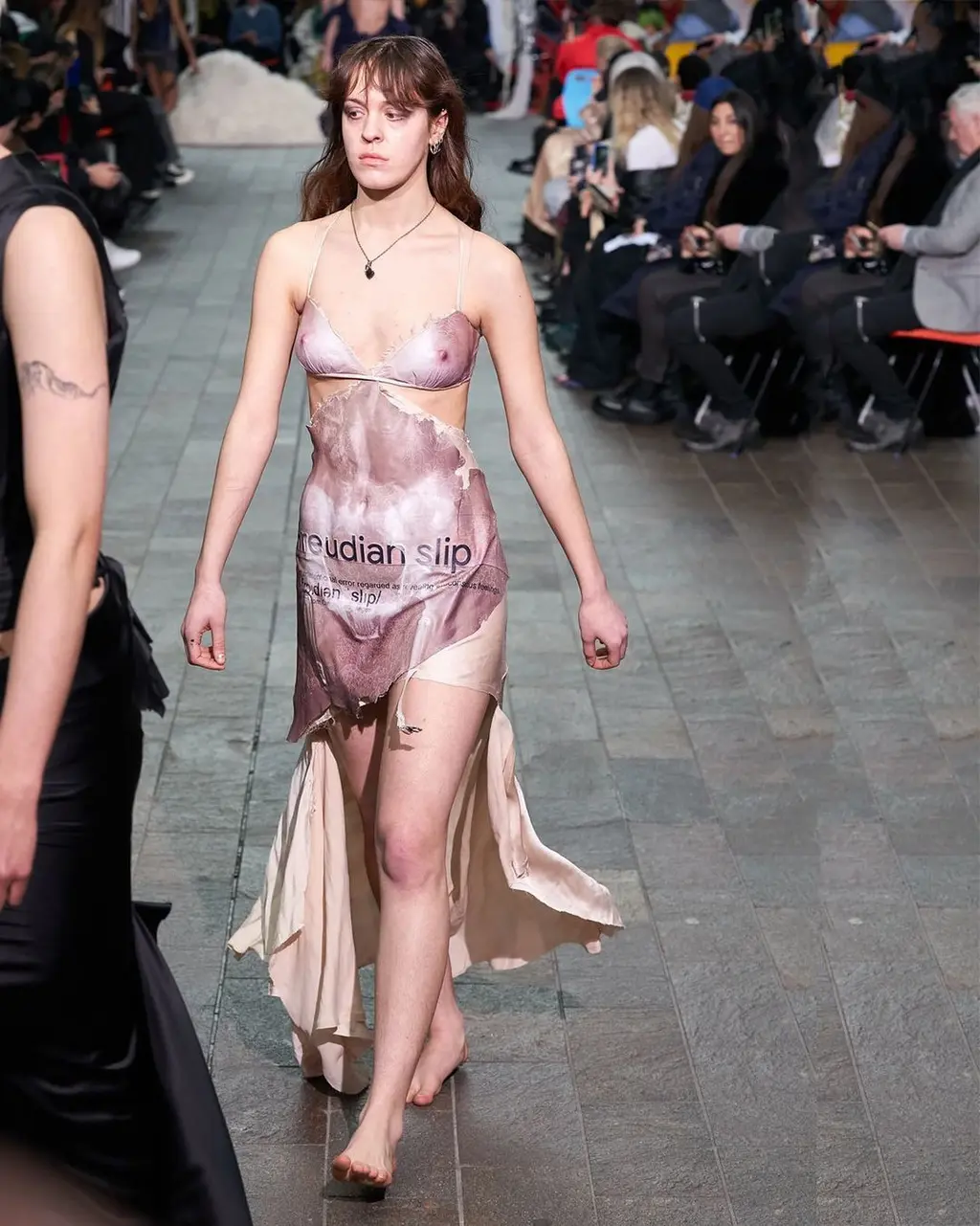 Full of attitude, nightmarish spells and distorted figures, it was, after all, “about a girl turning into a beast,” as the London-based womenswear designer describes it. Influenced by psychiatry as much as it was the female form, Keane’s looks used upcycled leather for trousers that resembled the legs of a woodland creature, an upside-down motocross jacket in repurposed Gore-Tex to form a straightjacket, and a “Freudian slip” print to shout loud on a deconstructed slip dress.