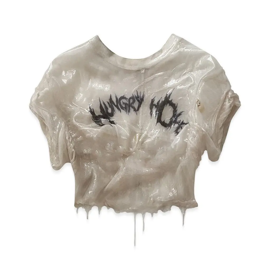 The beautiful chaos of Keane’s self-documentation reveals itself in her collection. Each look feels disruptive, torn apart and intrusive. Some fabrics appear almost bruised, while others cling onto the body as though soaked in sweat. And others are completely revealing, like a bra printed with an image of boobs.
