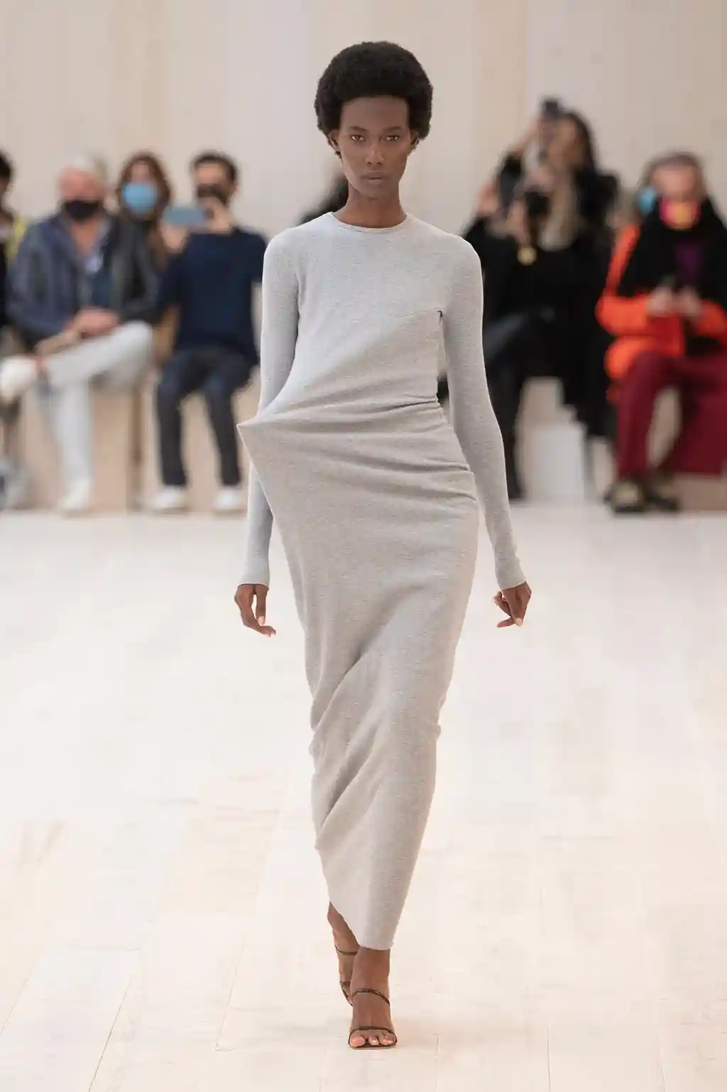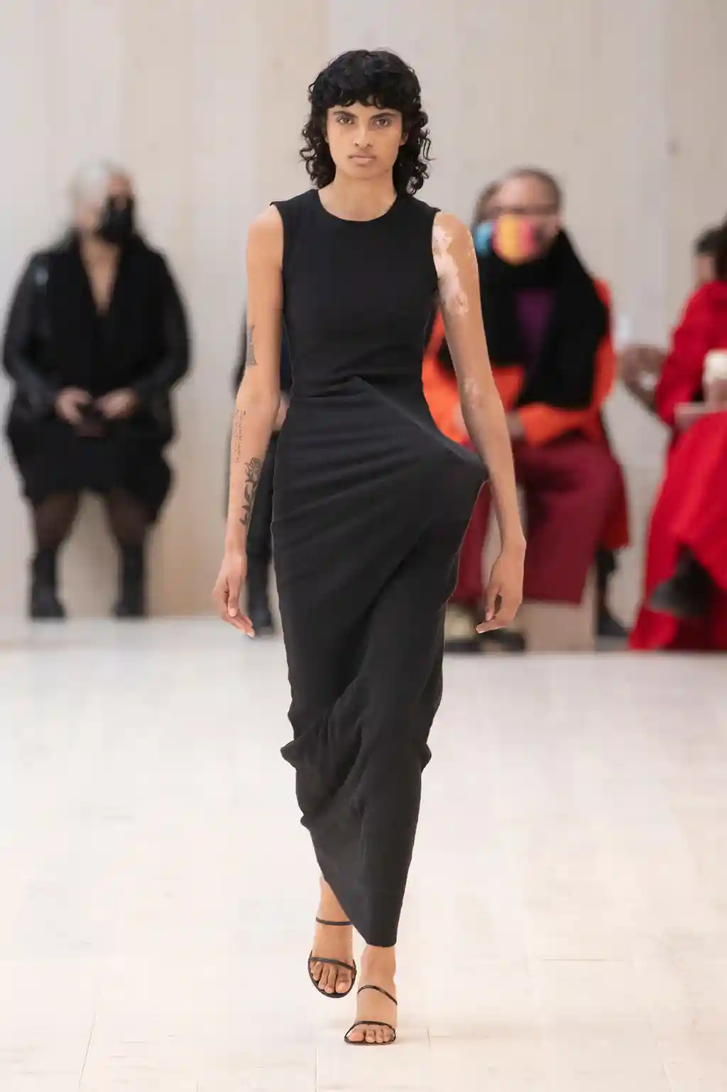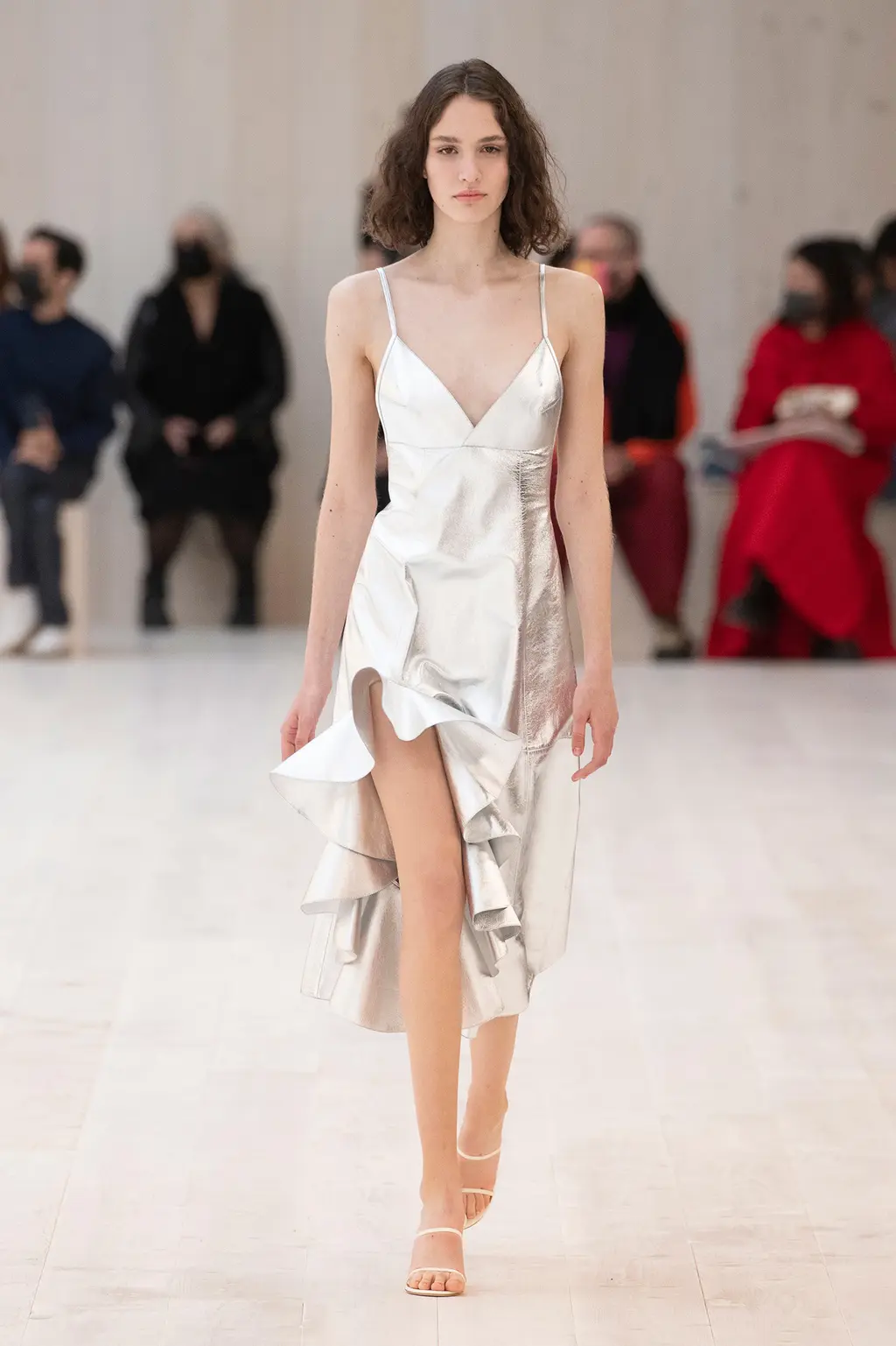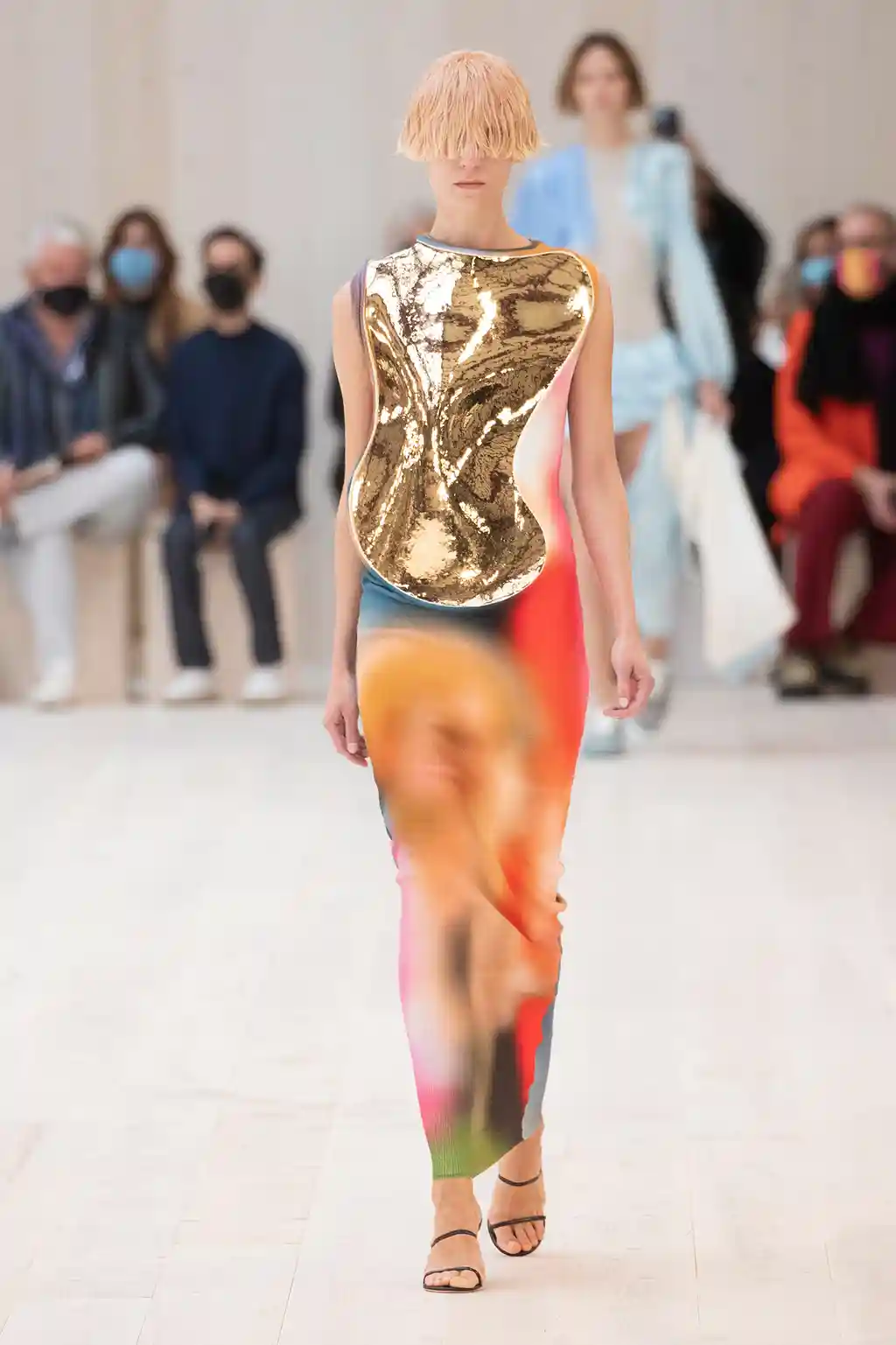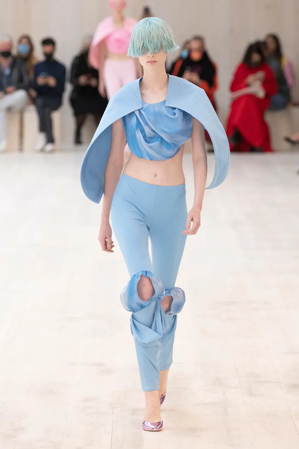Anderson integrated metal plates into coats and dresses, like a grey jersey dress with a great big spike poking out of it, to mesmeric effect. It was deeply unsexy – uncomfortable, even. But it seemed for SS22, Anderson was designing for a whole new dimension. Shapes became more sculptural as the looks progressed: leggings with holes cut in the knee, wing-like capes attached to the shoulder and gold torsos cast in resin. Never mind reduction – silhouettes took a life of their own, finding meaning outside of the body.