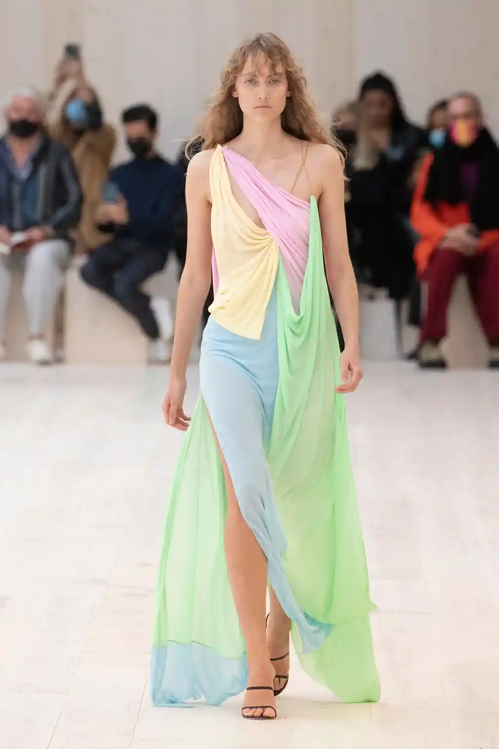 The draped matter of Pontormo’s paintings presented itself in spaghetti-strapped slip dresses and mint green fabric wrapped around as a mini skirt with bits trailing behind. There were even two head scarves draped around the head of two models walking behind one another in unison, taking the fallen folds of the artist’s religious gowns painted in the 1500s. By the last few looks, draping took its form in bits of multicoloured fabric placed together, Grecian in its final effect as it clung to parts of the body.