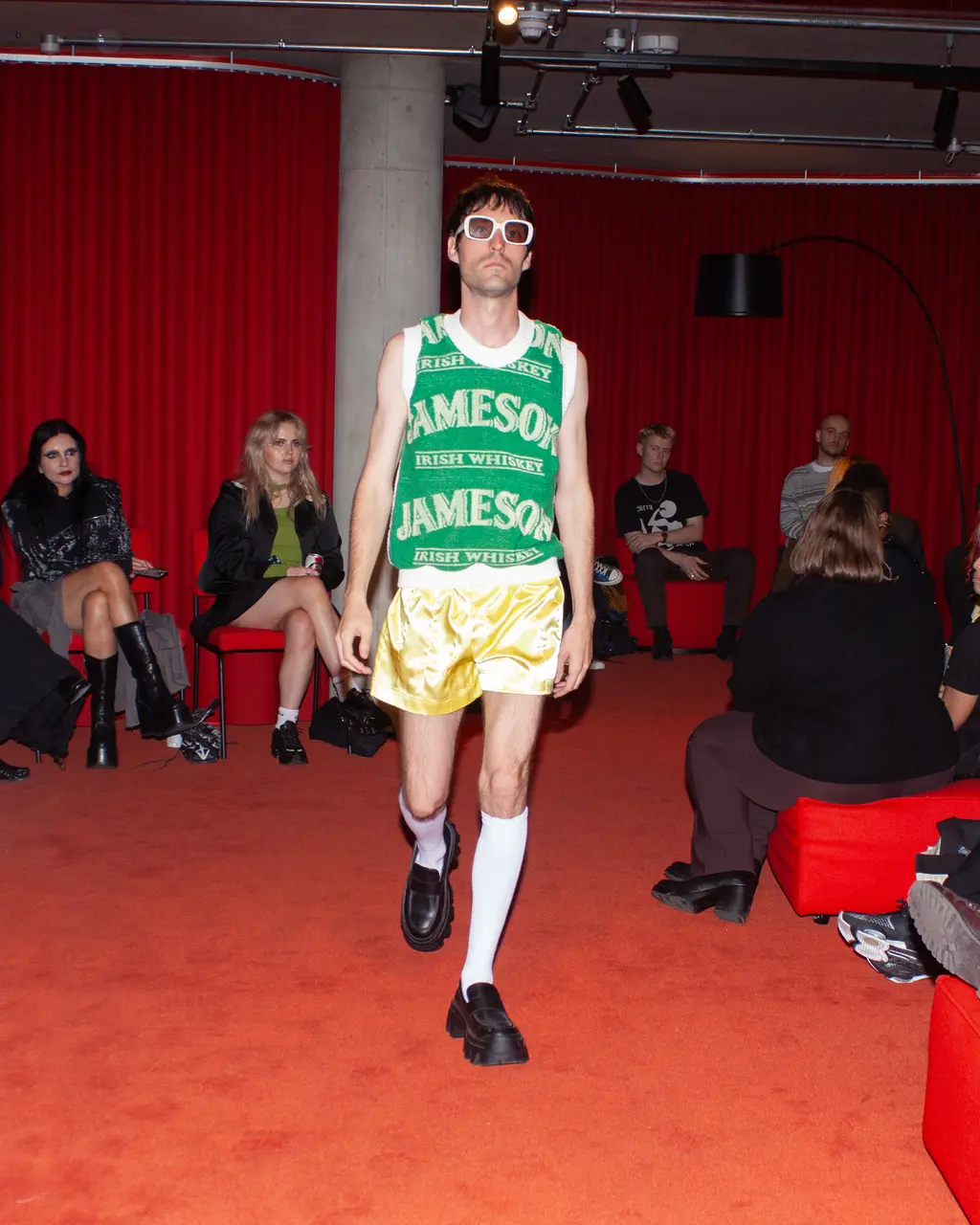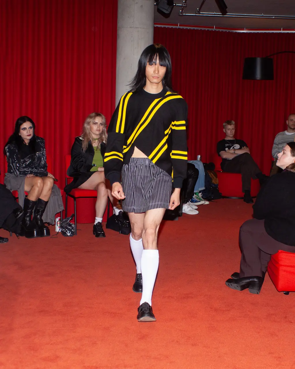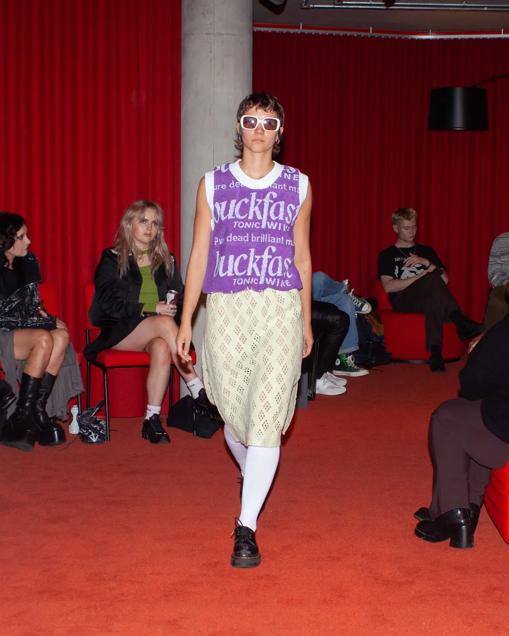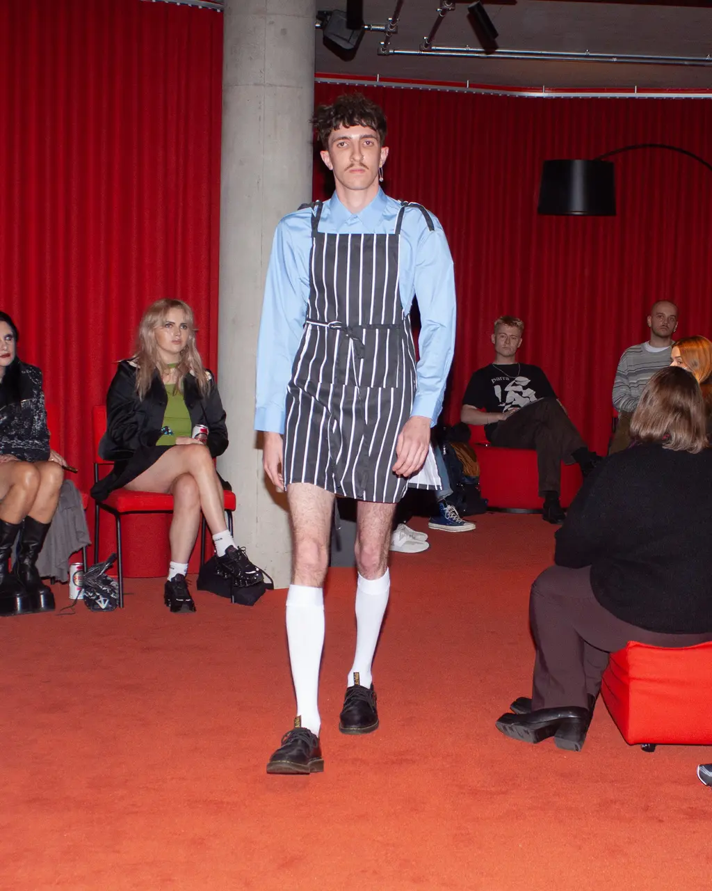 Young Welsh designer Adam Jones was inspired by “simpler times in working class Britain’s past” for his latest collection. With pieces ranging from wonky rugby stripe sweatshirts and layered string vests, to prim-and-proper pinafores and beer mat-print jumpers, the collection is a nostalgic ode to the classic British characters we all grew up around: “the village priest who also referees matches on Saturday, the local amateur jockey who wears his stripes even to get a pint of milk from the corner shop, and the lads on a stag do tormenting the town.”
